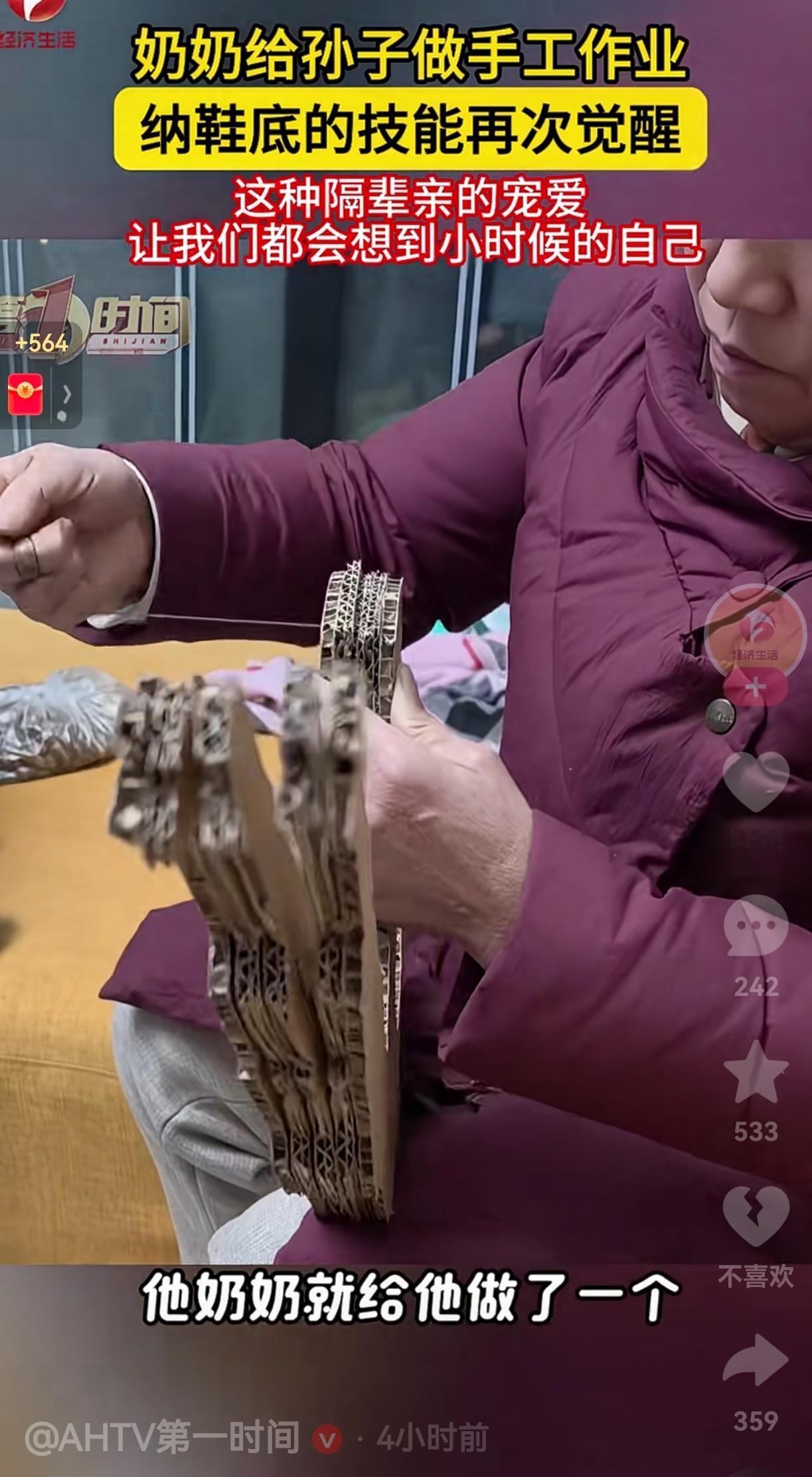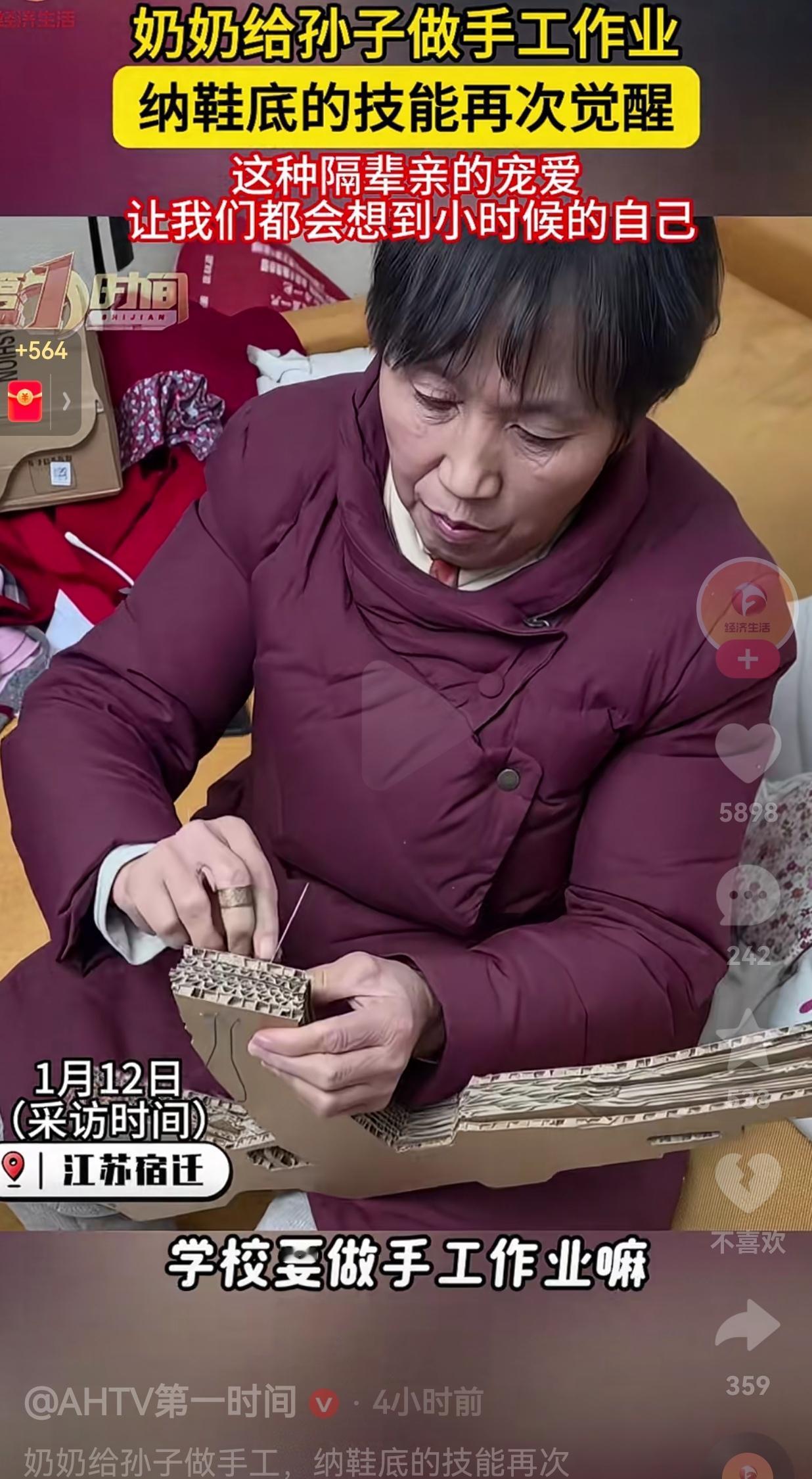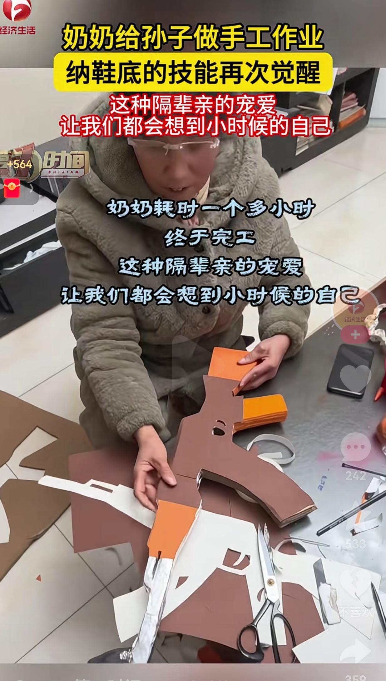 不明白这样的手工作业有啥意义呢?近日,江苏宿迁,一学校给学生们布置了手工作业,孩子们不会做,都是家长帮忙代劳。网友:一时间,我竟然想不明白,这是给家长布置的作业?还是给学生布置的作业。 据孩子的妈妈讲述,其他的小朋友有做大炮的,还有做飞机的,而孩子想要做一个手枪,奶奶询问小孙子:“你自己会不会做?” 小孙子说:“我不会做,你能给我做一把手枪吗?” 听到小孙子这么说,奶奶就开始给小孙子做手枪,一开始奶奶想用胶水,给孙子粘一个水枪。 可是,奶奶找了半天的胶水,硬是没有找到,奶奶也有点子,想到了用针线把纸箱粘连在一起,你还别说,奶奶的手还挺巧,粘的严丝合缝,看起来比用胶水粘的还结实呢? 最终,奶奶经过一个多小时的奋战,终于做成了一把手枪。 小孙子看到奶奶做好的手枪,很是开心,可是呢?这可把奶奶累坏了! 网友看到后评论说:“这样一来,手工作业的意义到底是什么?这是在培养孩子,还是折磨家长?” 还有的网友说:“这也太疼爱小孙子了,怪不得说隔辈亲呢?” 要我说,手工作业本来是为了让孩子动手、动脑,培养创造力。可实际上,很多作业难度已经超出了孩子的能力范围,最后变成家长熬夜赶工。孩子没学到什么,家长反倒是被逼成了“手工达人”。 所以说,学校在给学生布置作业的时候时,也应该多考虑孩子的年龄和能力,别让手工作业变成家长的负担。 而家长们,也要想一想,如果孩子做不了,那就和孩子一起协作千万别大人做,孩子什么都不用做。有时候多给孩子一些动手的机会,哪怕做得不完美,那也是孩子自己的作品。 如果一味的让家长代劳,孩子就失去了锻炼动手能力的机会了! 大家觉得呢?欢迎大家评论区讨论留言。