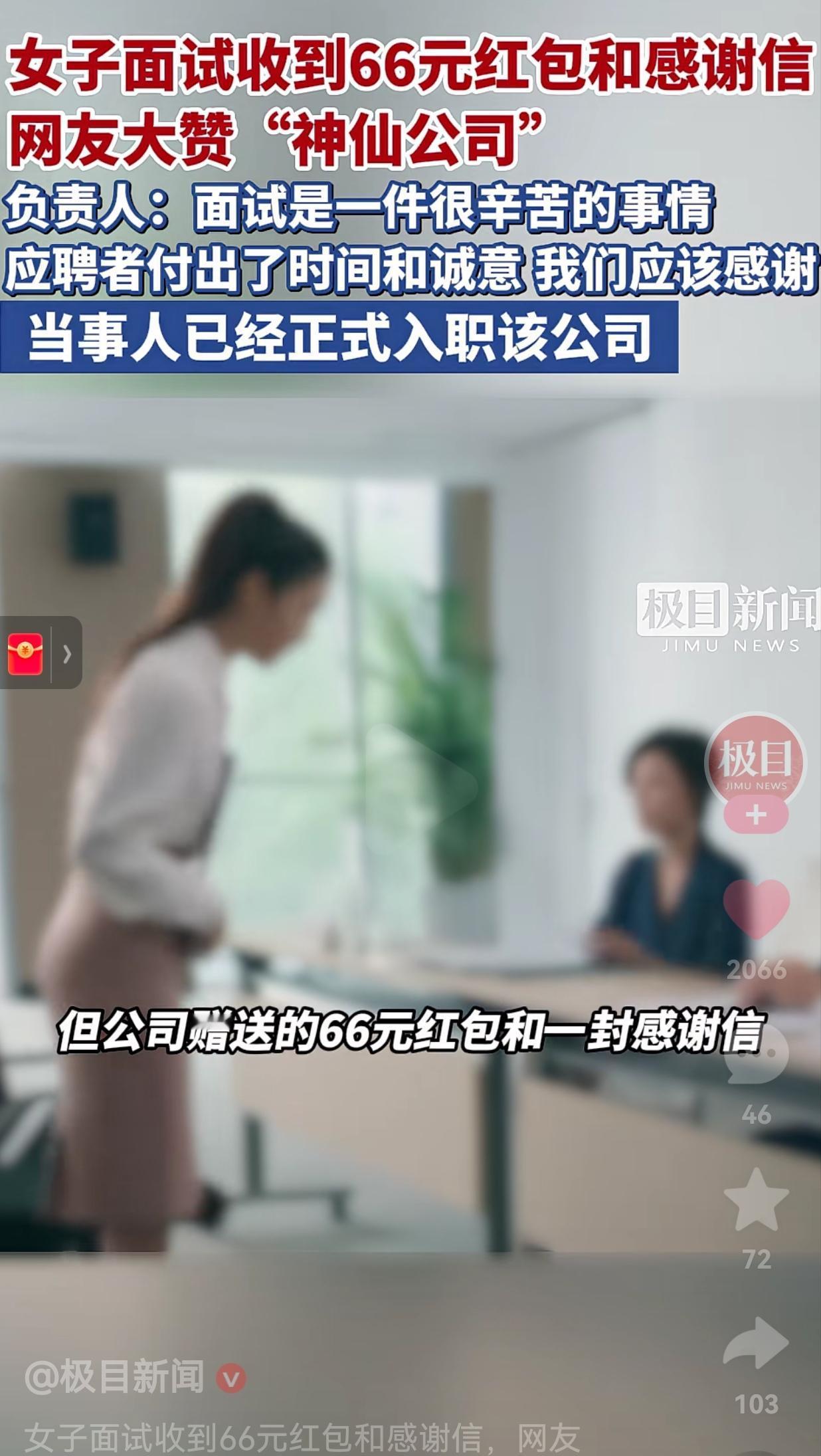 这是什么神仙公司?对求职者都这么温暖。近日,深圳一位李女分享了自己的一段求职经历,被网友直呼:“太暖心了!” 据李女士讲述,当时她面试结束后,还不知道能不能录用,公司工作人员直接递给她一个红包和一封信,她当场就愣住了。 拆开红包一看,里面有66元的现金以及一封感谢信,信里写道“随信附上小红包,作为给您的交通补助费,聊表心意,感谢您路途奔波的辛苦”。 虽然钱不多,只有66块,却让李女士心里暖烘烘的。要知道,很多求职者哪有这种待遇呀! 据了解,李女士已经正式入职了这家公司,她坦言公司的氛围超棒,同事还会手把手教新人用设备。网友们纷纷调侃:“这波操作,想不去都难吧!” 1月11日,记者联系了该公司的负责人惠先生,他表示给面试者发红包、写感谢信是去年年底推出的新举措。 其实,他们的想法很简单:“我们觉得面试是一件很辛苦的事情,无论结果如何,他们愿意付出时间和诚意来面试,我们都应该表示感谢。” 此事被李女士发到了网上,有网羡慕道:“我面了几十家公司,就连杯水都没喝过,你这不仅发红包,还写信感谢,这差距也太大了!” 还有的网友说:“这样的公司,格局一下子就打开了,活该它招人顺利!” 其实仔细想想,这件事之所以能戳中那么多人,根本不是因为那66块钱。 在求职市场里,应聘者往往处于被动的一方,我们带着自己的简历东奔西跑,拿出十二分的诚意,想要被公司录取,却常常连基本的尊重都得不到。 有的公司面试等上一小时连句抱歉都没有,有的面试完石沉大海连个拒绝的信都没有。 而这家深圳公司,只是做了最基本的“将心比心”:知道你跑一趟不容易,所以用小小的红包表达感谢。 所以说,通过这事,这也给所有的企业提了个醒:真正的“神仙公司”,从来不是靠多高的薪资堆砌,而是靠骨子里的尊重和温暖。 毕竟,打工人想要的,从来不是压榨,而是懂得尊重自己而已。