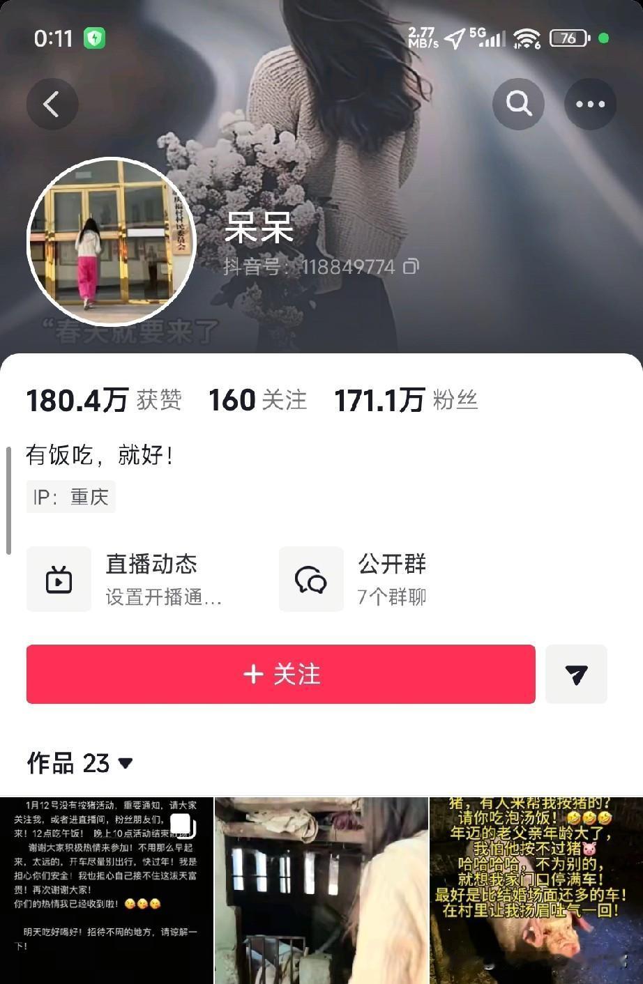呆呆一碗刨猪饭成百万网红! 重庆合川的呆呆绝对是今年春节前最意外的网红!就因一句“帮老父亲杀年猪请吃刨猪饭”的随口吆喝,不仅引来数千网友跨省扎堆现场,直播间更是被火箭、跑车礼物刷到爆,10万+在线观众把乡村杀年猪搞成了顶流直播秀。 更夸张的是,她一天涨粉超百万,粉丝数直奔200万大关,原本平平无奇的乡村博主,靠一碗杀猪饭直接实现流量逆袭,连合川文旅都赶来蹭热度,送门票、发特产把乡土年俗玩成了文旅爆款。 可这泼天的流量到底是偶然还是必然?有人说这是乡土情怀的胜利,也有人觉得不过是网友图新鲜的一时狂欢,你觉得呆呆的百万粉丝热度,能靠一碗杀猪饭留住吗?