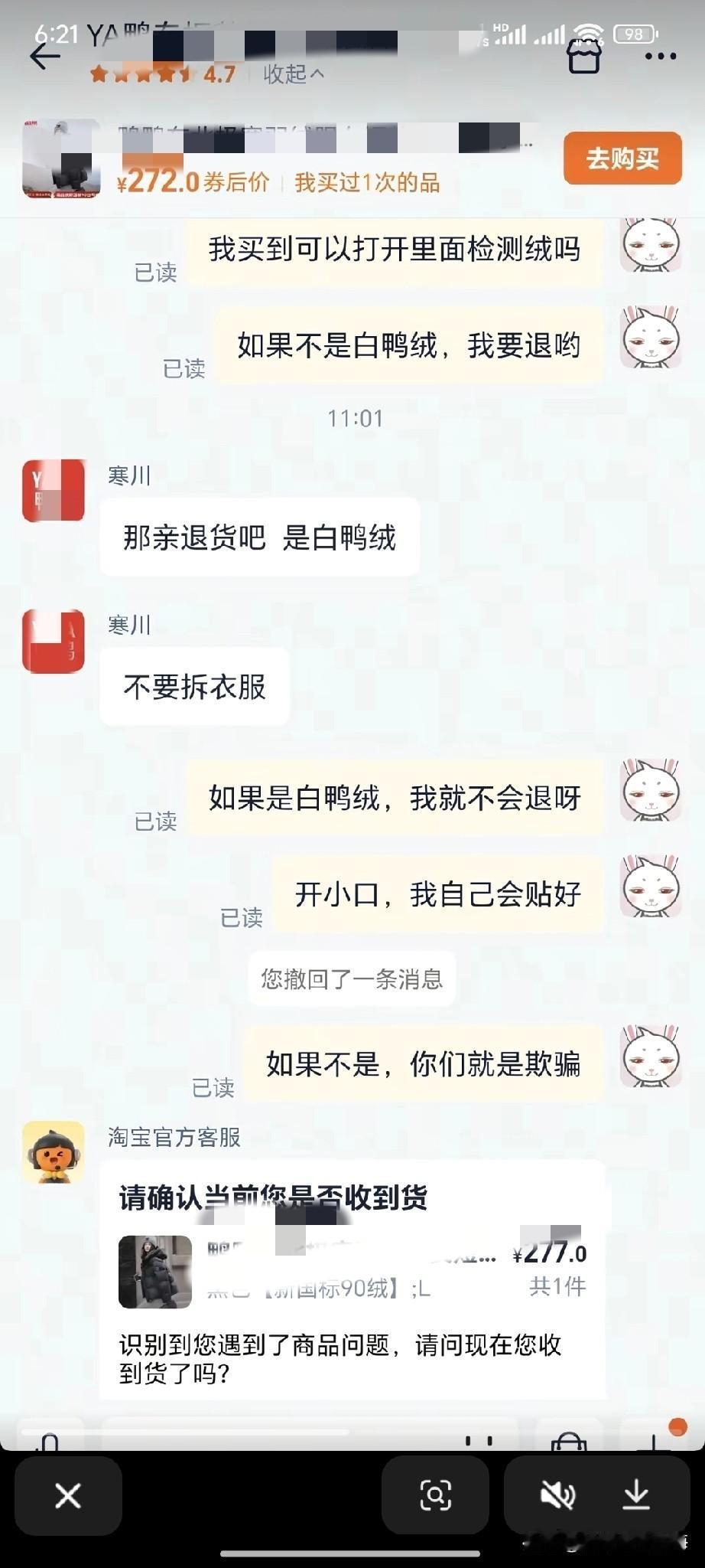 是白鸭绒的吗? 如今买件真正的羽绒服就这么难吗? 为何造假如此猖獗?只因此前没人会拆开检测,所以他们才这般大胆。 有网友在某品牌网店购买羽绒服, 与客服沟通时询问,买回来能否剪个小口检测是不是白鸭绒,若真是白鸭绒就留下,绝对不退货;若不是,能否退货。客服让其别拆,称绝对是白鸭绒。 店家在顾虑什么?看来这羽绒服真不含绒。为何敢如此欺诈消费者?只因犯罪成本太低,所以才敢肆意欺骗。