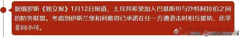 随着以色列越来越猖狂,以及伊朗的加速坠落。中东局面正在失衡——很多人不了解的是:过往大家认为的亲兄弟沙特和阿联酋就差彼此兵戎相见了!事实上海湾国家越来越缺乏安全感,土耳其害怕成为下一个被颠覆的目标——欧亚非三方交通要道,美国会不会惦记,它需要未雨绸缪。 我同意某些朋友的看法,加入沙特-巴基斯坦联盟,事实上是看中了巴基斯坦背后的中国资源。一旦发生政治或者军事动荡,还有个可以提供战略资源的大后方(除了过去众所周知的问题,事实上最近几年中国和土耳其合作其实是比较多的)。