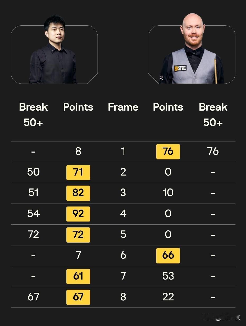 赵心童6-2战胜加里·威尔逊,晋级大师赛8强,离大满贯目标又近了一步。赵心童第二轮的对手是希金斯与霍金斯之间的胜者。今天21点,斯佳辉迎战凯伦·威尔逊,明天凌晨3点,希金斯对阵霍金斯。 刚刚结束的大师赛第4场比赛,赵心童6-2战胜加里·威尔逊。前4局,赵心童3-1领先。第5局,赵心童72-0顺利拿下,4-1领先3局。 第6局,台面局势非常混乱,红球基本扎堆右下半台,加里·威尔逊拿下本局。 第7局比较关键,加里·威尔逊拿到53分被赵心童61-53逆转。本局双方都有失误,赵心童抓住了机会。 第8局,赵心童单杆67-22获胜,总比分6-2获胜晋级。 纵观整场比赛,赵心童准度相当不错,但有几次失误也比较致命,好在加里·威尔逊失误更多,长台准度不行,防守更是多次漏球。 比较巧合的是,大师赛两天进行的4场比赛,比分都是6-2。 赵心童第二轮的对手是希金斯与霍金斯之间的胜者。 今天21点,斯佳辉出战,迎战凯伦·威尔逊,明天凌晨3点,希金斯对阵霍金斯。 斯佳辉加油!