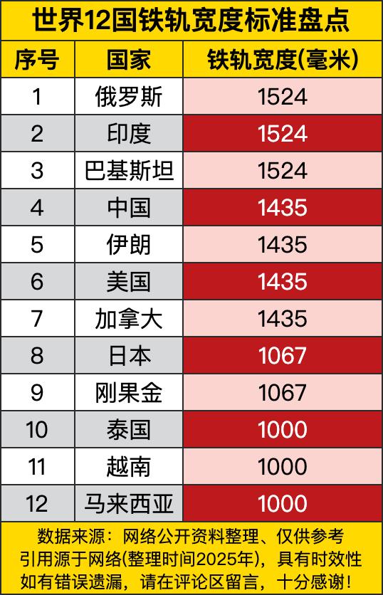 俄罗斯、印度和巴基斯坦这仨“铁三角”,铁轨宽度都是1524毫米,这是约好了似的。就像仨好朋友穿同款裤子,走在铁路的大街上,那叫一个整齐。也不知道是不是因为他们地理环境或者历史啥的原因,就都选了这么个宽度,反正看着就挺有默契。 再看看中国、伊朗、美国和加拿大,这几个国家也挺有意思,铁轨宽度都是1435毫米。这就好比是一群志同道合的伙伴,在铁路上达成了共识。1435毫米这个宽度,在国际上也算是比较常见的“主流款”了。说不定是因为贸易往来多,为了方便交流,就都采用了这个标准,真可谓是铁路界的“社交达人”组合。 接着说说日本和刚果金,它们的铁轨宽度是1067毫米。这俩就像是在铁路世界里找到了自己的小圈子。虽然是不同的国家,一个在亚洲,一个在非洲,但铁轨宽度却是一样的。不知道是不是在建设铁路的时候,参考了相似的标准或者是有着共同的技术来源呢?感觉就像是两个远隔重洋的朋友,却在某个小细节上撞了个满怀。 最后是泰国、越南和马来西亚,这三个东南亚国家的铁轨宽度都是1000毫米。嘿,这不就是东南亚铁轨界的“三剑客”嘛!在这片充满风情的土地上,它们选择了相同的铁轨宽度。也许是考虑到区域内的交通连接,方便大家互相串门呢。不过这也让我想起,生活里有时候就是这样,看似不一样的地方,说不定在某些小地方有着奇妙的相同之处呢!