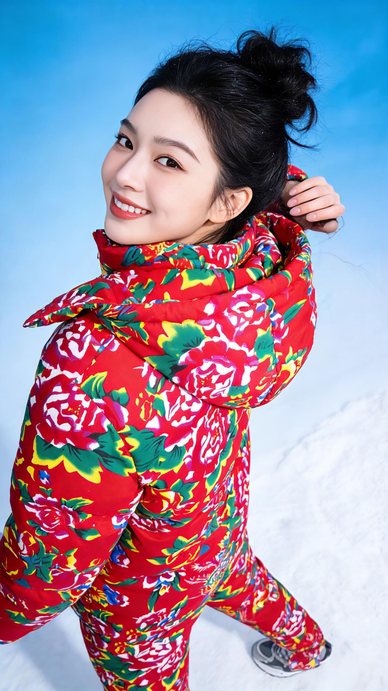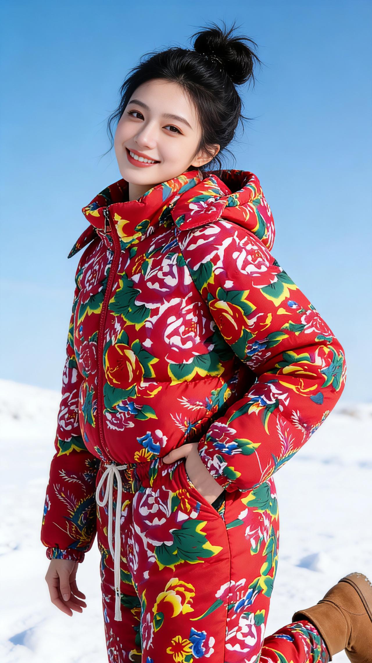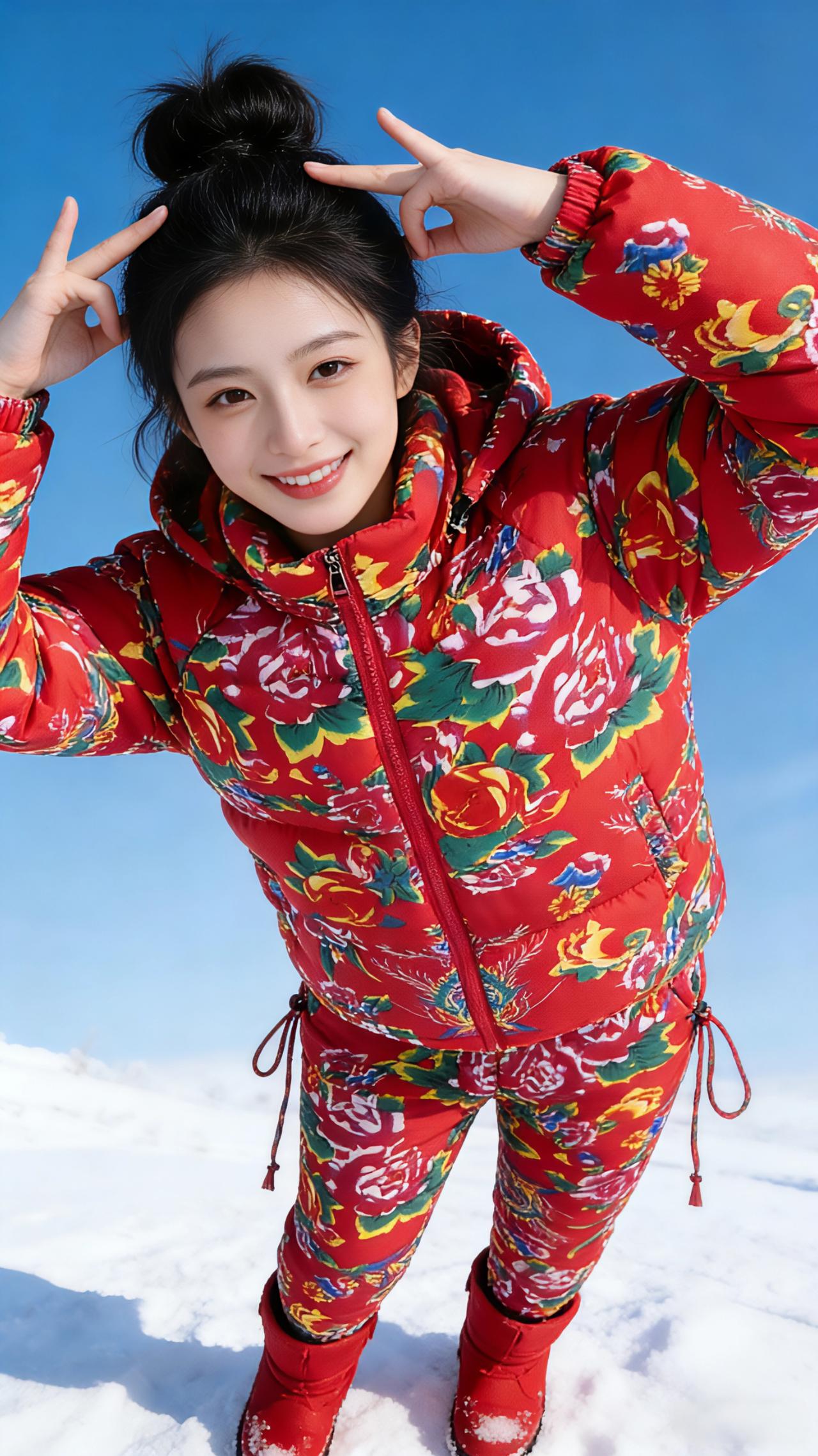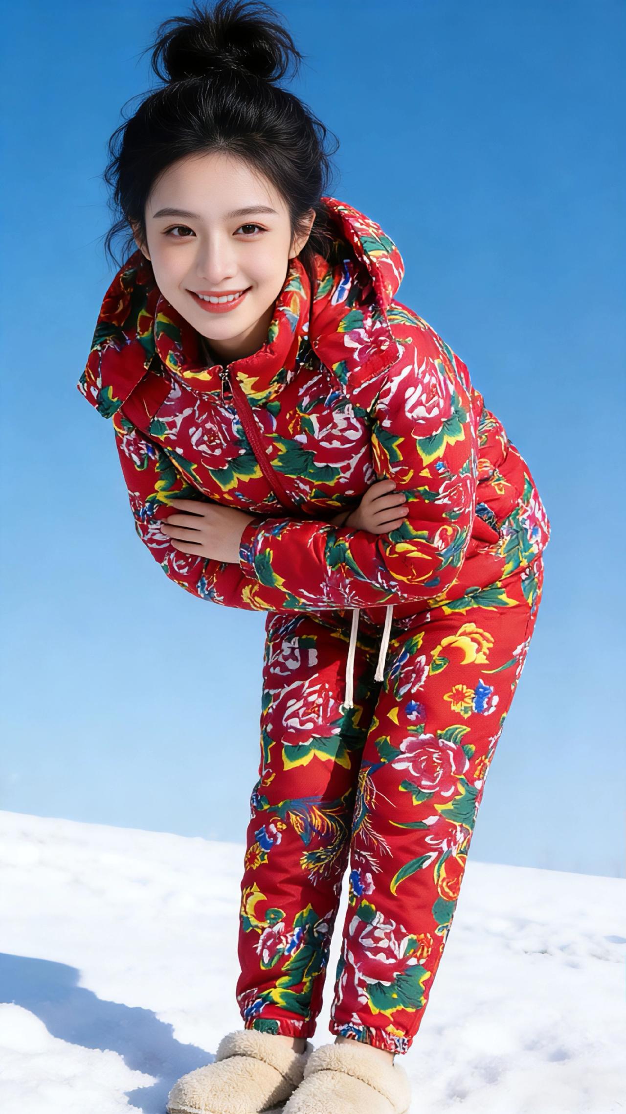 雪色里的红焰 冬日的蓝天澄澈得像一块刚擦拭过的蓝宝石,没有一丝云絮沾染,只把清冽的光洒在茫茫雪野上。 雪层蓬松地铺展在天地间,踩上去便会发出细碎的咯吱声,而那抹浓烈的东北大花袄红,却像一团跃动的焰,撞碎了雪色的清冷。女孩扎着蓬松的黑色丸子头,碎发被寒风拂得轻轻扬起,冷白皮在红袄白雪的映衬下,白得似加了一层柔光滤镜。 她弯着腰时,袄子的碎花便随着动作漾开,像雪地里突然绽开的满园牡丹;手插兜单脚轻抬的瞬间,又带着几分随性的娇俏,红裤的花纹在雪面划出灵动的弧线。比出兔耳的模样最是明媚,唇角弯起的笑意裹着冬日的甜,连指尖的弧度都透着对这片雪的欢喜。侧身轻拢发梢时,袄子的帽檐斜斜搭在肩头,红与绿的纹样缠缠绕绕,是东北独有的热烈与温柔。最后她张开双臂,一脚轻踮踏碎雪沫,那身花袄便成了雪天里最鲜活的风景,把冬日的寒,都揉成了暖洋洋的甜。 风掠过雪地,卷着她的笑声飘远,原来最动人的冬日,从不是一片素白,而是有人把人间的热闹与鲜活,穿在了身上,绽放在雪色里。 要不要我再为你写一篇更简约的短散文,适合搭配图片作为社交媒体配文?民族服装 大花袄花棉裤 民族特色服装