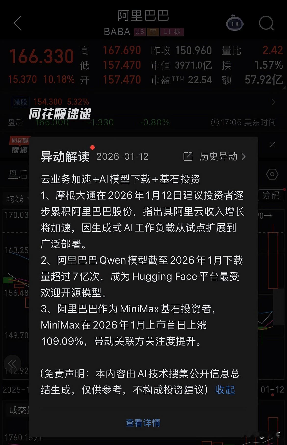 阿里巴巴美股大涨10%,又是关于AI的故事。 阿里巴巴的股票在经历190美元之后一路下跌,跌了半年多时间。 阿里的涨跌逻辑很清晰: 涨,是因为AI故事是宏大叙事; 跌,因为传统电商业务的巨大投入稀释利润。 目前阿里巴巴美股的价格是166美元/股,H股的价格为154港元/股,按照价格同步来看,今日港股阿里巴巴也要再次大涨8%左右。 不过,会是这样简单的算术吗?