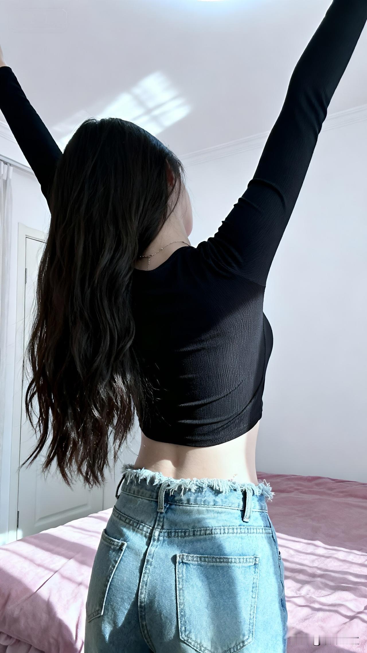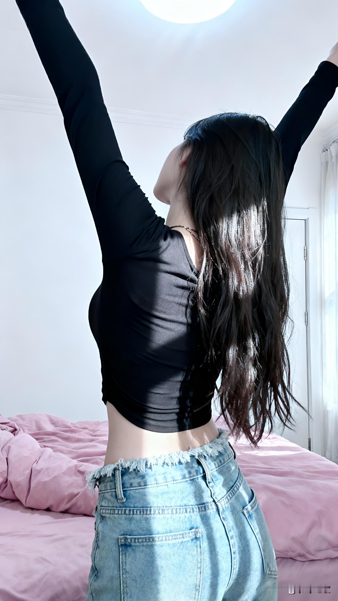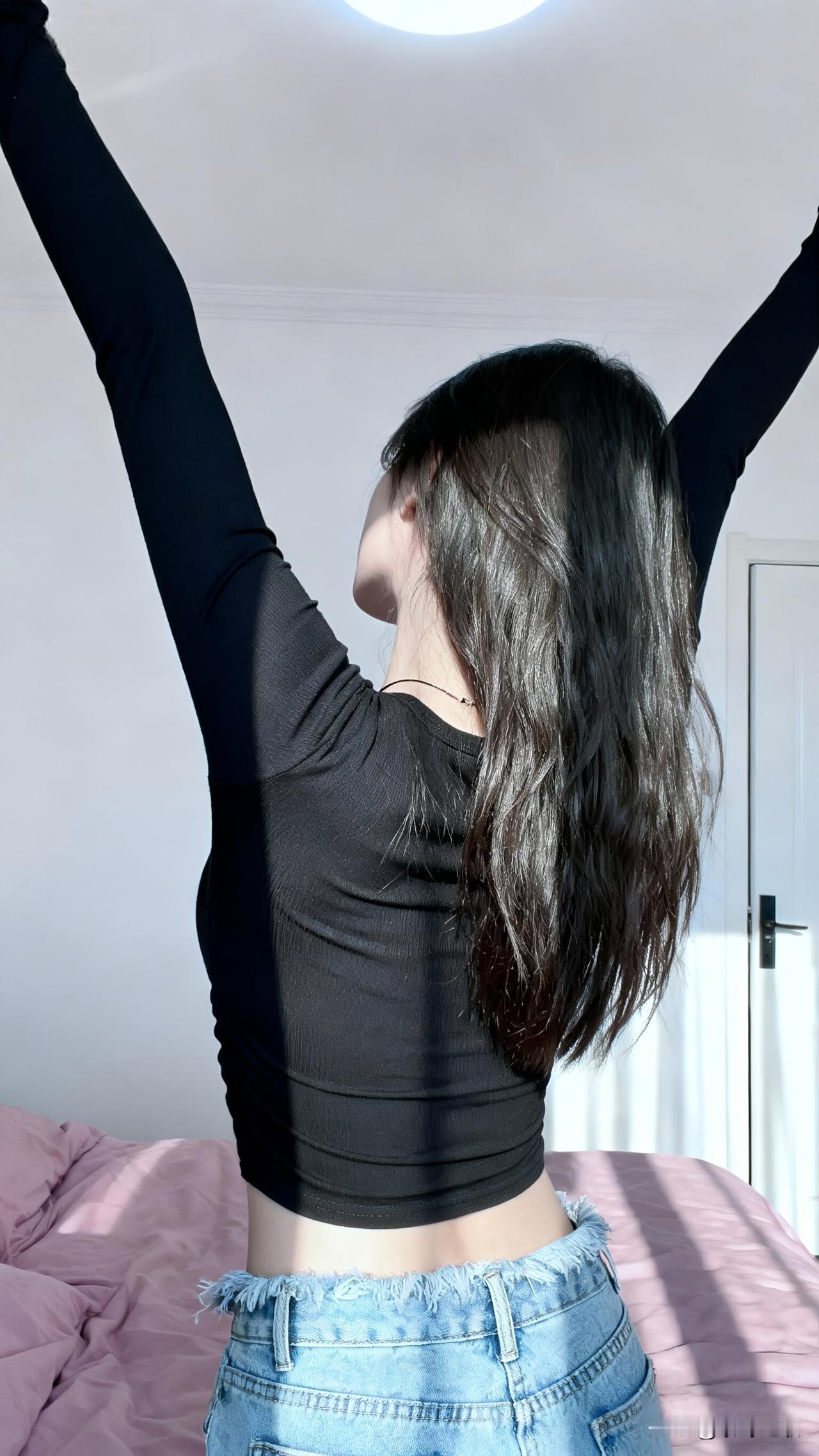 1.脊柱与背部线条 背对镜头时,背部保持自然挺直,没有含胸、驼背或脊柱侧弯的迹象;双臂向上伸展的动作进一步拉伸了背部肌肉,凸显出流畅的脊柱曲线(从颈部到腰部的线条连贯,无明显弯曲),显示出良好的核心控制能力。 2.腰腹与肢体紧致度 黑色短款上衣露出的腰腹区域线条清晰,没有多余赘肉,说明腰腹肌肉紧致(可能有规律运动习惯);双臂自然伸展时,手臂线条流畅,无明显松弛,整体肢体状态轻盈。 3.姿势与舒展度 双臂高举过头顶的动作幅度较大,肩膀完全展开(未耸肩或内扣),颈部自然伸直(从发际线到肩部的线条平顺),显示出身体柔韧性较好;这种“打开”的姿势也传递出放松、自信的状态,无僵硬或拘谨感。 4.比例协调性 短款上衣+高腰牛仔裤的搭配强化了腰臀比,下半身腿部线条(从牛仔裤的轮廓推测)修长,整体身材比例匀称,体态视觉上更显高挑。 总结 TA的体态属于“健康紧致型”——既有运动带来的肌肉线条感,又保持了自然的舒展度,无明显不良体态(如圆肩、骨盆前倾等),整体给人“活力、挺拔”的印象,大概率平时有注意体态管理(如健身、瑜伽或日常姿势调整)。
