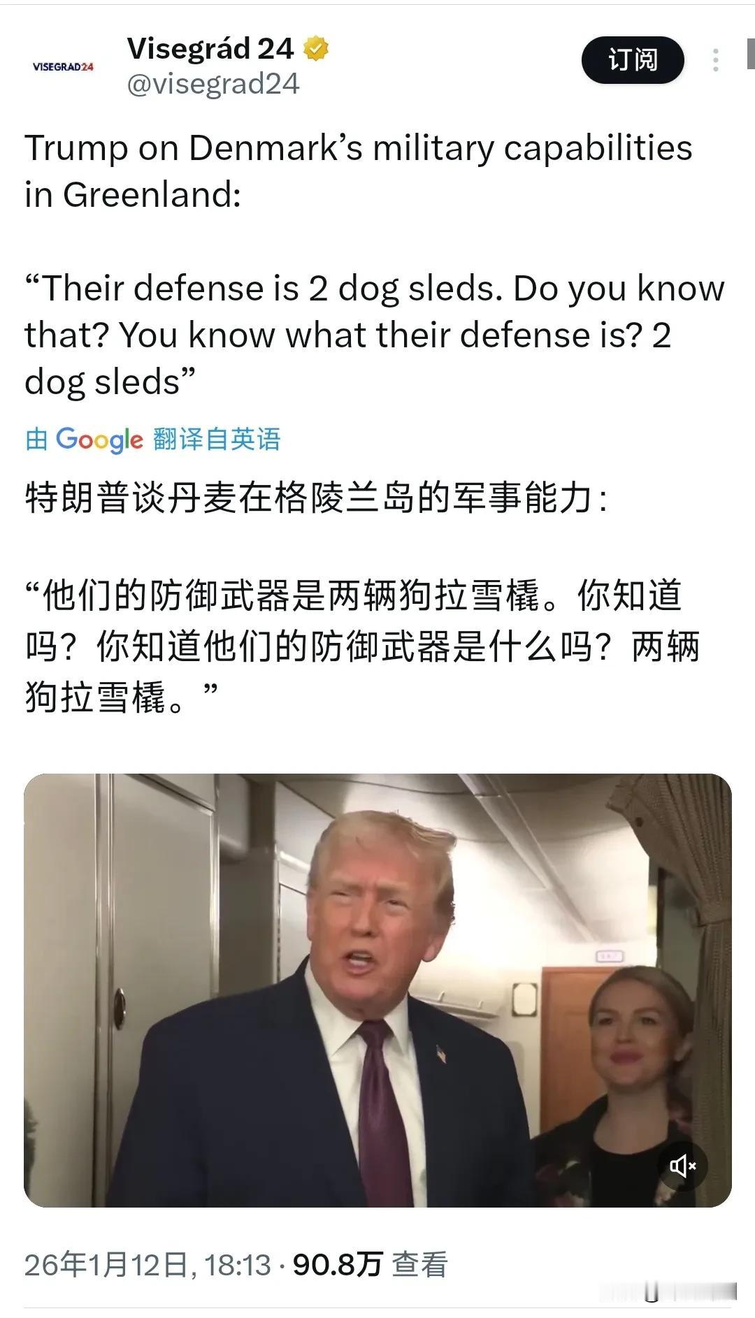 特朗普昨晚(北京时间1月12日晚)在空军一号上谈到了丹麦在格陵兰岛的军事能力:“他们的防御武器是两辆狗拉雪橇。你知道吗?你知道他们的防御武器是什么吗?两辆狗拉雪橇。” 评几句: 特朗普嘲讽丹麦“狗拉雪橇防格陵兰”?笑完才懂:60万亿资源的北极博弈藏不住了! 特朗普在空军一号上的一番戏谑,把格陵兰岛推上全球焦点——“他们的防御武器是两辆狗拉雪橇”,这话听着荒诞,实则是美国觊觎战略要地的“舆论铺垫”。 但事实根本不是他口中的“防务薄弱”!被嘲讽的“狗拉雪橇”,是丹麦精锐的天狼星雪橇巡逻队,2名队员+12只雪橇犬就能守护2100公里极地海岸线,在极夜、浮冰环境中机动性远超常规装备。而且丹麦早已按规划砸48亿英镑升级防务(数据援引自丹麦国防部2025年度防务白皮书),新巡逻舰、P-8反潜机、MQ-9B无人机都已列入部署计划,只是要2031年才能全部到位。 特朗普之所以故意曲解,核心是盯上了格陵兰岛的“双重宝藏”:一是占全球1/4的150万吨稀土储量(数据来自美国地质调查局北极资源勘探报告),这是芯片、新能源产业的刚需资源;二是北极航道的控制权,这条航线堪称“21世纪苏伊士运河”,商船从上海到鹿特丹走这里能少走4000海里,省时间又省运费。他一边嘲讽盟友,一边明确放话“无论以何种方式,都要得到格陵兰岛的所有权”(援引自新华社2026年1月12日对特朗普空军一号讲话的报道),甚至直言“如果影响北约,那就影响吧”,本质是用戏谑话术施压,为美国争夺战略资源、掌控地缘枢纽创造舆论优势。 更值得玩味的是,丹麦升级的防务装备不少来自美国供应商,如今却反遭买家嘲讽。这场“狗拉雪橇闹剧”,既是美国单边主义倾向的又一次暴露,也让北约内部的分歧与矛盾再次浮出水面。你觉得特朗普拿盟友防务开涮,算不算北约的最大隐患?评论区聊聊!