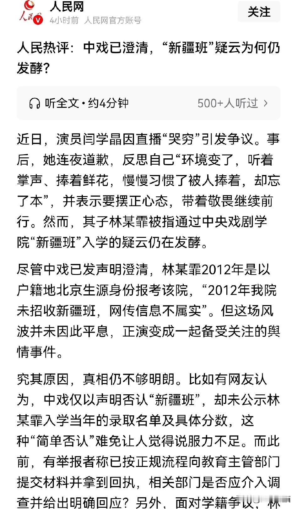 官媒都看不下去了, 对于中戏已经做出澄清了,为何"新疆班"疑云还在发酵。 人民网指出,尽管中戏已经出面辟谣,但部分疑点仍未消除。其实这个问题也很简单,中戏完全可以把林某霏当年的录取名单及具体分数公布出来,大家也就不会再猜忌了。 而看看中戏的回复,确始终在回避网友们最关心的林某霏报考资格、户籍、学籍匹配等问题,这种选择性的回复,本身就在避重就轻。 就像人民网所说的,只有引入第三方权威机构,进行彻底的调查并公之于众,才是最负责的做法。