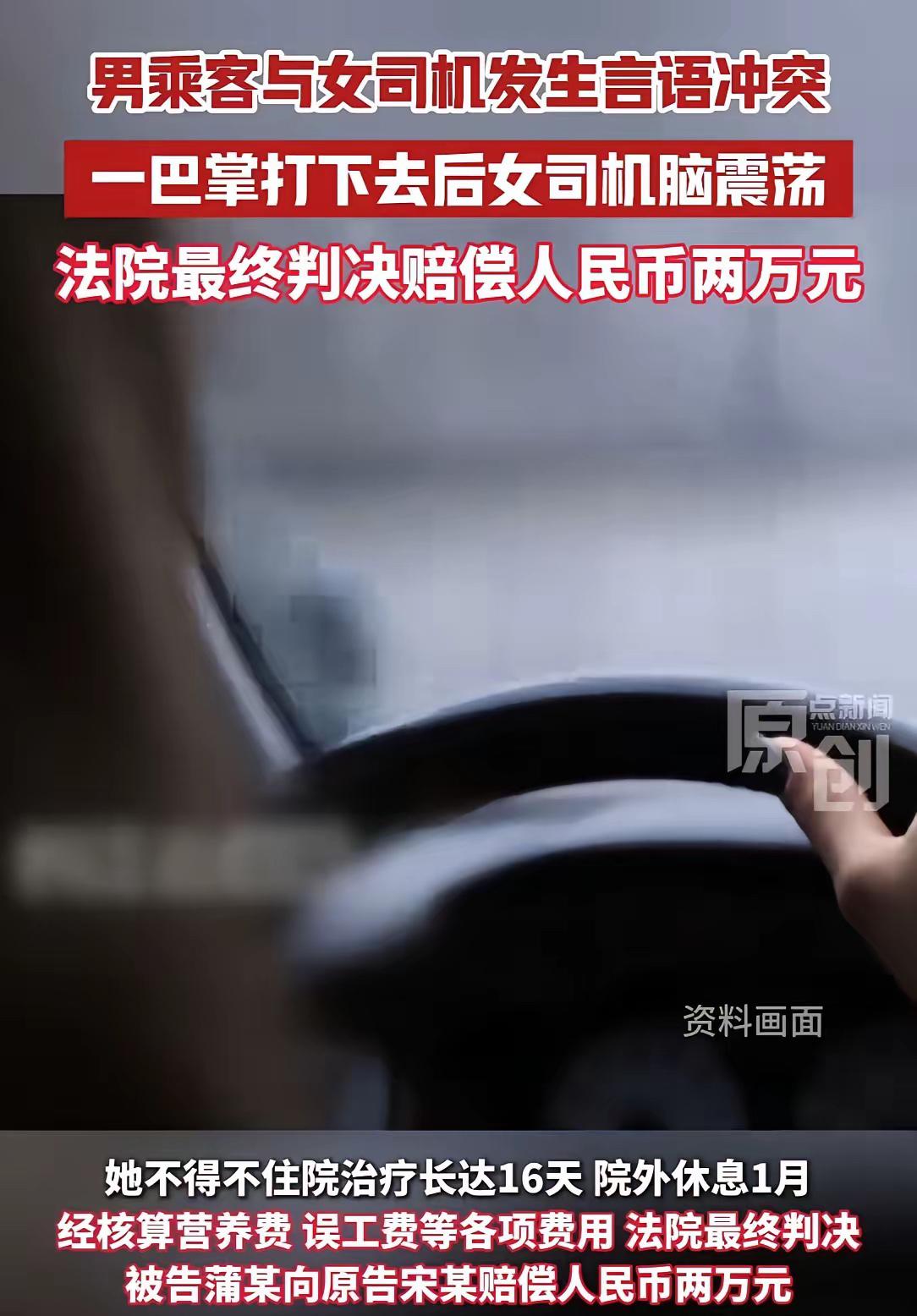 湖北恩施,一女出租车司机,在深夜搭载了两名男乘客。途中,女司机听两乘客聊的很是热闹,就顺着两人的话题搭上了话茬,没想到,惹怒了其中一名乘客,他拉住女司机头发,朝她的脸上狠狠抽了一耳光。女司机被诊断为脑震荡、多处软组织损伤,耳鸣,为此住院16天。事后,女司机找对方赔偿无果,一怒之下将其告上法庭,索赔各项损失2万余元。网友:一巴掌,从此让双方都长了记性! 事情发生在2025年6月的一个深夜,出租车司机宋某在恩施街头载到了蒲某和他的朋友。车辆行驶在夜色中,两人在后座聊得火热。性格开朗的宋某听着热闹,便顺着话题插了几句嘴,发表了自己的看法。 就是这几句无心之言,点燃了矛盾的导火索。蒲某觉得司机多管闲事,大声斥责:“我和朋友聊天,你一个女司机不好好开你的车,乱搭什么话?” 宋某觉得自己只是正常接话,两人你一言我一语,争吵逐渐升级。同行的朋友尽力相劝,但气氛已经剑拔弩张。 冲动之下,蒲某突然探身向前,一把抓住宋某的头发,朝她脸上狠狠扇了一巴掌。宋某赶紧靠边停车报警。起初她以为只是普通争执,没想到随后出现了头晕恶心、耳朵持续嗡鸣的症状。 医院诊断结果是脑震荡、多处软组织损伤和耳鸣。宋某不得不住院治疗16天,出院后还需休息一个月。作为家庭经济支柱,她无法继续开车挣钱,生活顿时陷入困境。 宋某希望蒲某能赔偿医疗费、误工费等损失,但蒲某认为宋某也有责任,并且质疑“一巴掌怎么可能造成这么严重的伤”,觉得对方可能过度治疗,不愿赔偿。多次协商无果后,宋某选择诉至恩施州利川市人民法院。 法院审理后认为,宋某的搭话行为并无过错,蒲某动手打人事实清楚,应对后果承担全部责任。医院的治疗方案具有专业性,蒲某未能提供证据证明存在过度治疗。最终,法院判决蒲某赔偿宋某各项损失共计两万元。 女性司机要注意自身防范,遇到危险情况应及时报警,乘客也需提升自身素质,文明乘车。一巴掌换来两万元赔偿和一段不光彩的记录,这个代价值得每个人深思。情绪管理是成年人的必修课,暴力从来不是解决问题的正确方式。司乘之间多一份理解尊重,才能让这样的“耳光教训”不再重演。 各位读者你们怎么看?欢迎在评论区讨论。