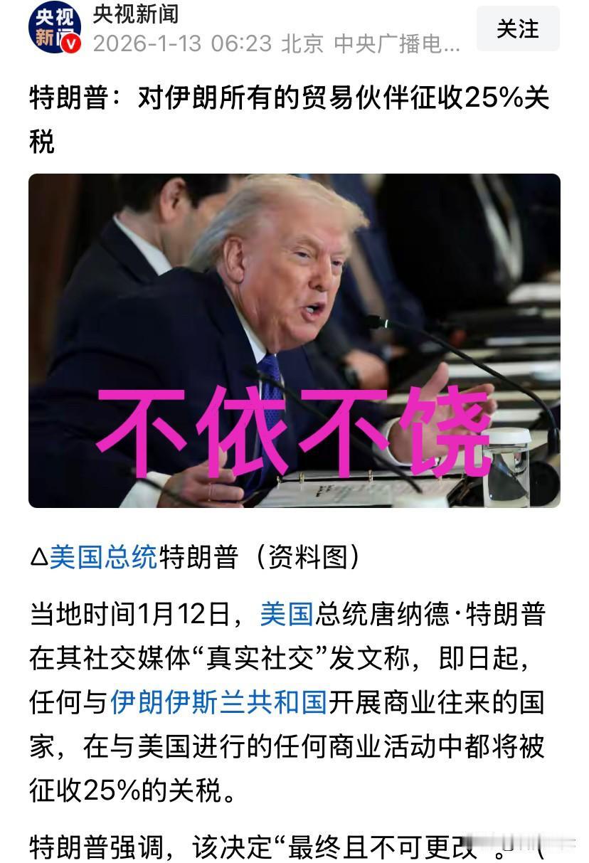 央视新闻报道:特朗普宣称对伊朗所有的贸易伙伴征收25%的关税,并强调“该决定最终且不可更改”。 特朗普不依不饶,继续对伊朗经济采取“绞杀政策”,这是眼看对伊朗颜色革命未成功,转头再另辟蹊径对伊朗展开新的围剿。既挽回了“革命未成”的颜面,又对伊朗来一个下马威。 所以说,特朗普政府,“绝非草台班子一个”,这是一个集霸权主义,强盗逻辑于一身的野蛮政府,是一个为达目的无所不用其极的“团伙”,千万不要低估霸权末期的美国,更不要对这个国家抱有任何幻想,强盗终归是强盗,特朗普依然“很特朗普”! 最后感谢各位路过的朋友,头条的大哥大姐,给小编点个赞,加个关注,相互交流!