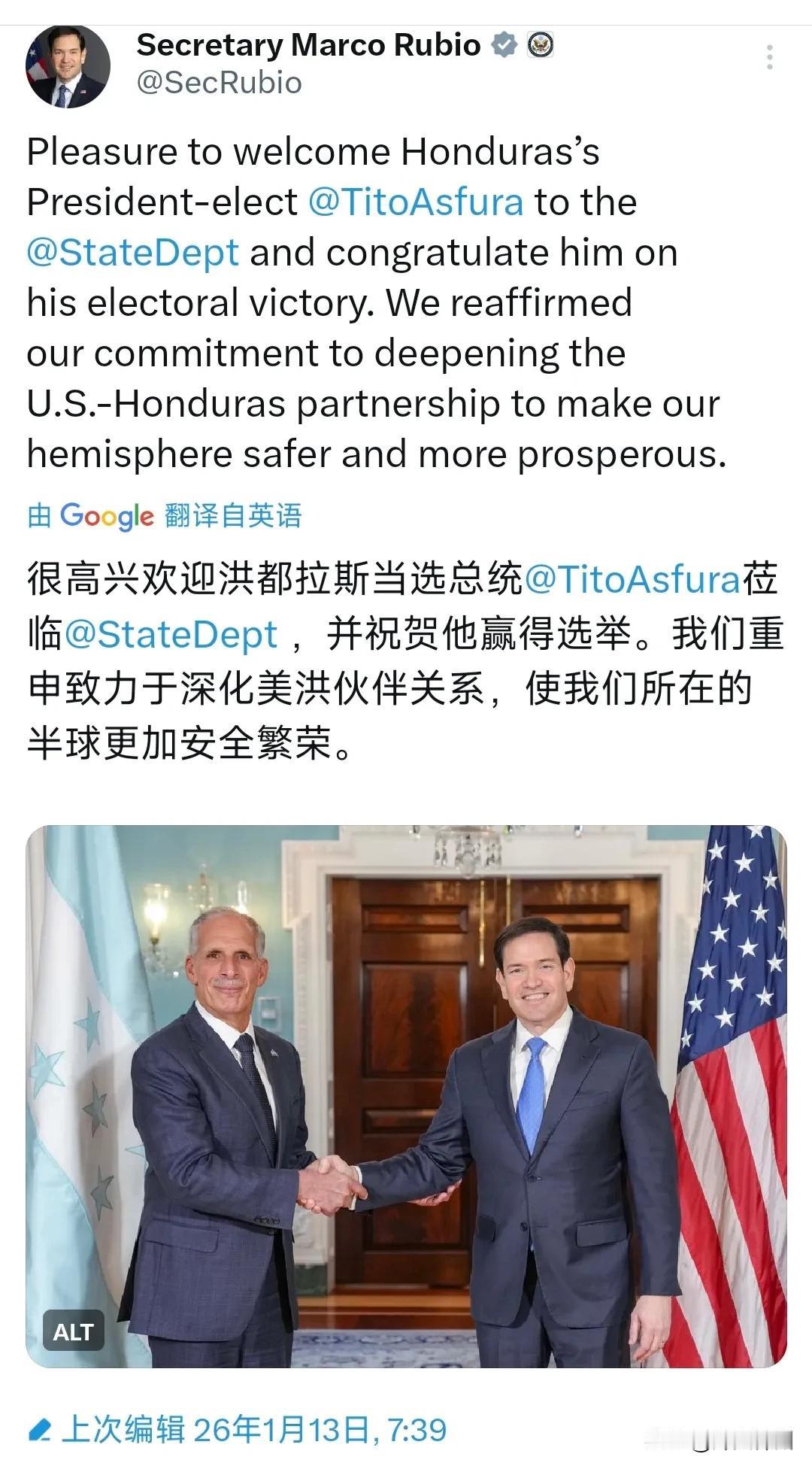 美国国务卿鲁比奥今天(北京时间1月13日)写道:“很高兴欢迎洪都拉斯当选总统阿斯富拉莅临国务院,并祝贺他赢得选举。我们重申致力于深化美洪伙伴关系,使我们所在的半球更加安全繁荣。” 评几句: 美国国务卿鲁比奥高调欢迎洪都拉斯当选总统阿斯富拉,喊着“深化伙伴关系”“共促半球繁荣”,这番外交辞令看似温情,实则是美国在拉美地区地缘博弈的精准布局。 但真相藏着三重考量!阿斯富拉以0.7%的微弱优势当选,据路透社2026年1月洪都拉斯大选跟踪报道,特朗普政府在选前曾多次公开表态支持阿斯富拉阵营,还以调整对洪经济援助政策作为筹码。而阿斯富拉胜选后公开提及,将在一个月内重新评估与多国的合作关系(信息源自洪都拉斯国家通讯社官方声明),其中就包括与中国的多项合作议题。 美国火速示好的真实意图很明确:一是扶持契合自身利益的政治力量,强化对“自家后院”的掌控力,遏制拉美地区多元合作势头;二是借阿斯富拉政府的政策转向预期,影响中洪在自贸谈判、农产品出口等领域的合作进程;三是巩固西半球的地缘影响力,对冲其他国家在拉美地区的经贸与基建布局。 这场外交互动,本质是基于利益契合点的政治协作。你觉得阿斯富拉会彻底倒向美国,还是会在中美之间玩“平衡术”?评论区聊聊!