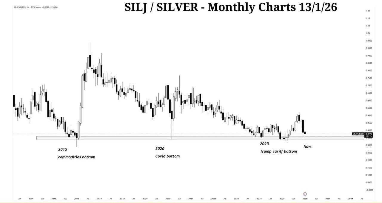 白银昨晚再度上行约 7%,价格升至 85 美元上方。更关键的是,他认为从主趋势角度看,这段上涨仍处于起步阶段。 分析师指出,近期有人急于给白银“判大顶”,但这些观点往往缺乏对图表结构与商品周期的基本理解。他认为,这类人多半错过了行情,因此更容易产生挫败与否定情绪:对他们而言,涨势“像是突然发生”,而他们并未提前布局、仓位也不在场内。 如果理解矿业周期的运作方式,他认为顺序其实非常清晰: 标的资产本身先上涨(白银) 随后生产商/成熟矿企跑赢(对价格具备杠杆效应) 最后初级矿商才会爆发——进入真正的投机阶段 而最终阶段,往往才是收益最大的阶段。 他表示自己附了两张图。 第一张:SIL 对比白银(矿商 vs 金属本身) 该分析师认为,SIL 相对白银的定价/相对强弱低估程度,已经接近以下几个典型阶段: 2015 年大宗商品底部 2020 年疫情冲击底部 2024 年 3 月白银突破阶段 以及现在 他强调,市场通常不会在“基础资产仍明显跑赢其杠杆表达(矿商端)”的结构下见顶;否则在逻辑上并不成立。原因在于生产商端对标的价格具备杠杆效应,在一段成熟行情中理应开始跑赢白银,但他认为“它们甚至还没真正启动”。 第二张:SILJ 对比白银(初级矿商 vs 金属本身) 他指出,初级矿商端同样呈现类似结构:初级矿商相对白银仍处于历史维度的显著低估区间。 该分析师举例称,白银价格大致是 2010 年的约 2 倍,但白银矿商 ETF 仍徘徊在接近 2011 年的水平。金属翻倍而矿商未动,而矿商在趋势推进中本应显著跑赢;因此他认为,这更像是教科书式的结构性机会,而不是顶部形态。 他直言,任何在此处高喊“重大顶部”的观点,都反映出对市场动态缺乏基本理解。 在其看来,这类声音往往属于典型噪音,目的在于把投资者吓出盈利仓位——通常来自踏空者,或来自无法识别重大拐点的人。他补充说:“如果他们看不懂这段行情的起势,也更难看懂真正的顶部。” 该分析师指出,外界见过他的历史判断记录;在该领域,他识别过的重大顶部次数超过多数参与者。 他的核心判断是:这里不会出现重大顶部。 他认为,这更符合牛市早期的经典心理结构。 当一段趋势刚开始时,主导叙事往往高度一致: “泡沫。” “冲顶式暴涨。” “顶部已经到了。” 他指出,这种反应往往不发生在真正的顶部,而更常出现在重大趋势的起点。 在一轮牛市的早期: 价格从长时间筑底后剧烈拉升 大多数参与者没有仓位 质疑者主导舆论与评论 每一次回撤都被称为“结束了” 每一次突破都被称为“不可持续” 他认为,你现在看到的正是上述组合。 他进一步强调,真正的重大顶部通常完全不同,其典型特征包括: 市场普遍坚信价格会继续上涨 杠杆端(矿商等)参与度极高且非常拥挤 媒体在庆祝,而不是在恐惧 后期投机与亢奋情绪明显 几乎没人再说“泡沫”,因为大家都达成一致 他认为,我们距离那种心理状态“还很远”。 他指出,当前阶段的关键词是“不信”。 而“不信”,正是重大牛市开启时最典型的心理状态。 他警告说,在行情起步时就高喊“泡沫”,往往是人们错过跨周期级别大趋势的主要原因。 他的判断是:这不是过热,而是市场认知刚刚开始形成。 教科书式的早期阶段。