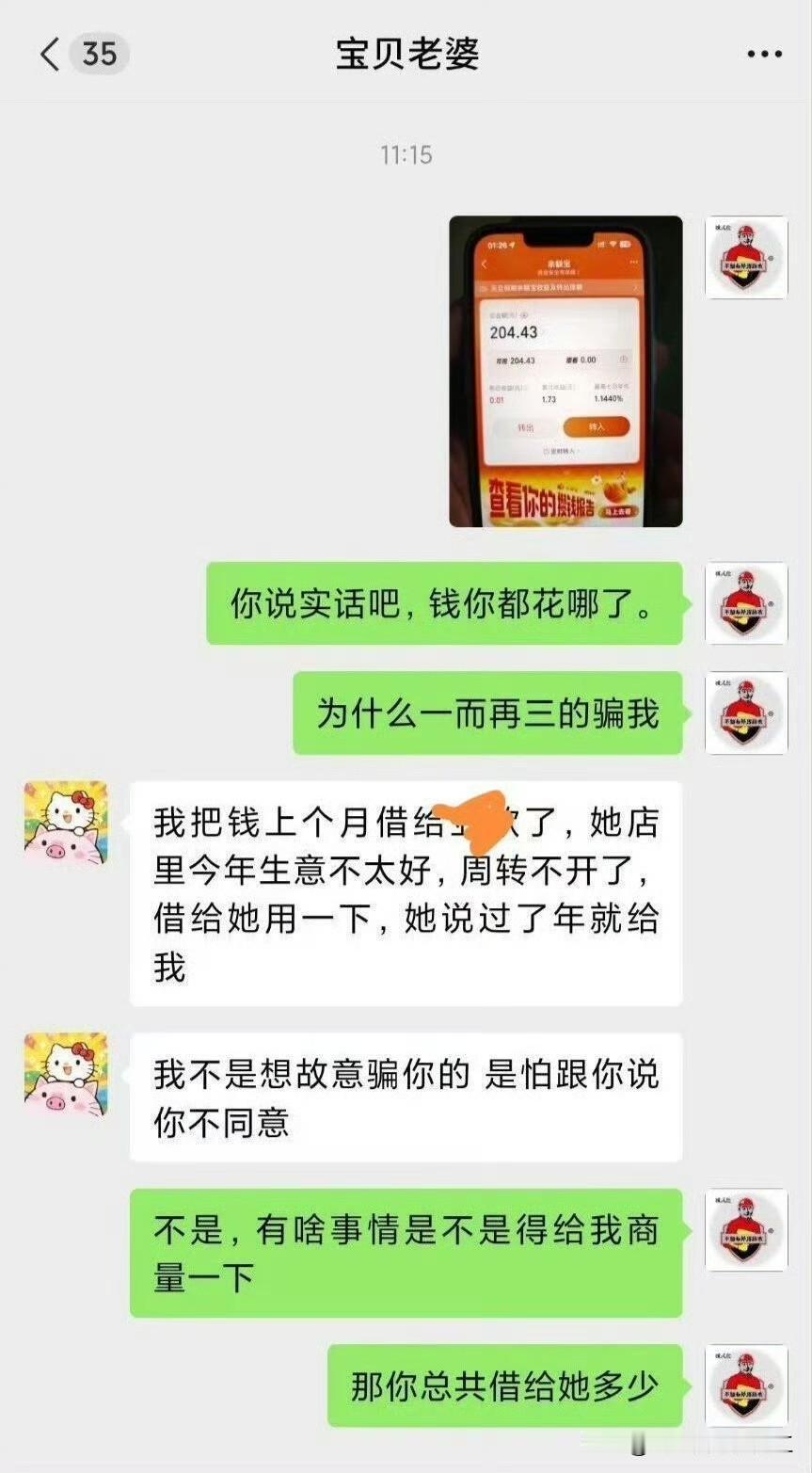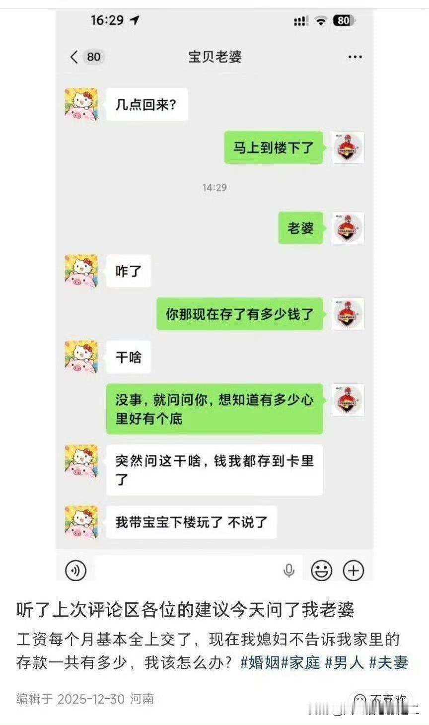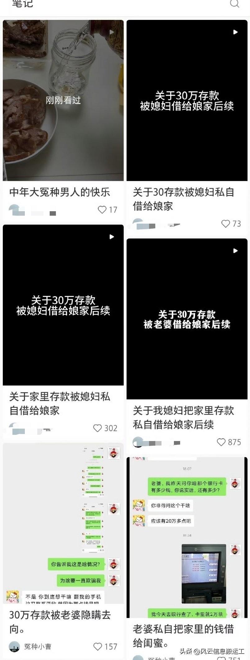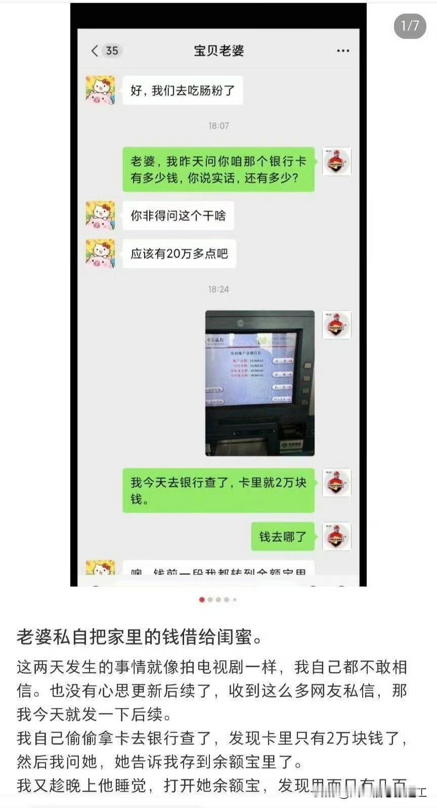之前有个男的,上交工资给老婆管,发了工资想自己留一千,被他老婆说“你留那么多干嘛”。 网友建议他问问她老婆存了多少钱,钱还在不在,现在大结局了。 在被网友提醒后,他去问老婆存了多少,他记得估计有30万这样,结果她老婆支支吾吾,他跑去查银行卡发现就剩2万。 问时候说存支付宝,支付宝一查没有。再问说借给闺蜜。 串通了闺蜜骗男方,男方叫闺蜜打欠条,闺蜜就坦白了。 继续追问钱去哪了,现在大结局了,钱借给娘家了。给她弟弟结婚当彩礼去了。 全款是拿不回来了,前面闹但没用,本来是一分不还,但因为他发网上了,女方家里有点怕了,说和平离婚,钱还10万,孩子抚养权归男方。 这男的同意了。