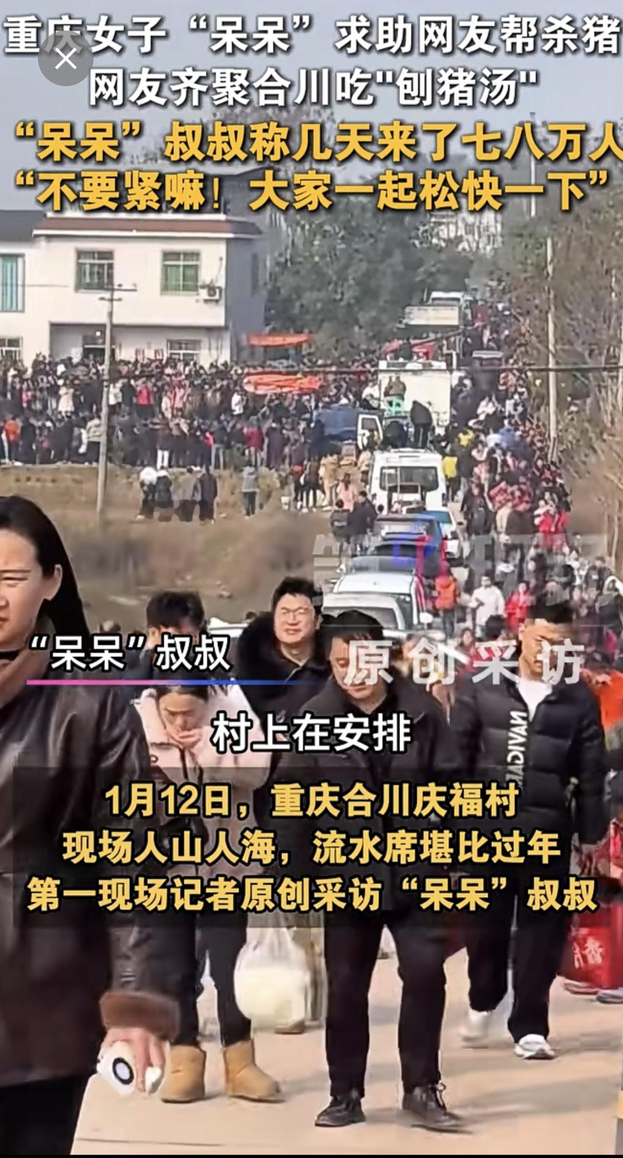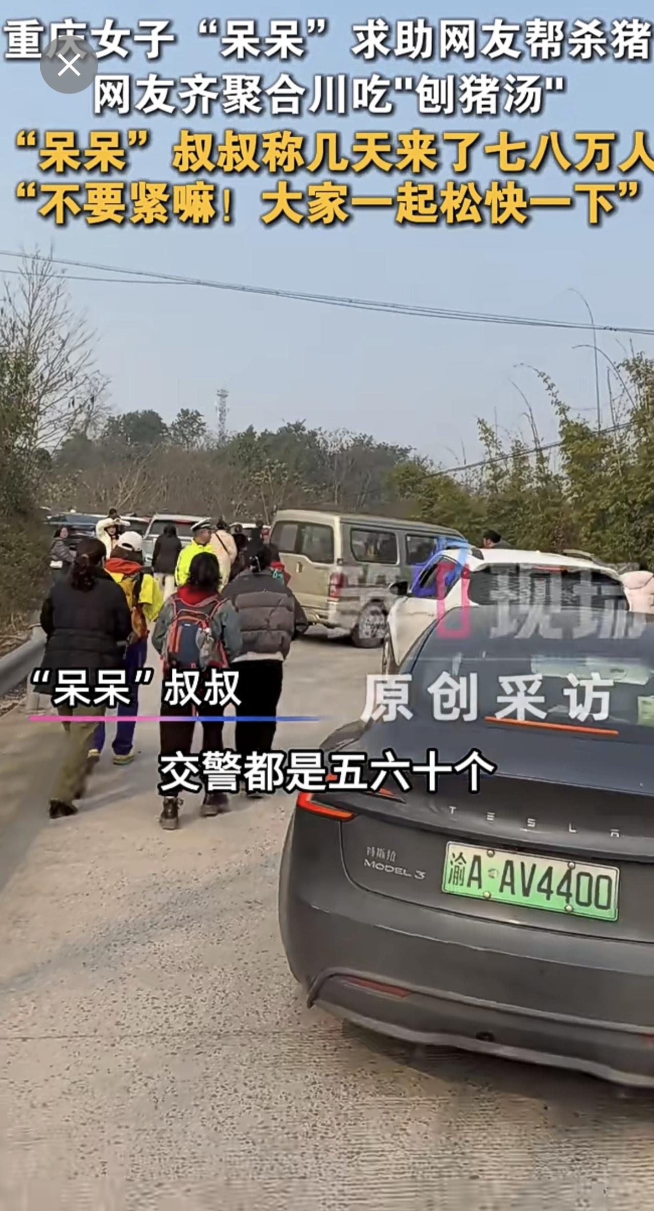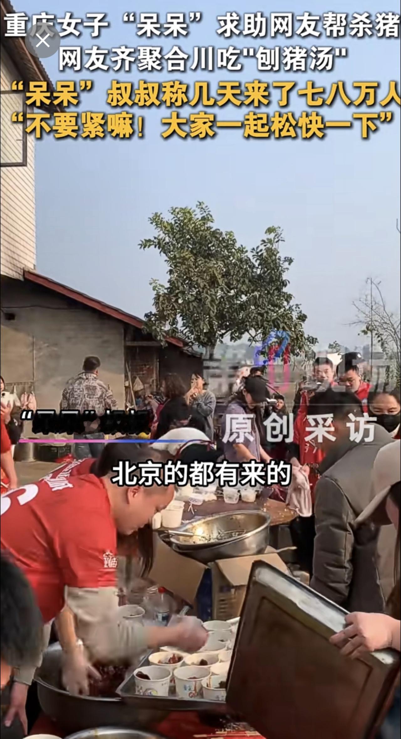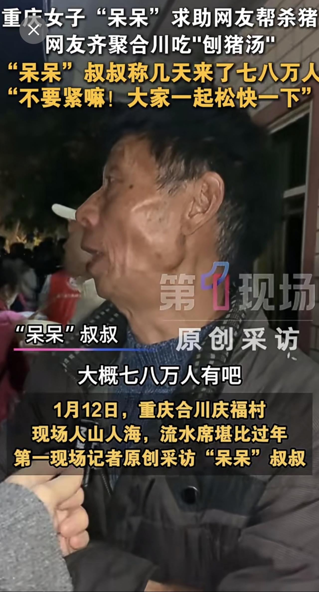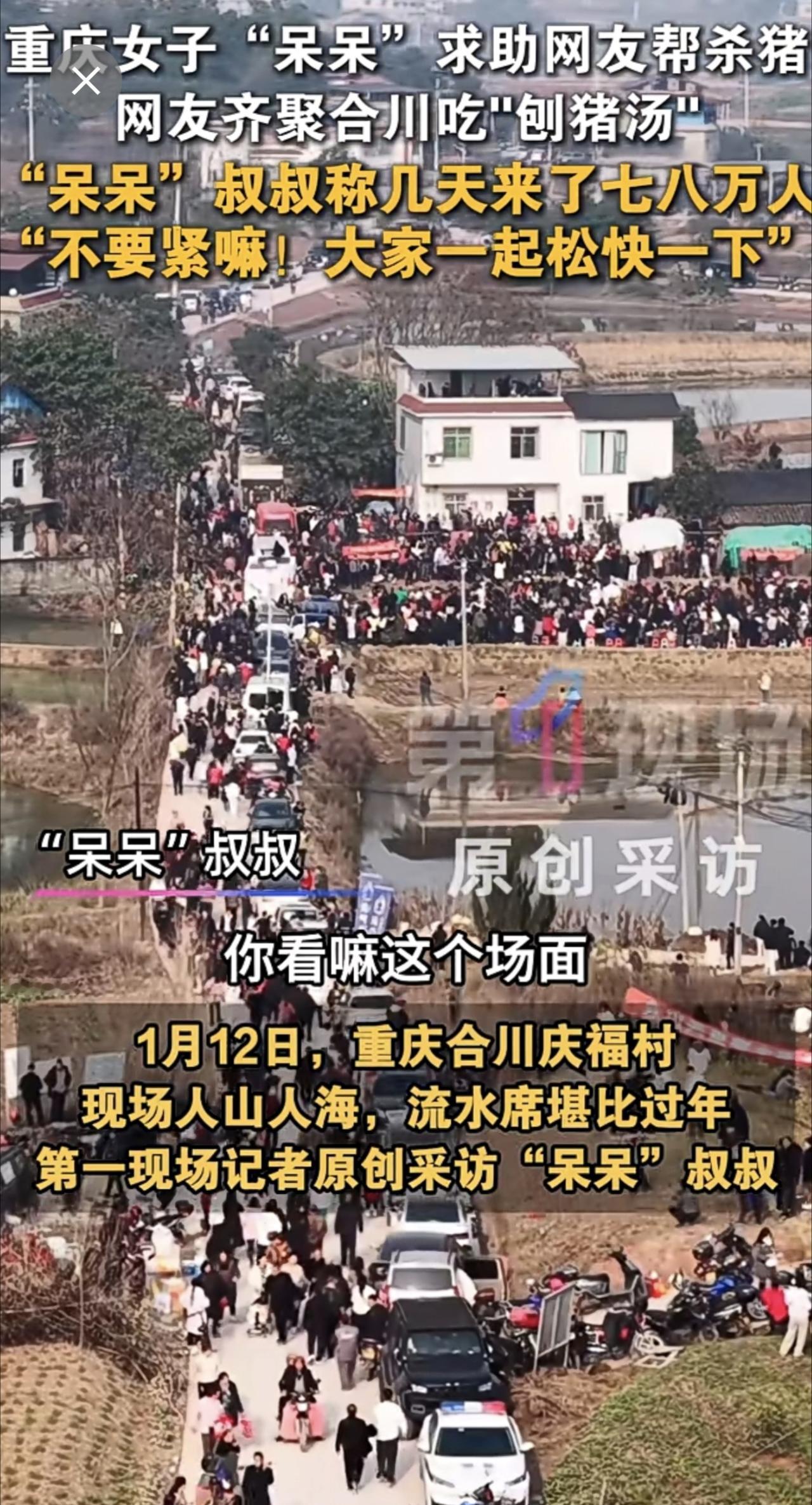 重庆女子“呆呆”求助网友帮杀猪,网友齐聚合川吃"刨猪汤"。1月12日,重庆合川,第一现场原创采访 “呆呆”叔叔:几天来了七八万人,交警都来了五六十个,村里都在安排。不要紧嘛!大家一起松快一下。呆呆 杀年猪 合川文旅