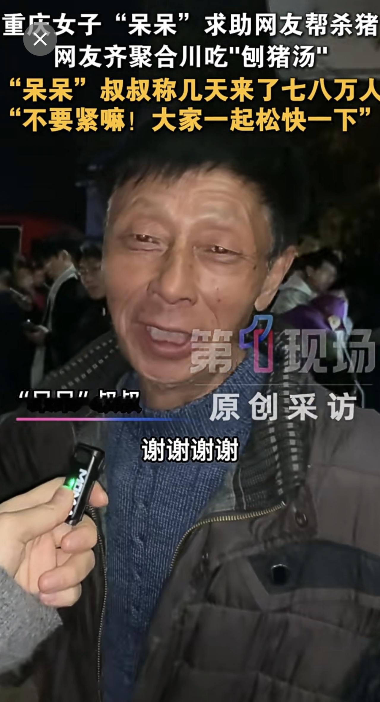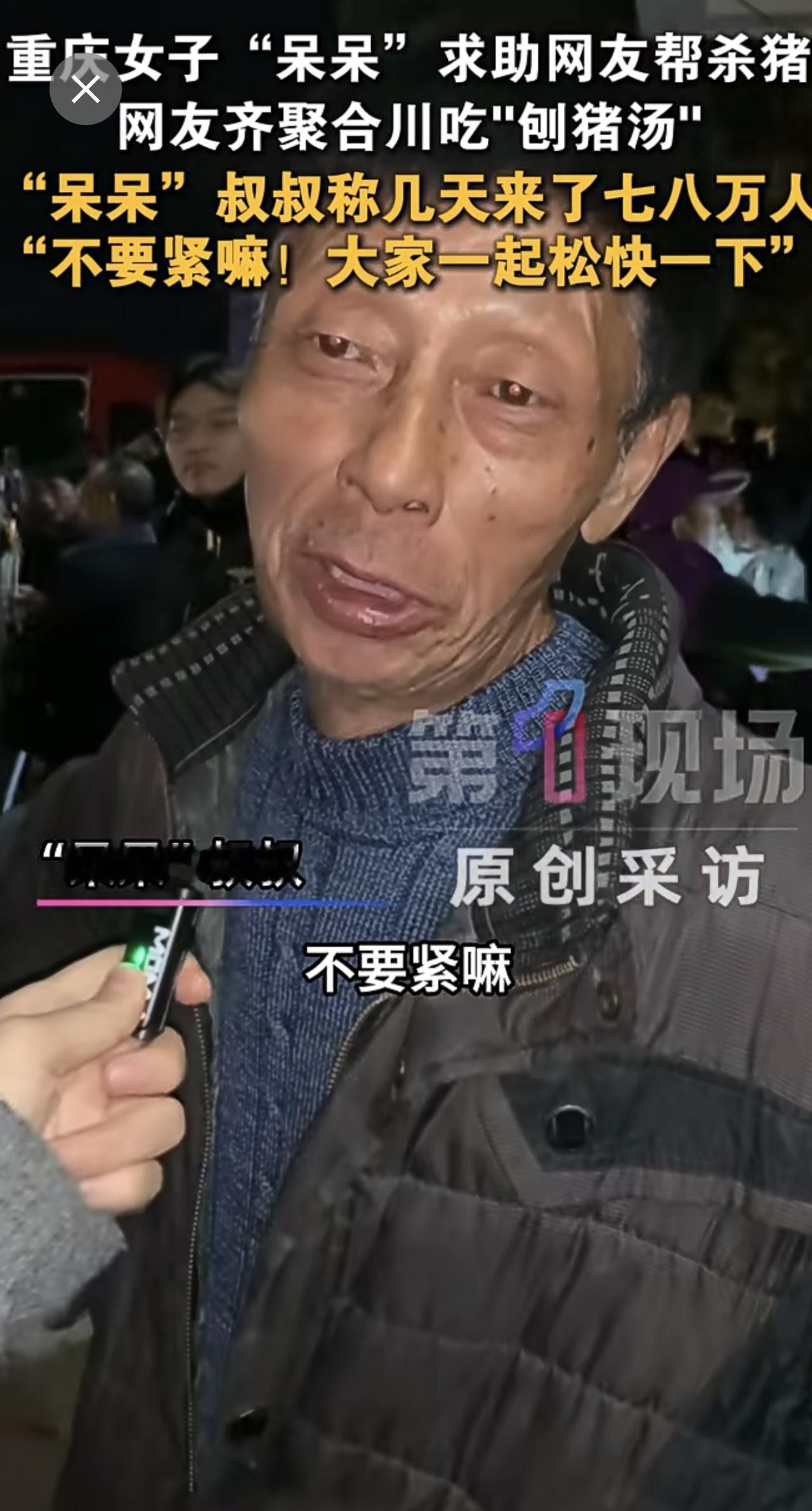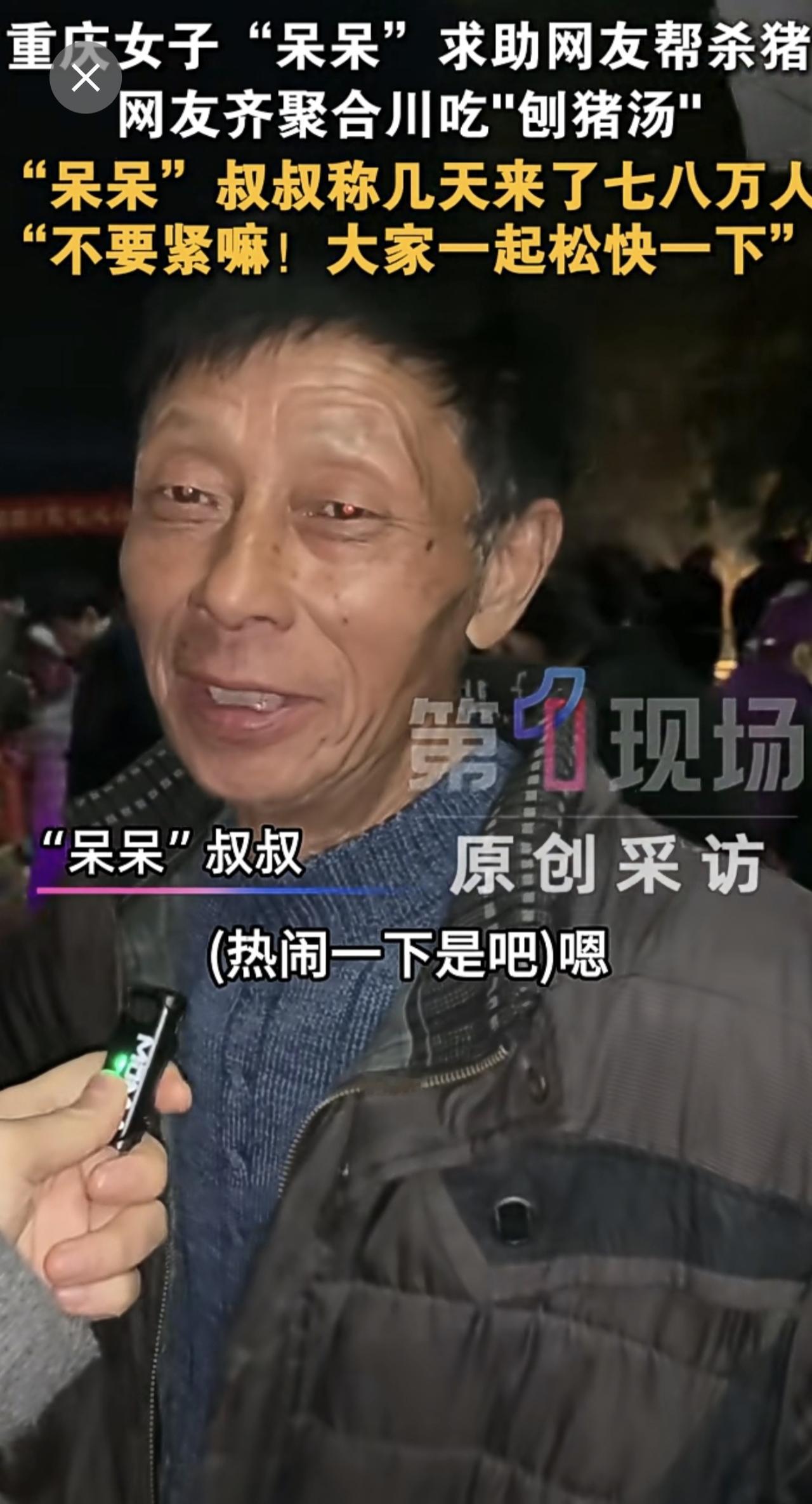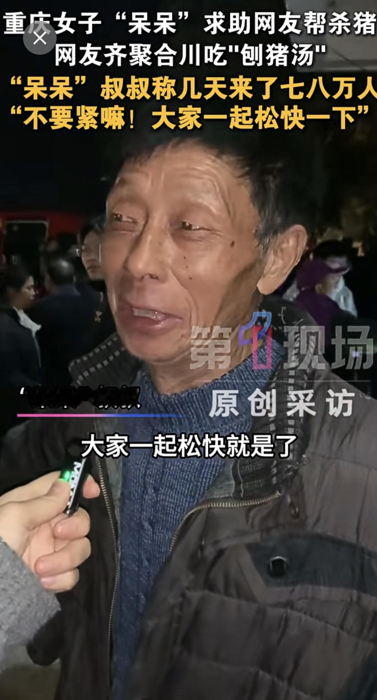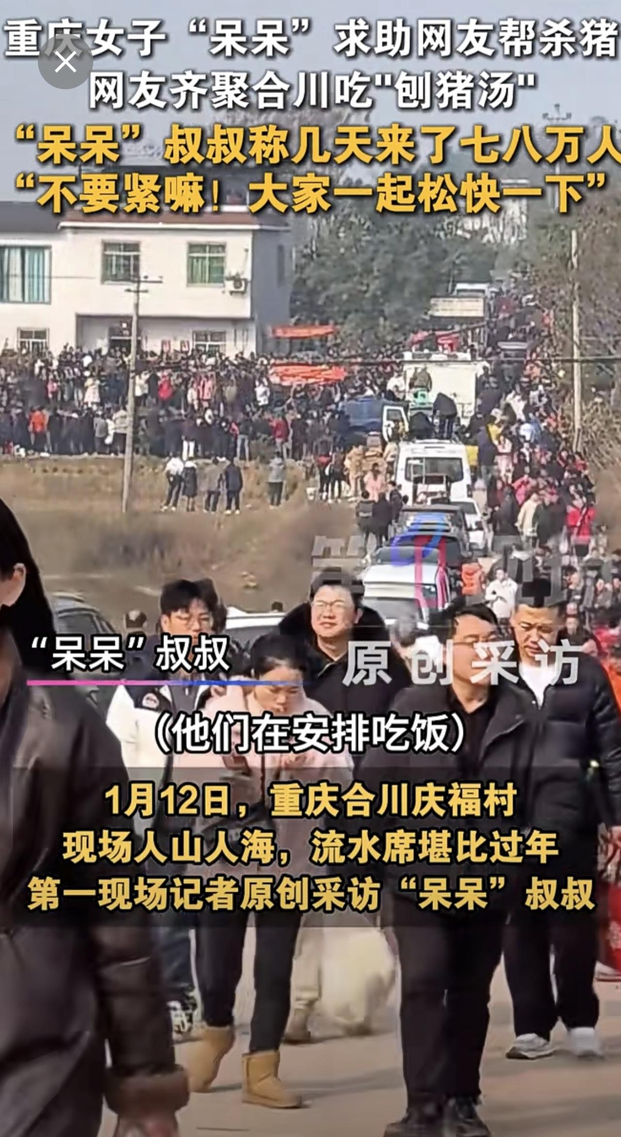重庆女子“呆呆”求助网友帮杀猪,网友齐聚合川吃"刨猪汤"。1月12日,重庆合川,第一现场原创采访 “呆呆”叔叔:几天来了七八万人,交警都来了五六十个,村里都在安排。不要紧嘛!大家一起松快一下。呆呆 杀年猪 合川文旅