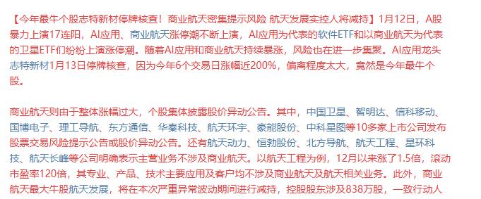 这盘面太罕见了!17连阳趋势加速,3.64万亿历史最大天量,双主线AI应用,商业航天,指数涨停,个股涨停潮。开年每天都是几千亿的增量资金入场,12月31日收官全A成交2.07万亿,A股周一成交3.64万亿,也就是仅6个交易日,A股成交就放大1.57万亿,相比12月4日1.56万亿地量,直接翻了一倍多。 量比价先,在绝对的增量资金面前,情绪比逻辑更重要,这也是商业航天,拒绝任何调整,不断加速,现在是情绪驱动,看情绪不看逻辑。 而AI应用则是踏空商业航天资金的找补,错过商业航天不愿意追高的,直接扫货AI应用。 周末清一色的AI应用,商业航天消息,周一本来是PK预期,结果直接放量5000亿,两者走出双主线并驾齐驱,商业航天是老资金主导,AI应用是新的踏空资金主导。 周一指数,主线,个股集体高潮,晚上降温的消息较多,特别是高位核心,趋势,连板高标集中提示风险。 就目前这种情绪氛围,除非出现亏钱效应,大跌,跌停,否则主力领着散户继续高举高打,而对于持仓的,马犇之前分析,出现大跌,跌停,特别是核心才是下车的信号。 但规律上,高位,趋势加速,历史天量,强烈不持续,持续不强烈,越是猛越要小心,因为情绪一旦反转,就是一波快速调整,周一高潮,下半周就是风险释放点。 市场没有新鲜事,大跌之后有大涨,大涨之后有大跌,当所有人对风险避而不谈的时候,风险就会悄然而至,牢记大涨不狂不飘敢卖,大跌不怂不孬敢买。 情绪上,就看昨晚集中提示风险票的反应。