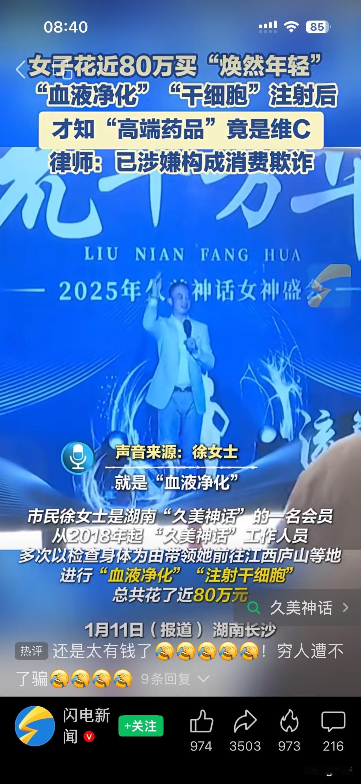 湖南长沙一女子花近80万买“血液净化”“干细胞”注射后,才知“高端药品”竟是维C。 呵呵,有这钱投资股市不好吗[呲牙][偷笑] 在你注射那会买进,大A还在3000点呢!现在都4100点啦[偷笑]