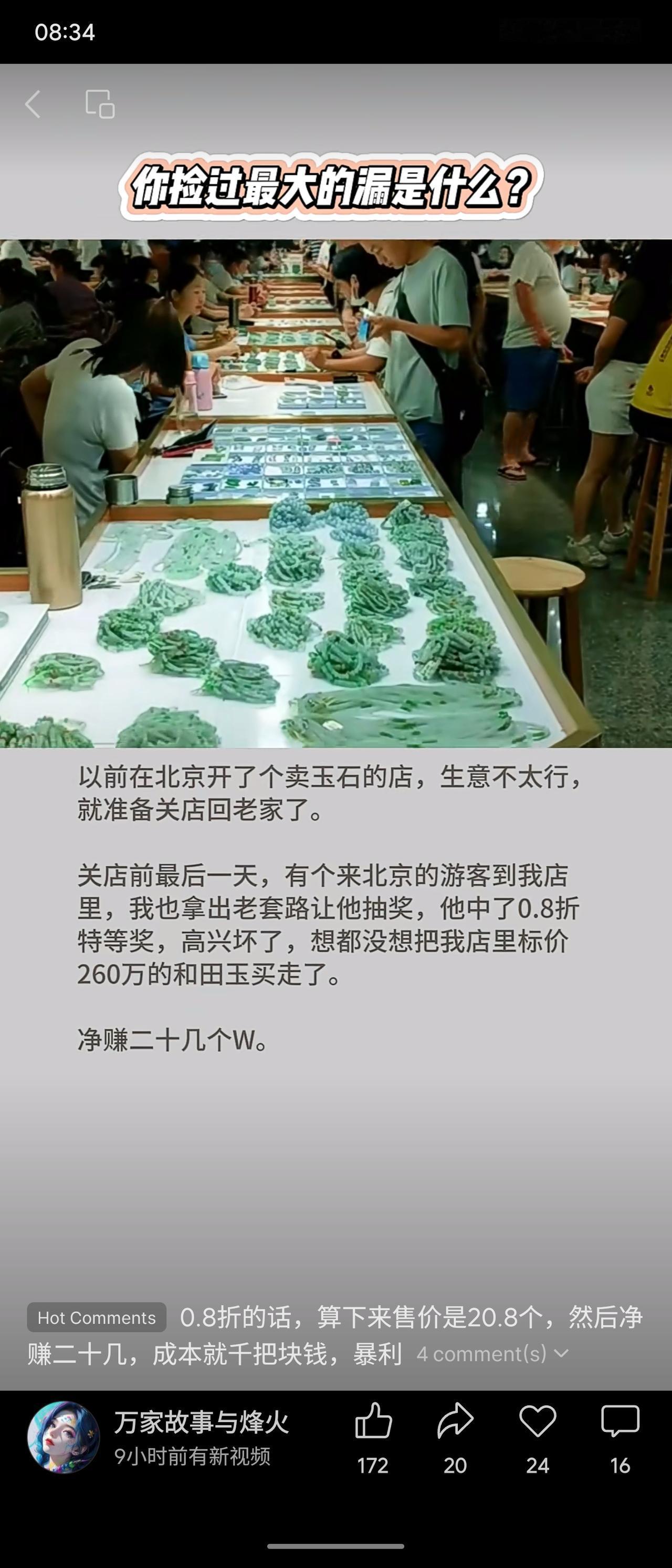 北京一玉石店老板关店前,用抽奖套路让游客以0.8折买下标价260万的和田玉,净赚二十多万元,实为成本仅千元的暴利交易。