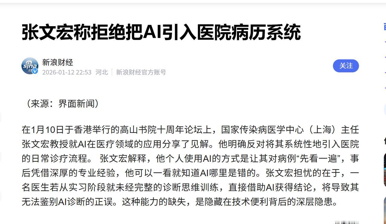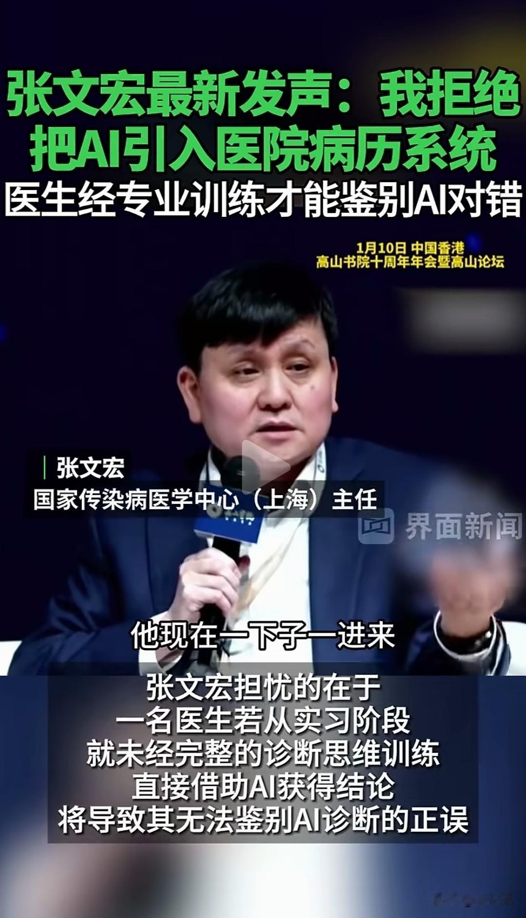 根据新浪财经1月12日报道,最近张文宏医生竟然在香港高山书院十周年论坛上,旗帜鲜明、毫不客气地反对道:“我拒绝将AI引入病历系统!” 做出了这样的反对声明之后,张文宏医生也随之说明了之所以反对的理由。他提到,他之所以反对将AI引入病历系统,不是因为AI能力弱,反而是因为AI能力太强了,现在AI诊疗时,准确率极高,跟那种最资深的医生相比都没有什么差别了。 但即便是如此,AI也有可能出错。 如果一个医生,从他当实习医生开始,就依赖这样一个AI,没有经过完整的诊断思维训练,那么他的医术将得不到任何进步,而未来一旦AI出现错误,这样的医生也将没有任何判别AI诊疗正确与否的能力。长远下去,对于医生发展而言,这一个过于高明的助手,反而是会起到一个阻力。 张文宏这样的观点一经发出,立刻就引起了网上的热烈讨论,有支持者,也有反对者。 支持者认为,AI固然强大,但是并不是万能的,也会经常出错,事实上AI诊断出现错误这样的案例已经有不少,很多人因为轻信AI而采取了错误的治疗方法,让自己遭受巨大的损失。作为一个医生,治病救人是其天职,想要完成这一份天职,就需要有足够的能力,如果连判断AI诊疗准确与否的能力都没有,那么医生存在的意义是什么?如果判断不了AI诊疗的正确与否,那么AI诊疗真的出错了,又怎么办? 反对者则是认为,张文宏医生这个理由根本站不住脚。首先,AI会出现错误,但是医生同样也会出现失误,甚至医生出现失误的可能性还更高一些。尤其是一些小地方的医生,以及一些没有太多经验的实习医生,出现失误的可能性更高。有AI这样一个帮手,提升他们的诊断能力,难道不好吗?从整体上来说,这样才能救治更多的病人!所谓依赖AI不利于医生能力培养的说法,并无多大说服力,毕竟AI只是工具,有好工具不用,那不是捡了芝麻丢了西瓜吗? 而且,更加重要的是,AI诊疗的能力,其实在一直不断飞速提升,现在的AI,能力就已经很强了,未来的AI诊疗,能力会更强,失误会更少! 不得不说,无论是支持者,亦或者是反对者,说的都有一定道理。张文宏医生的观点,毫无疑问是引起了一场关于AI的大讨论,这或许正是AI时代降临时,我们思索应对如何使用AI的一个缩影,AI毫无疑问是一个强大的生产力工具,在这样的工具面前,作为人类,我们应该如何自处?这是一个永远也说不尽的话题。