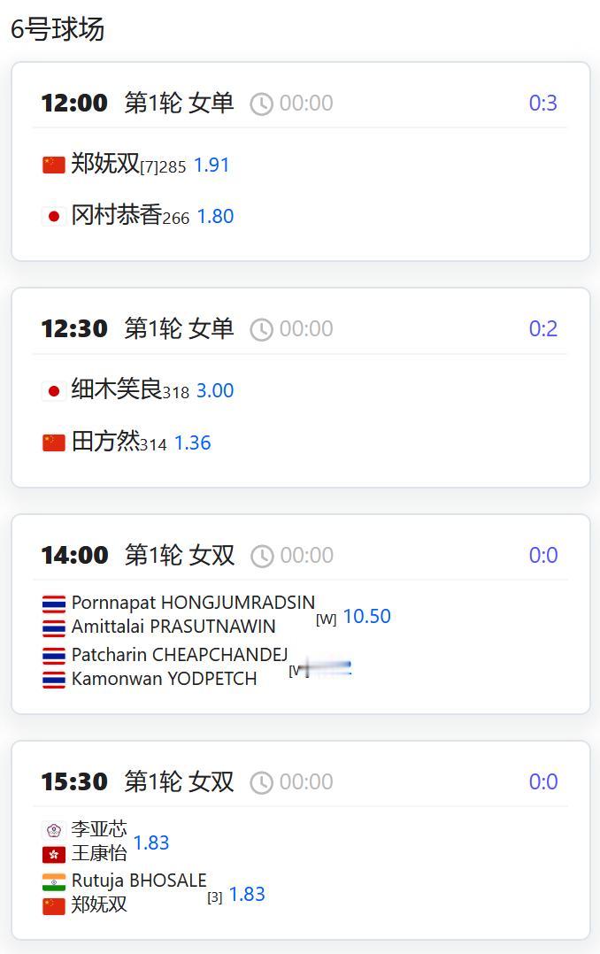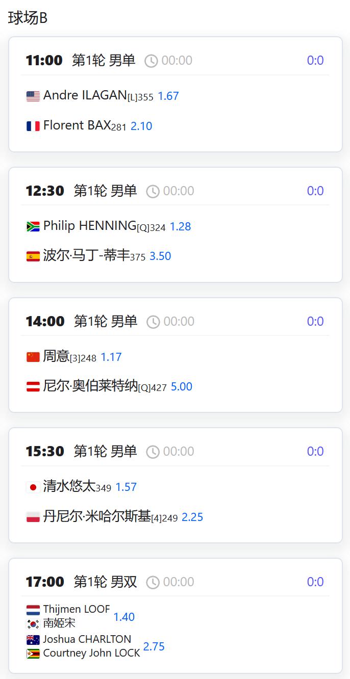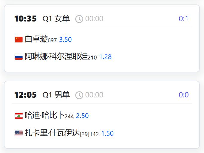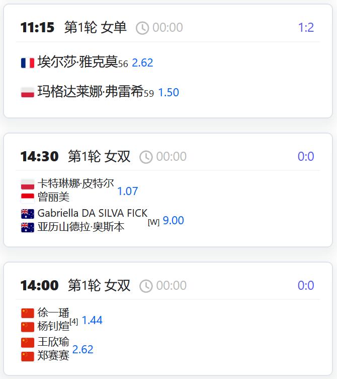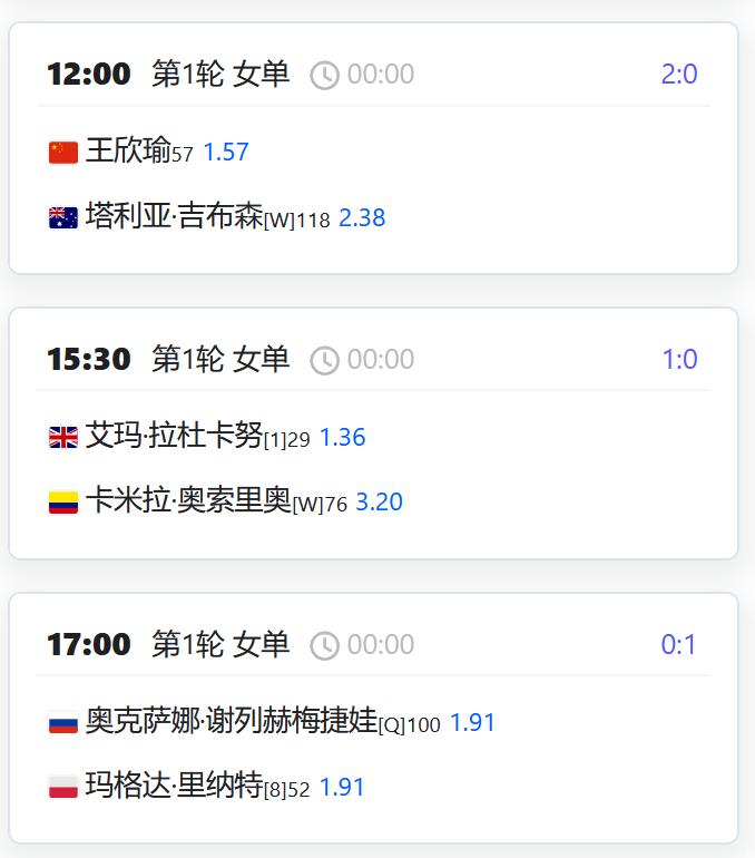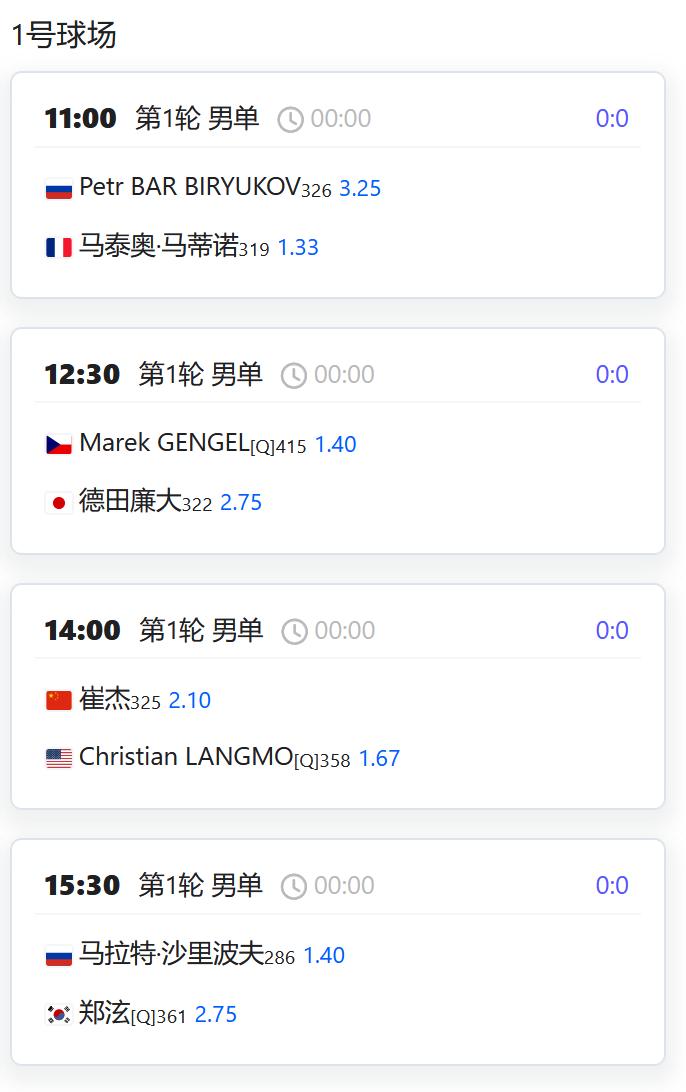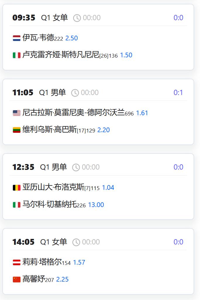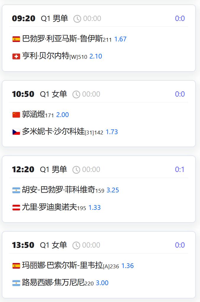 2026澳网资格赛第二日: 女单方面,马烨欣6-1,6-3横扫32号种子勒普琴科,顺利晋级第二轮; 袁悦将不早于北京时间今天上午10:35出战,对阵齐里科; 郭涵煜则可能在今天上午11时左右登场,对阵31号种子沙尔科娃; 高馨妤将在今天下午对阵奥地利的塔格尔; 白卓璇将对阵科尔涅耶娃。 男单方面,吴易昺目前正在与米克尔森进行第一盘的较量,比分为3-3。 WTA250赛霍巴特站,王欣瑜面临一日双赛考验,先是单打对阵外卡球员吉布森; 稍事休息后将搭档郑赛赛出战女双,对阵同胞组合徐一璠/杨钊煊。 CH75暖武里府,周意将在男单首轮对阵资格赛球员奥伯莱特纳; 崔杰同样将对阵一名资格赛球员LANGMO; W75暖武里府,郑妩双面临一日双赛:单打对阵冈村恭香,随后双打对阵港台组合李亚芯/王康怡; 田方然将在女单首轮对阵日本球员细木笑良。