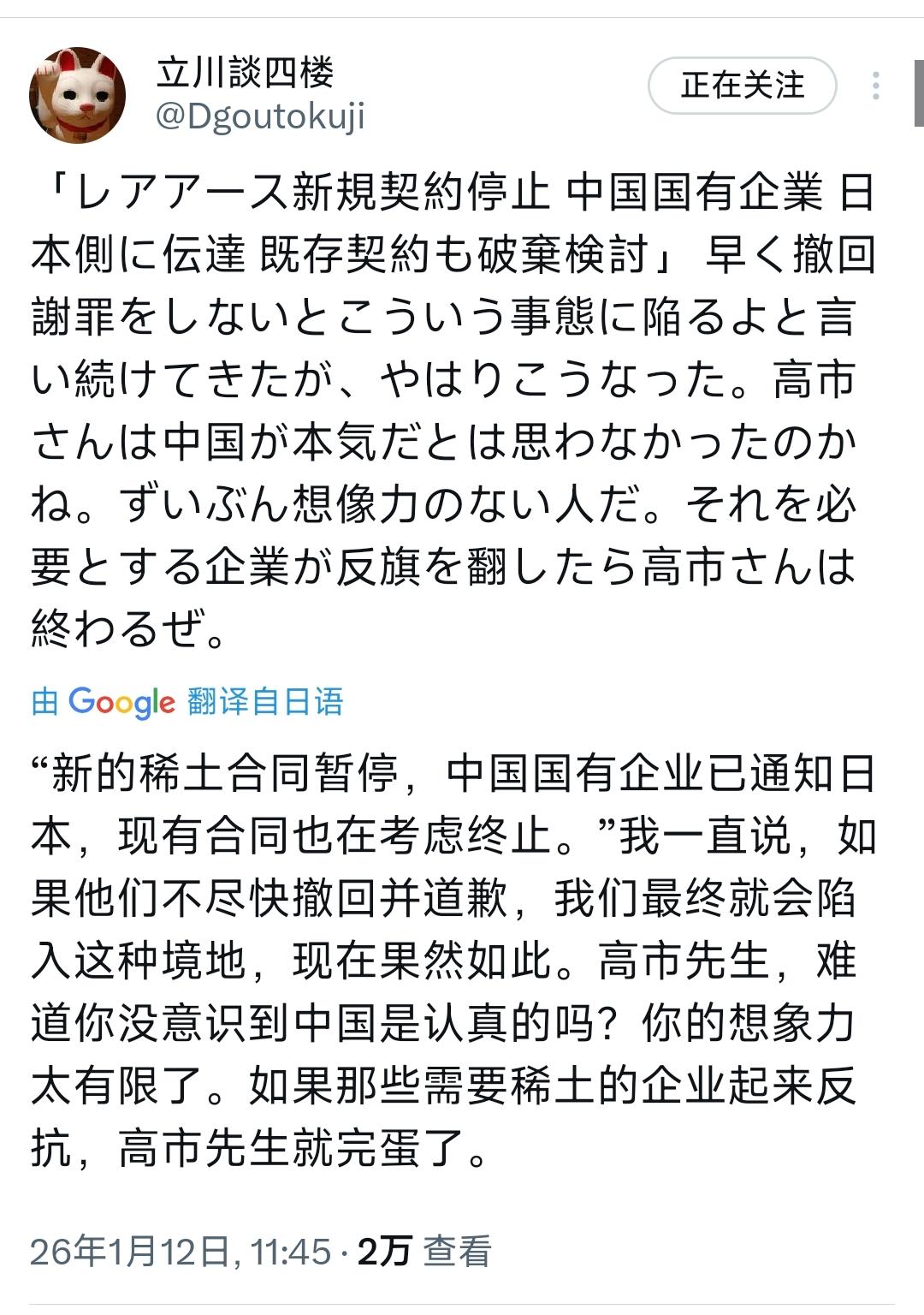 日本人气作家立川谈四楼1月12日写道:“‘新的稀土合同暂停,中国国有企业已通知日本,现有合同也在考虑终止。’我一直说,如果他们不尽快撤回并道歉,我们最终就会陷入这种境地,现在果然如此。高市首相,难道你没意识到中国是认真的吗?你的想象力太有限了。如果那些需要稀土的企业起来反抗,高市首相就完蛋了。” 只能说高市早苗的执政困境本质上是其主动触碰中国核心利益红线后的必然结果,其一系列涉台挑衅言行并非孤立的政治表态,而是直接触发了中方精准反制,最终将日本经济拖入两难境地。 早在2025年11月,高市早苗就在国会答辩中公然将“台湾有事”与日本“存亡危机事态”绑定,暗示自卫队可行使集体自卫权介入台海,后续更援引非法的《旧金山和约》鼓吹“台湾地位未定论”。 这种无视历史法理的言行不仅违背了《开罗宣言》《波茨坦公告》等国际文件精神,也背弃了中日邦交正常化以来日方承诺的不干涉台湾问题的外交义务,显然是对中国内政的粗暴干涉。 更值得玩味的是,即便中方多次通过外交渠道严正交涉,高市政府不仅未收敛,反而在新年记者会上继续渲染地区紧张局势,推进安保三文件修订,这种执迷不悟的强硬姿态,显然低估了中国维护国家主权的决心。 中方此次针对稀土贸易的管制措施,正是对这种挑衅行为的针对性回应,而非所谓的“不合惯例”,毕竟任何国家都有权对损害自身核心利益的行为采取必要反制措施。 从产业格局来看,中方的反制之所以能精准击中日本要害,根源在于中国在全球稀土供应链中的绝对主导地位,2024年全球稀土矿产量中中国占比高达69.2%。 而更关键的精炼环节,中国更是掌控了全球90%的产能,尤其是日本高科技产业急需的镝、铽等中重稀土,中国的资源优势和加工能力更是无可替代。 日本产业界对此早有认知,近年来虽极力推动稀土供应多元化,将对华依赖度从90%降至60%,但在核心的重稀土领域却始终无法摆脱依赖,用于电动汽车驱动电机钕磁体的镝、铽等材料,日本几乎100%依赖中国进口。 这种结构性依赖意味着中方的管制措施一旦落地,日本相关产业将立刻面临“断粮”风险,日本野村综合研究所的评估数据就直观地揭示了这一点:若中方稀土出口限制持续3个月,日本将承受6600亿日元的经济损失,名义和实际GDP均会下降0.11%,若限制持续一年,损失将扩大至2.6万亿日元,GDP降幅达0.43%。 目前这种影响已初现端倪,2026年1月已有消息显示,中方已暂停对日本稀土磁铁出口许可证的审查,覆盖整个日本产业,这对以汽车、半导体为核心支柱的日本经济而言无疑是致命打击,要知道丰田、索尼等日本龙头企业的核心产品生产都离不开稀土材料。 更具讽刺意味的是,高市政府一边高喊“对抗”,一边却无法解决国内产业的实际困境,日本贸易巨头伊藤忠商事社长已公开表态认为这场争端将长期持续,而那些依赖稀土的日本企业已陷入焦虑,这种焦虑迟早会转化为对执政者的不满。 立川谈四楼提到的“需要稀土的企业起来反抗”并非危言耸听,毕竟企业的生存本能远胜于政治口号,当高市的强硬姿态直接损害到日本经济的根本利益时。 其执政基础必然会动摇,所谓的“短命首相宿命”实则是其脱离现实的执政逻辑所注定的,毕竟任何无视自身产业短板、肆意触碰他国核心利益的执政行为,最终都必将自食恶果。