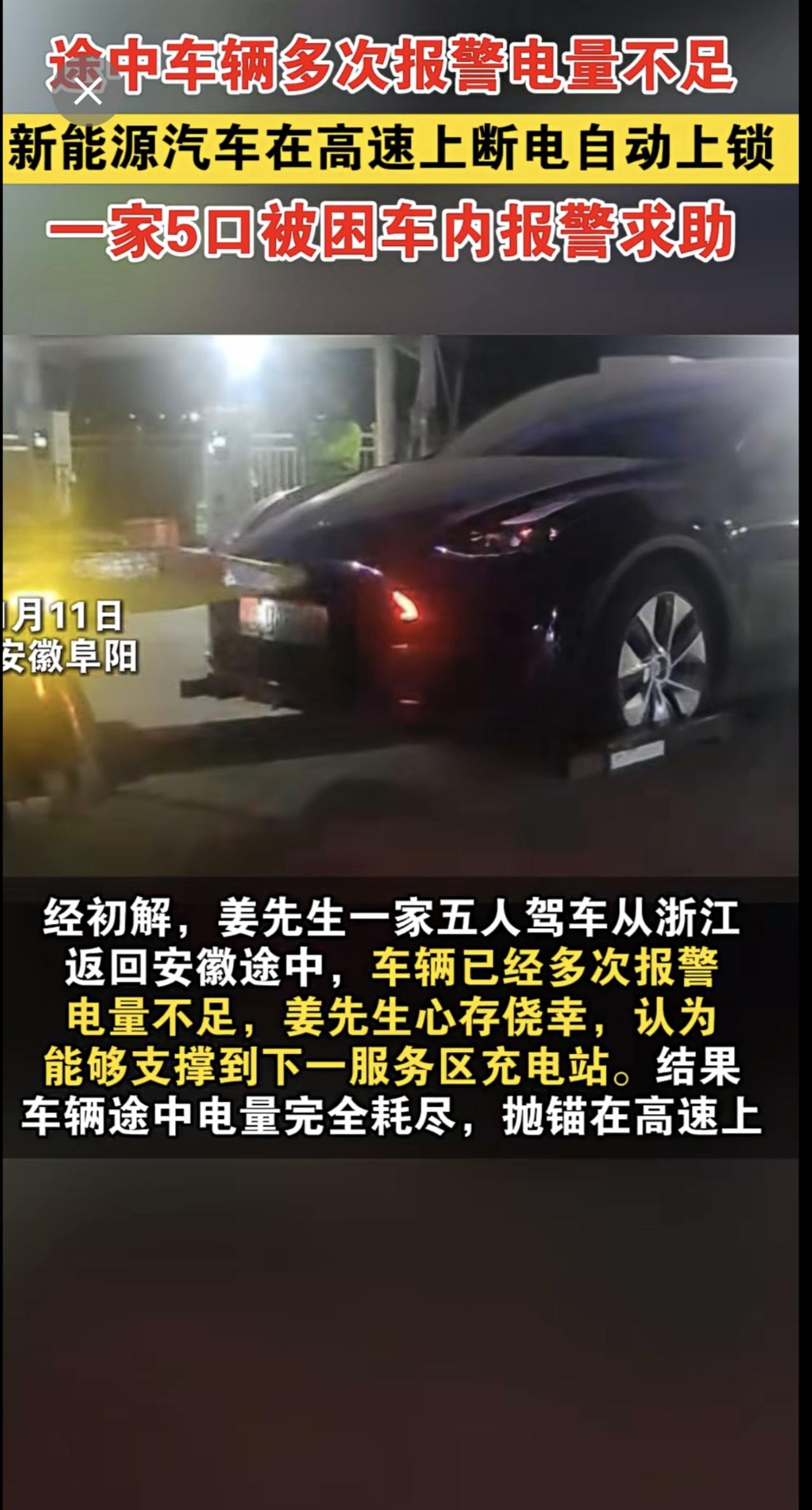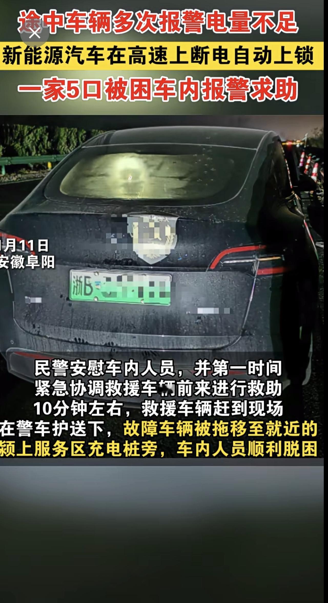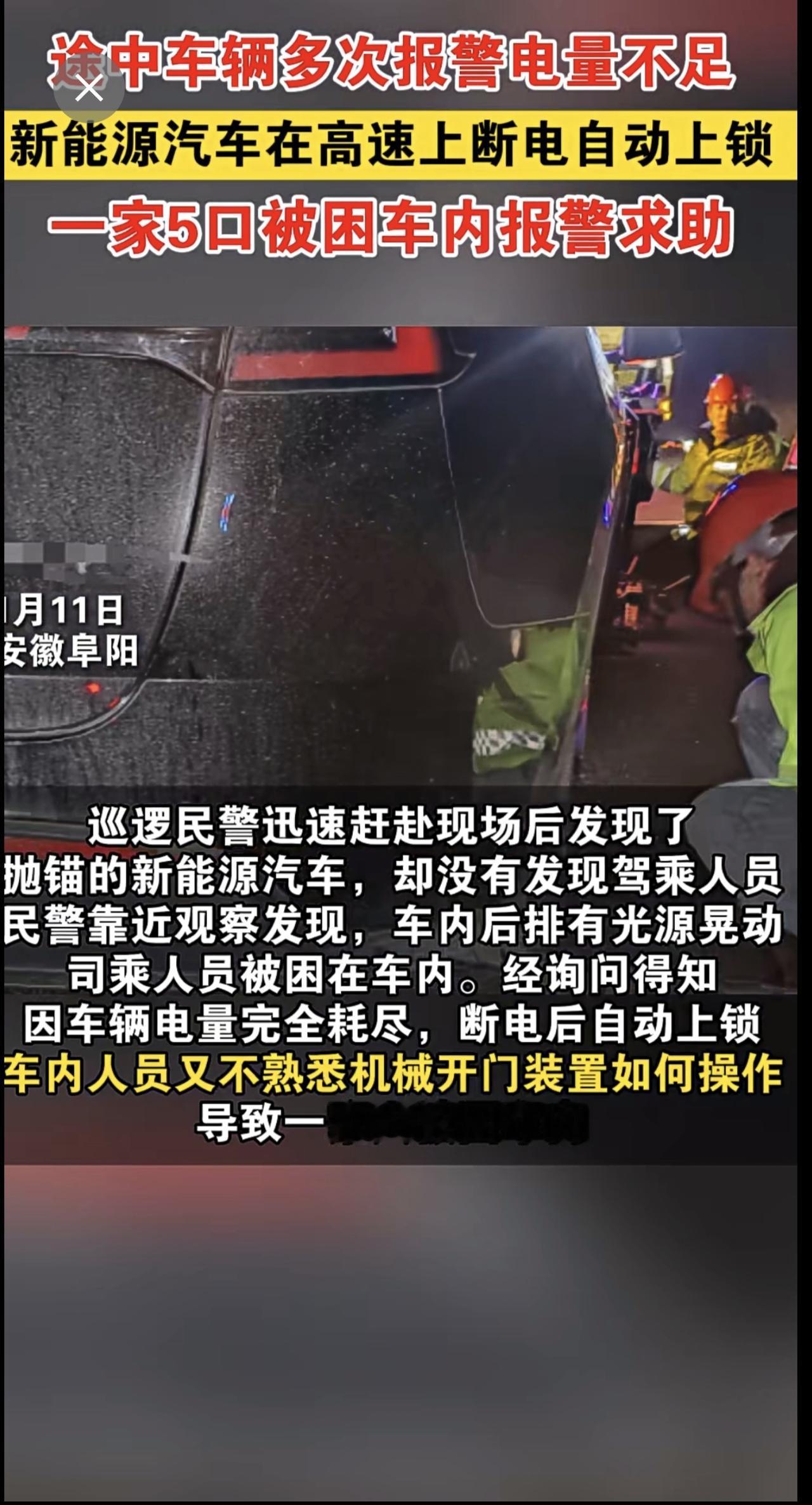 新能源汽车在高速上断电自动上锁,一家5口被困车内报警求助,车辆已经多次报警电量不足。车主心存侥幸,认为能够支撑到下一服务区充电站。 民警:有机械门把手,司机不知如何操作,车内人员已脱困 安徽 阜阳 新能源汽车