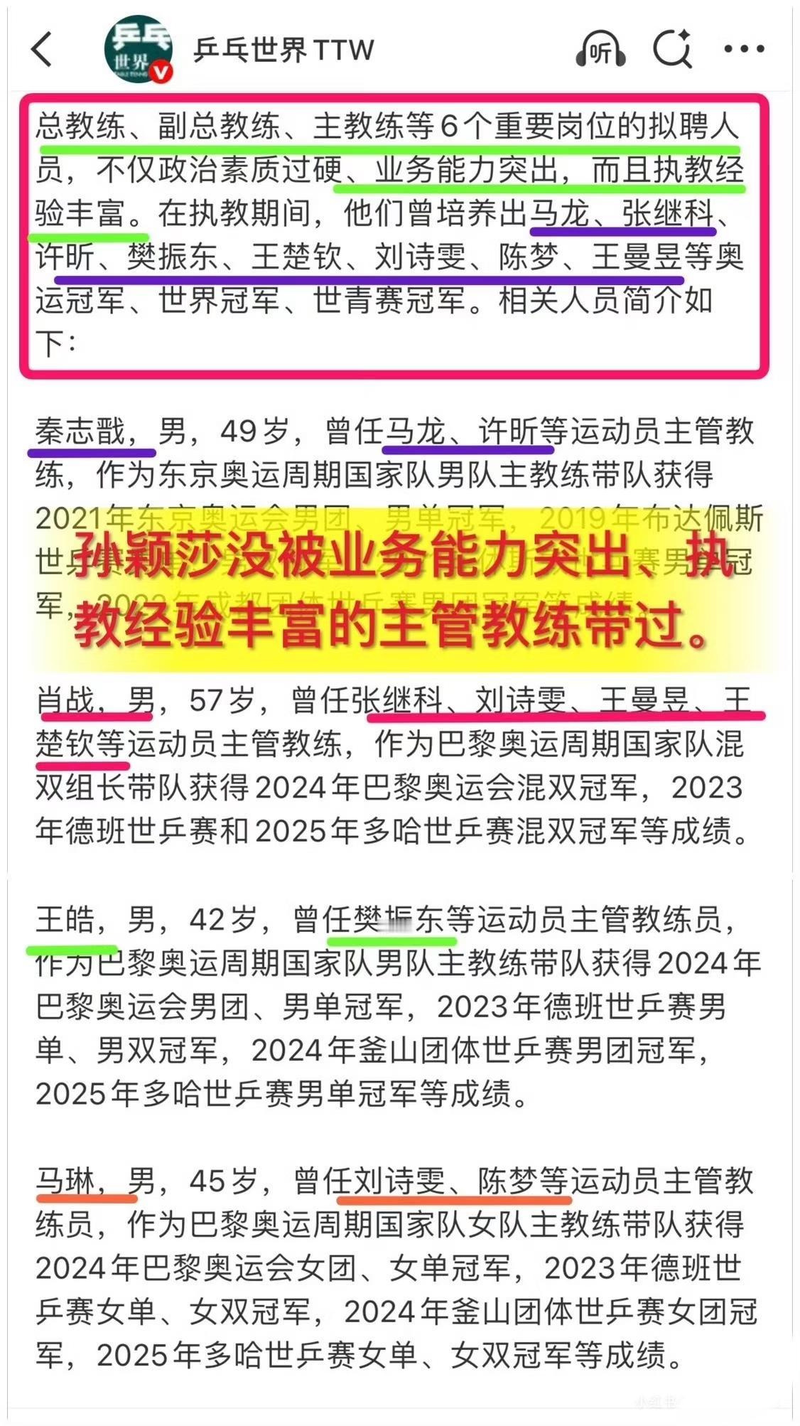 国乒教练一公布,网友破防了! 莎莎是唯一没有被有能力的教练带过的。硬生生自己打出来的。 这样的待遇,网友破防了。 有人提出疑问“莎莎现在不打了,会怎么样?” 网友给出解答:“顶多不能实现大满贯,但是他们会慌,混双没人抗了,各种特殊打法没人打了,排兵布阵乱了,得金牌的几率更低了。” 我觉得他说的很对。
