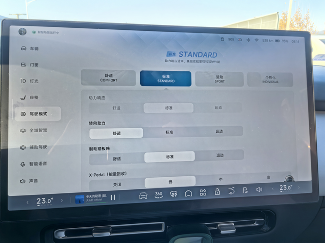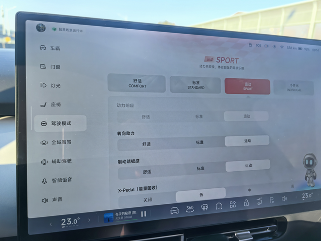 日常用车还是喜欢标准模式 小鹏P7+有四种驾驶模式,舒适模式主题色是绿色,这种模式也是最节能的,方向盘最轻,动力最慢,刹车反应最慢,所以我几乎不会用到这个模式。运动模式的动力响应五块,基本上电门一踩就有推背感,方向盘也是真的重,刹车也是最灵敏的,一般跑高速我喜欢用运动模式,而且实测高速运动模式会更省电。