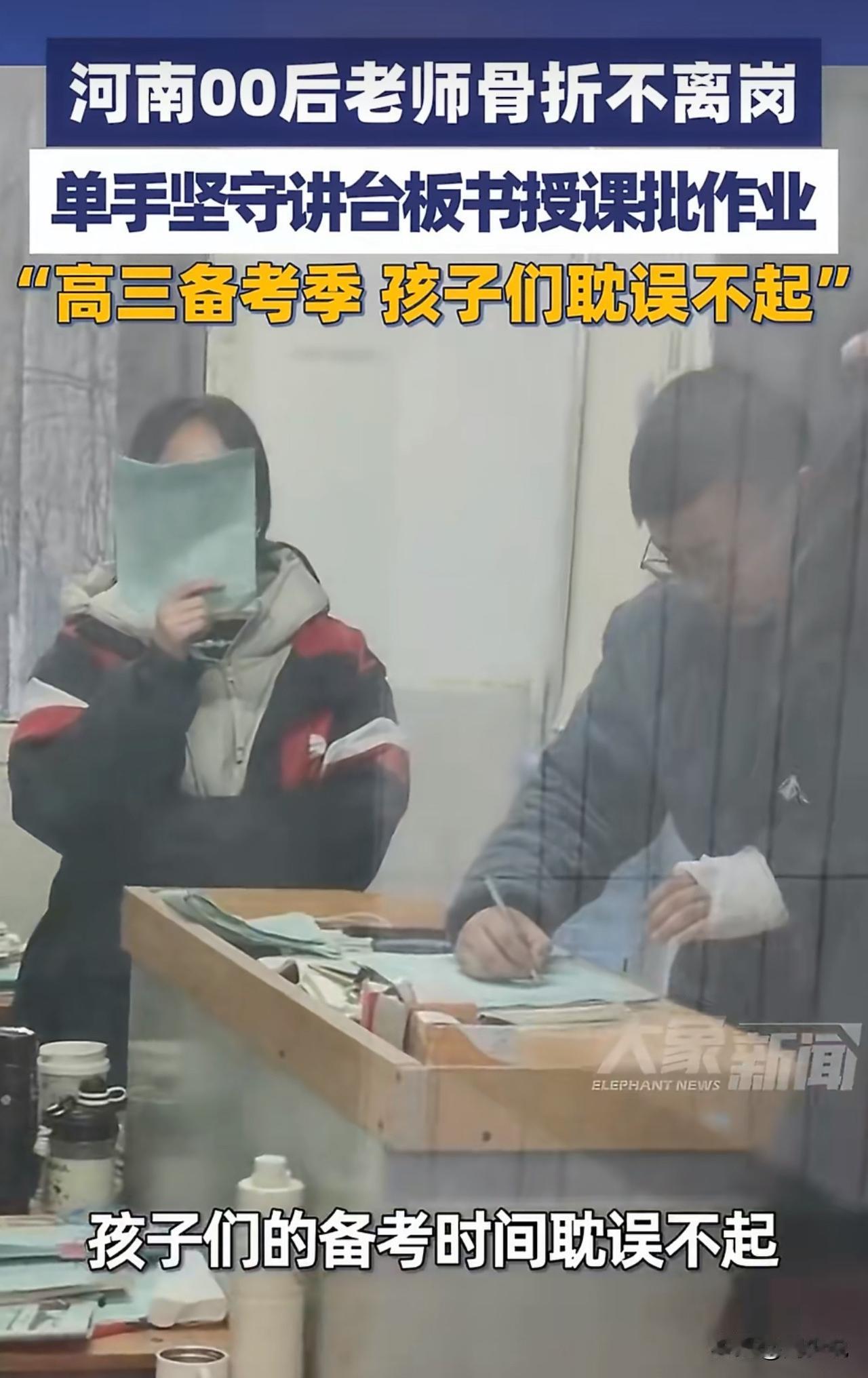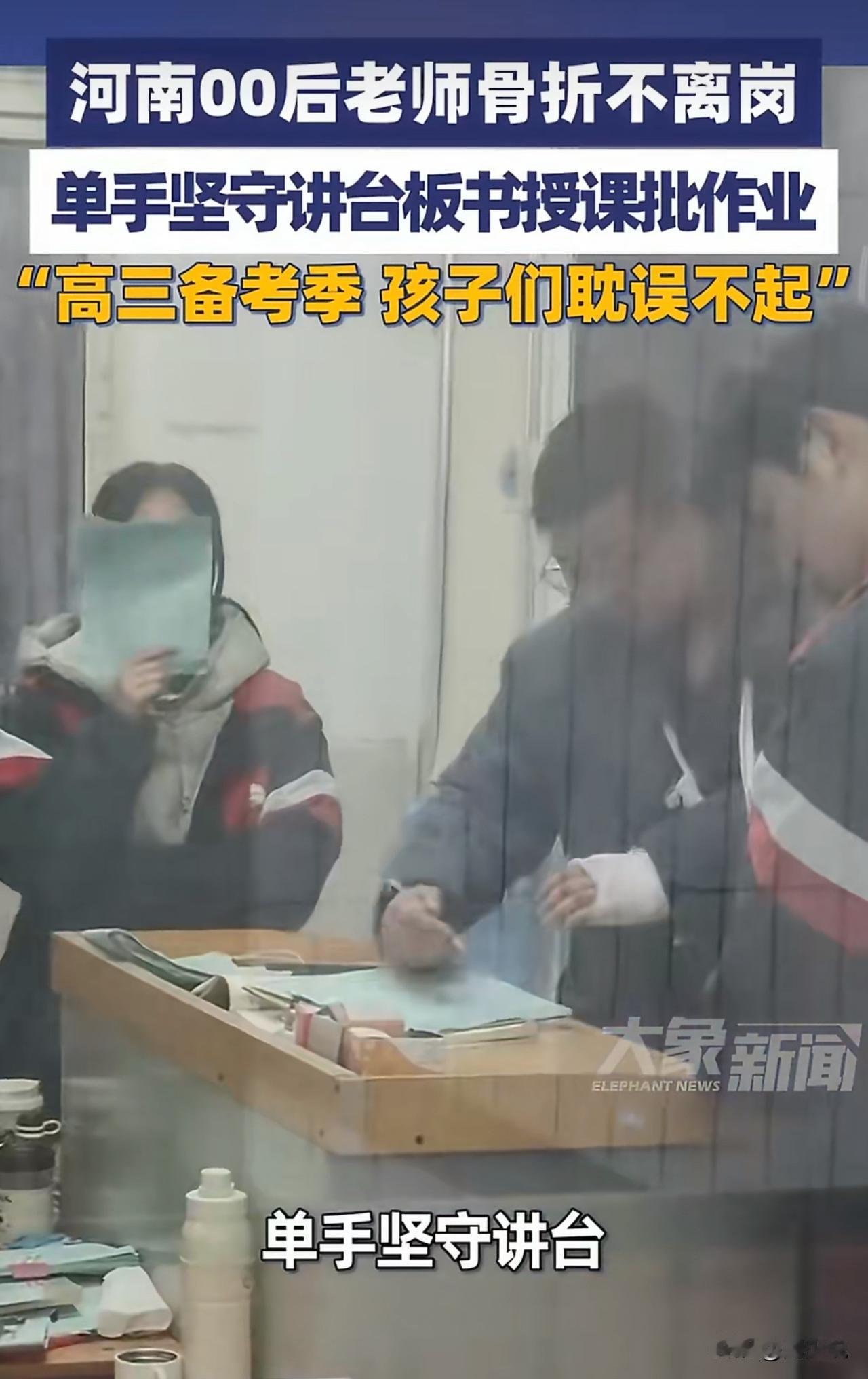 这位00后老师彻底火了!本该骨折在家静养的他,因为放不下即将高考的学生,不顾医生静养叮嘱,带着骨折的手臂毅然回到了讲台,单手坚守讲台板书授课批作业。当有人劝他休息时,他只淡淡说了一句:“高三备考季,孩子们耽误不起!” 这一幕被拍下后,迅速引发网友关注。 不少网友纷纷点赞:“00后老师真的太有责任心了,这才是学生该追的星!” 也有网友表示:“这样的老师,教出来的孩子肯定差不了!” 在周少看来,这位00后老师的这份坚守,早已超越了一份职业的责任。高三是学生人生的关键路口,他的执着与担当,不仅是在传授知识,更是在用行动给学生上了最生动的一课。 他让孩子们懂得,什么是敬业,什么是担当,什么是“不抛弃、不放弃”。这种言传身教的力量,远比课本上的文字更有感染力。 更何况,教育的本质,就是用一颗心去温暖另一颗心,这位00后老师无疑做到了这一点,他值得所有家长和学生的尊敬,值得大家点赞!#寻美三湘# #长沙新朋友#