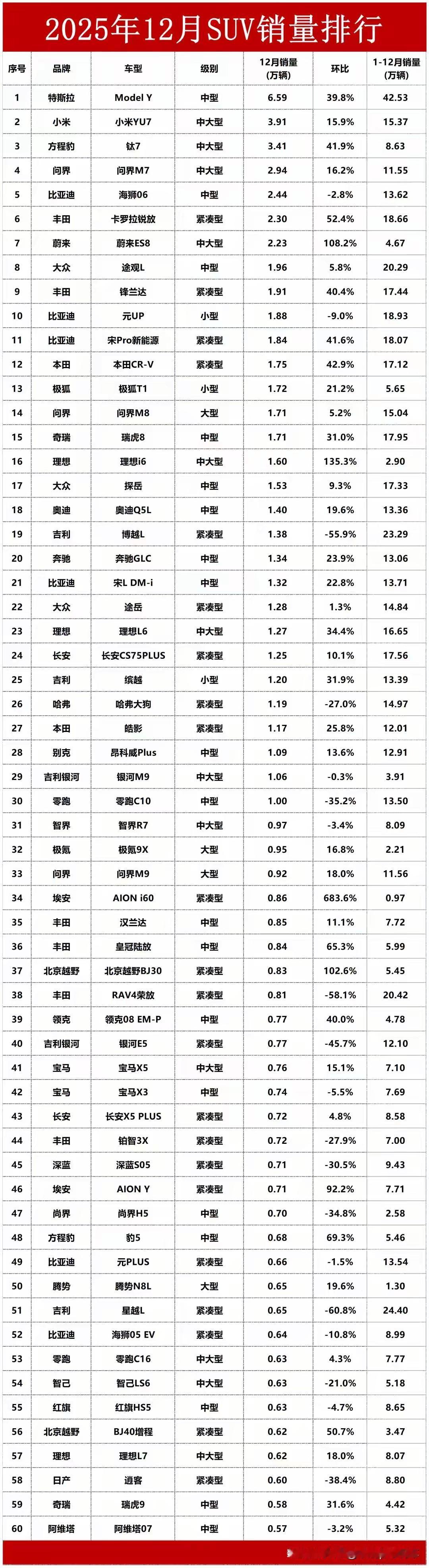 这就是赤裸裸的现实啊,一箱油在哪个国家最贵: 英国:约需800元人民币, 日本:约需550元人民币, 中国:约需510元人民币, 美国:约需450元人民币, 沙特:约需270元人民币, 俄罗斯:约需255元人民币, 伊朗:约需12元人民币。 2025年12月SUV销量榜:特斯拉Model Y登顶,这些车型环比涨幅超百倍 2025年12月SUV销量排行正式公布,乘联会零售数据展现出年末SUV市场的激烈角逐,特斯拉Model Y以绝对优势拿下榜首,新势力、自主品牌和合资品牌各有亮点,多款车型凭借惊人的环比涨幅成为榜单黑马,具体情况一起来看。 - 头部格局:特斯拉一骑绝尘,小米、方程豹跻身前三 12月SUV销量冠军被特斯拉Model Y锁定,6.59万辆的销量远超其他车型,环比还实现39.8%的增长,1-12月累计销量更是达到42.53万辆,成为中型SUV市场的“标杆”。小米YU7作为新晋车型表现亮眼,以3.91万辆位列第二,15.9%的环比增长印证了市场对这款中大型SUV的认可;方程豹钛7以3.41万辆排名第三,41.9%的环比涨幅展现出硬派SUV的市场潜力。问界M7与方程豹钛7并列第四,2.94万辆的销量让其在中大型SUV领域站稳脚跟。 - 品牌表现:新势力集体发力,比亚迪多车型覆盖细分市场 新势力在此次榜单中表现抢眼,蔚来ES8以108.2%的环比涨幅冲到第七名,理想i6更是凭借135.3%的环比增幅成为榜单中的增长“王者”。比亚迪依旧保持多品类布局的优势,海狮06、元UP、宋Pro新能源等多款车型进入前二十,其中宋Pro新能源环比增长41.6%,在紧凑型SUV市场收获稳定销量。此外,问界M8、M9两款车型也进入榜单,展现出华为系车型在高端SUV市场的竞争力。 - 黑马车型:环比涨幅刷新认知,传统品牌也有惊喜 除了理想i6和蔚来ES8,埃安AION i60的环比涨幅达到683.6%,成为12月SUV销量榜中涨幅最高的车型;北京越野BJ30也以102.6%的环比增长,在紧凑型SUV市场中脱颖而出。合资品牌里,丰田卡罗拉锐放环比大涨52.4%,本田CR-V也实现42.9%的环比增长,传统日系SUV依旧拥有稳定的消费群体。不过丰田RAV4荣放环比下滑58.1%,成为日系车中的“失意者”。 - 传统豪华与自主品牌:两极分化明显 德系豪华品牌中,奥迪Q5L、奔驰GLC分别以1.40万辆、1.34万辆位列十八、二十名,环比均实现正增长;宝马X5、X3则销量稍逊,其中宝马X3环比下滑5.5%。自主品牌方面,吉利博越L环比大跌55.9%,但吉利缤越实现31.9%的环比增长;奇瑞瑞虎8、长安CS75PLUS也保持稳定销量,展现出自主品牌在紧凑型SUV市场的深厚积淀。 年末的SUV市场,新势力的创新突围、特斯拉的强势领跑,再加上自主品牌和合资品牌的此消彼长,共同绘就了2025年最后一个月的市场图景。而那些涨幅惊人的黑马车型,也让我们看到SUV市场细分领域的无限可能。