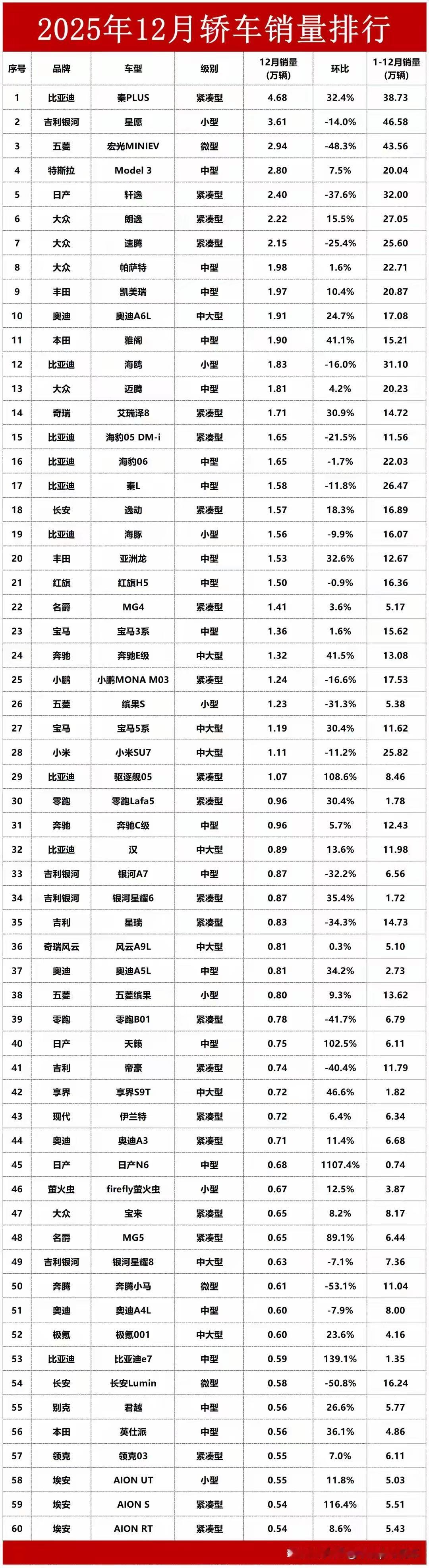 赤裸裸的现实来了,加满50升油箱: 美 国:约需370元人民币! 日 本:约需440元人民币! 英 国:约需630元人民币! 法 国:约需676元人民币! 俄 罗斯:约需240元人民币! 沙 特:约需226元人民币! 伊 朗:约需12元人民币! 中 国:约需360元人民币! 2025年12月轿车销量榜:比亚迪霸榜,这些车型成最大黑马 2025年12月轿车销量排行新鲜出炉,乘联会零售数据勾勒出了年末车市的竞争格局,比亚迪继续展现强势表现,多款车型跻身榜单前列,同时还有不少车型凭借亮眼的环比涨幅成为榜单中的黑马,一起来看看具体情况。 - 头部阵营:比亚迪秦PLUS登顶,吉利银河星原紧随 12月轿车销量榜首被比亚迪秦PLUS拿下,以4.68万辆的成绩领跑紧凑型轿车市场,环比还实现32.4%的增长,1-12月累计销量更是达到38.73万辆,成为年度紧凑型轿车中的佼佼者。吉利银河星原以3.61万辆位列第二,不过环比出现14.0%的下滑;五菱宏光MINIEV以2.94万辆排名第三,环比降幅达48.3%,微型车市场的热度有所回落。特斯拉Model 3则以2.80万辆的销量位居第四,7.5%的环比增长让其在中型车市场站稳脚跟。 - 品牌表现:比亚迪成最大赢家,多车型覆盖各细分市场 比亚迪在此次榜单中展现出极强的产品矩阵实力,除了秦PLUS外,海鸥、海豹05 DM-i、海豚等多款车型均进入前20,驱逐舰05更是以108.6%的环比涨幅成为榜单中的增长先锋,12月销量达1.07万辆。在中大型车领域,比亚迪汉虽仅位列32名,但也实现了13.6%的环比增长。整体来看,比亚迪旗下车型几乎覆盖了微型、小型、紧凑型、中型、中大型等多个轿车细分市场,成为12月销量榜中出镜率最高的品牌。 - 黑马车型:环比涨幅亮眼,日系、新势力各有亮点 除了比亚迪驱逐舰05,日产天籁和日产N6的环比涨幅也十分惊人,分别达到102.5%和1107.4%,成为日系车中的黑马。新势力方面,小鹏MONA M03以1.24万辆位列25名,虽环比下滑16.6%,但仍是小鹏旗下的销量主力;小米SU7作为中大型车新贵,以1.11万辆排名28,在高端市场占据了一席之地。此外,零跑Lafa5、宝马5系等车型也凭借30.4%的环比增长,在各自细分市场中表现突出。 - 传统合资品牌:大众仍居前列,德系豪华车稳中有变 大众依旧是合资品牌中的代表,朗逸、速腾、帕萨特等多款车型进入前十,不过速腾环比下滑25.4%,显示出部分车型面临增长压力。德系豪华品牌中,奥迪A6L以1.91万辆位列第十,环比增长24.7%;宝马3系、奔驰E级分别以1.36万辆、1.32万辆位列23、24名,其中奔驰E级环比大涨41.5%,表现亮眼。 年末的轿车市场竞争依旧激烈,比亚迪的全品类布局、新势力的差异化突围以及合资品牌的稳扎稳打,共同构成了2025年最后一个月的车市图景。而那些环比大涨的黑马车型,也让市场看到了不同细分领域的消费潜力。