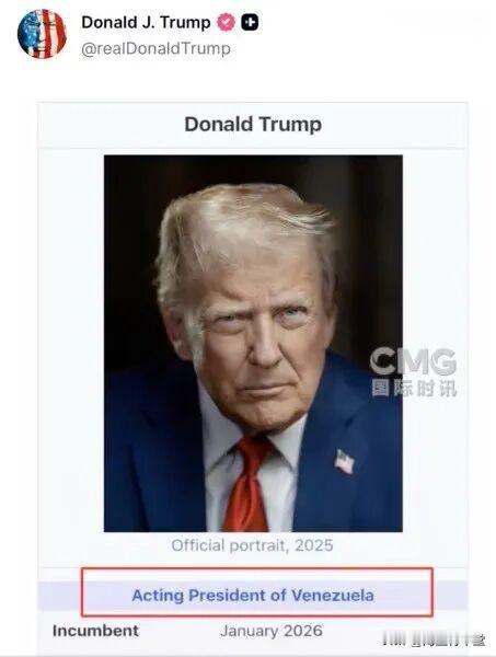 委内瑞拉:没有什么“特朗普代总统” 特朗普把这个世界玩得不亦乐乎。11日有社交平台显示维基百科网站的特朗普页面,人物身份栏标注“委内瑞拉代总统,任期自2026年1月起”。也有美媒披露,特朗普说将任命国务卿鲁比奥主政委内瑞拉。委内瑞拉临时总统罗德里格斯当天不得不亲自出面在委国电视台声明:“在这里,我们重申委内瑞拉的主权和独立。我看到维基百科上出现一张关于谁在掌权的图片。委内瑞拉拥有一个真正掌权的政府。” 1月12日,特朗普在其社交媒体“真实社交”发文称,即日起,任何与伊朗伊斯兰共和国开展商业往来的国家,在与美国进行的任何商业活动中都将被征收25%的关税,该决定“最终且不可更改”。这个事不会是伪造的,只不过怎么执行,考验美国的实力。要知道,欧洲多国在伊朗也有巨大的利益,否则欧洲人这些年不会那么着和伊朗藕断丝连谈判这谈判那的。 同学们,美国学者笑侃,特朗普高龄了,难免会出现戏剧性一幕。他二次登台,必然要尽兴表演。美国太强大了,他就是在这样的错觉下表演十分得劲儿。其实,中国人对这种状况太清楚了,中国历史上,伤心秦汉,无奈唐宋元明清,哪个王朝的末代没有这样折腾的主呢?
