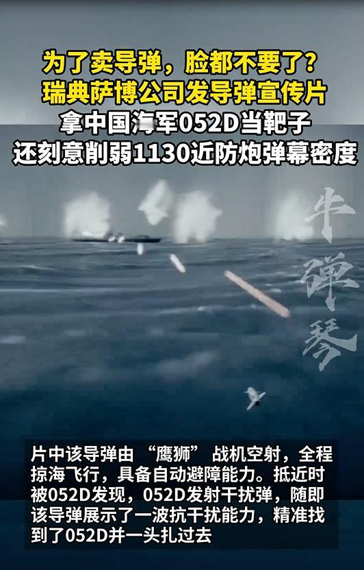 萨博卖导弹,脸都不要了!拿052D当靶,玩这种下三滥套路? 1月9日,瑞典萨博公司放了个大招,给自家RBS15 mk4反舰导弹拍宣传片。 不拍别的,专拿中国052D驱逐舰当靶子,连舷号172“昆明”舰都直接点名。 为了让导弹“命中”,更龌龊是故意削弱1130近防炮的弹幕密度,硬生生编了个“精准破防”的戏码。 片子里写满了表演:“鹰狮”战机空射导弹,掠海飞行、突破干扰弹,一套动作看似酷炫。 但明眼人一眼就看穿:这不是宣传片,是骗钱的劣质剧本! 1130近防炮96%的命中率、能拦4马赫目标的硬实力,被萨博刻意藏得严严实实。 为了卖货,连基本的尊重事实都做不到了? 萨博的心思,说白了就三件套,全是无底线操作: 一是编虚假战例,拿中国装备当垫脚石,靠抹黑抬自己; 二是蹭“中国威胁论”热度,借052D的名气造焦虑,专坑亚洲客户; 三是藏对手实力,靠信息差骗外行,把军售当割韭菜。 可惜,现在的市场不傻。 1130近防炮的性能早就是公开的底牌,萨博的小把戏只会沦为国际笑柄; 军售拼的是真刀真枪的数据,不是编出来的剧本。 想靠忽悠卖导弹?门都没有! 出来混,迟早要还。 萨博丢的不是面子,是信誉的根基。 营销套路玩得再溜,没有实力兜底都是空谈。 最终只会落得:导弹卖不动,名声全搞臭的下场。为了赚快钱,把长远路全堵死,这才是最蠢的生意!
