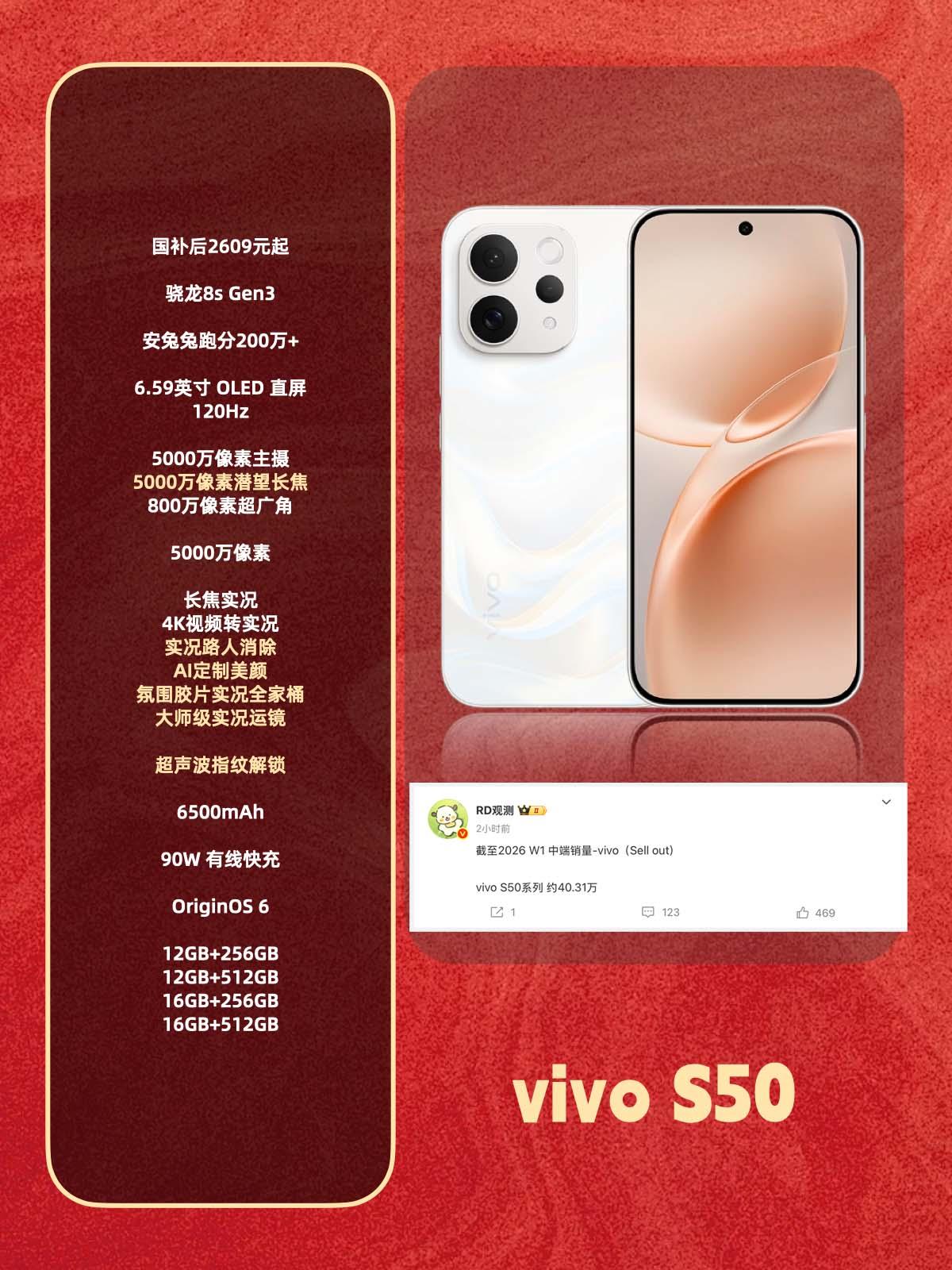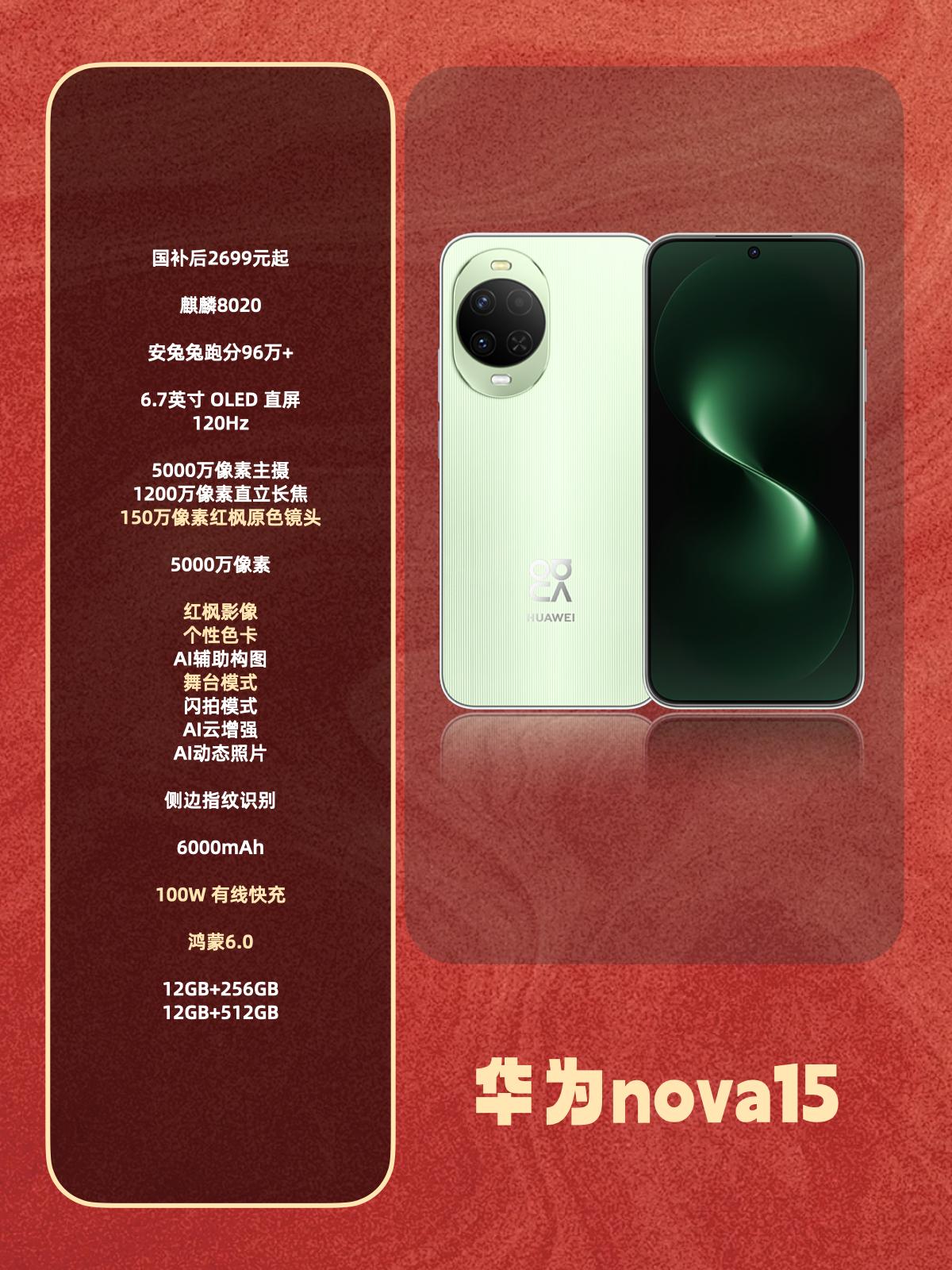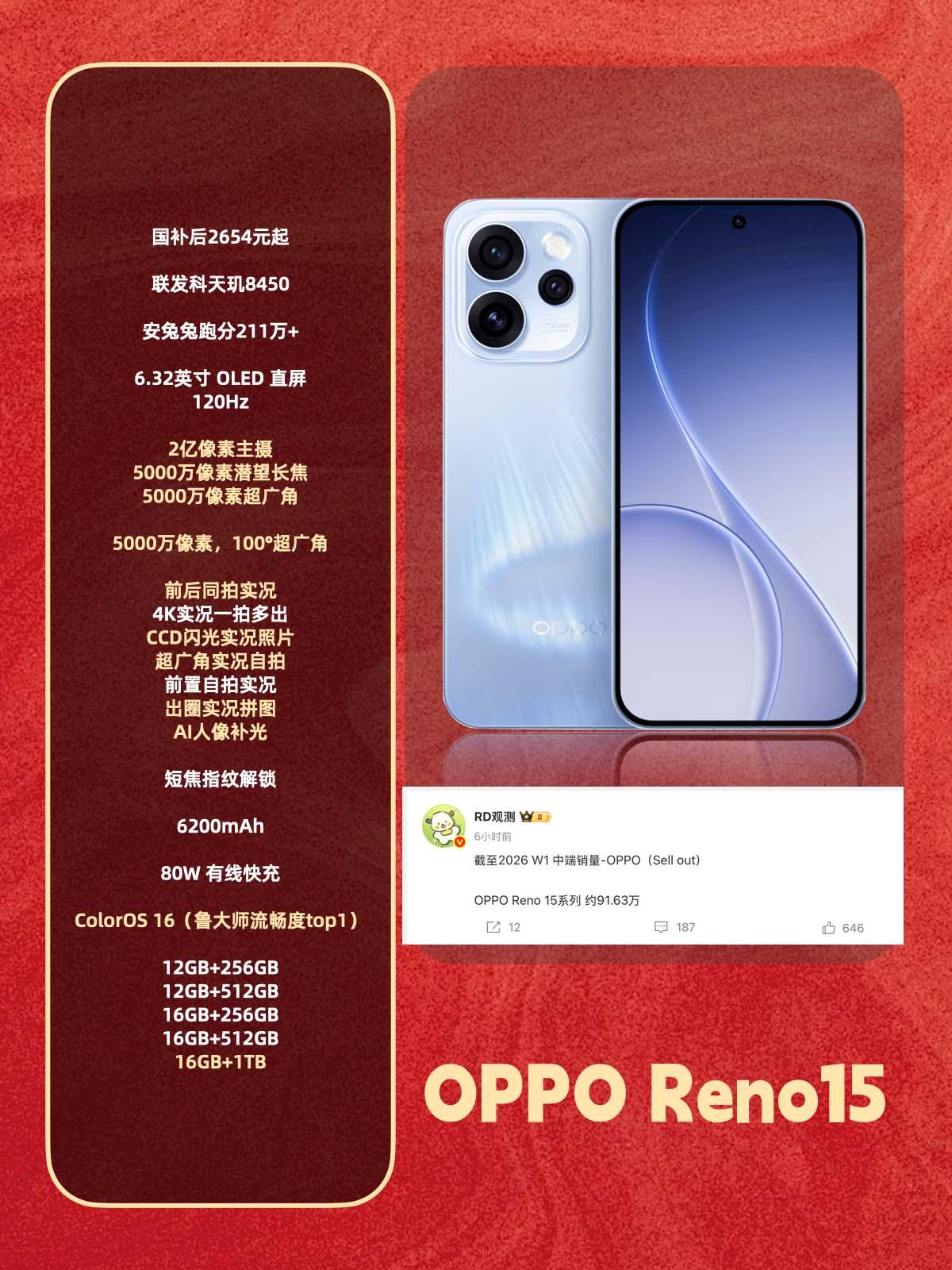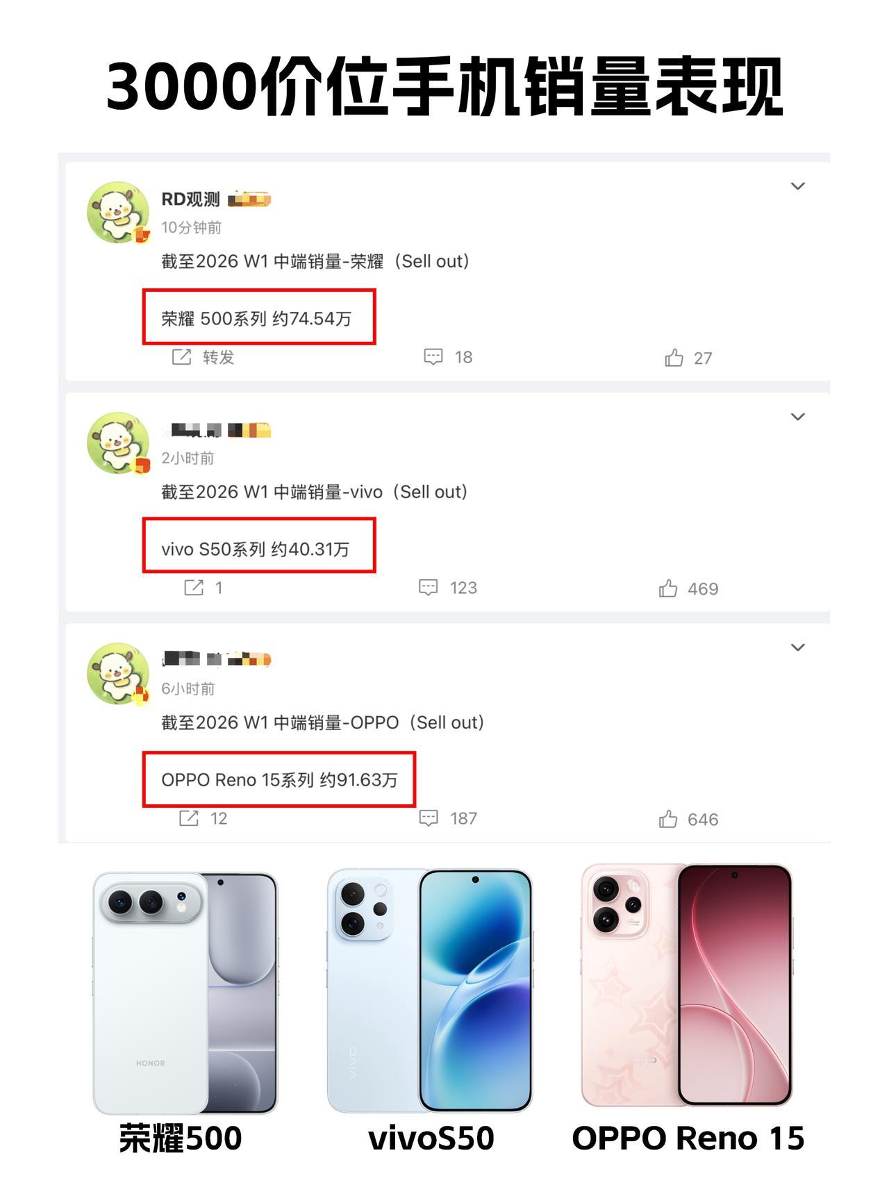 春节购机攻略!国补3000不到就选这几款 进入26年新的国补也来了,再加上马上春节过年,这个时候换手机就会很划算啦~ - 预算3k档,最近比较热门的拍照手机就这几款了吧? 华为nova15、荣耀500、OPPO Reno15和vivo S50,如果你们在纠结哪款更值得入手?可以看看我的分析。 - 我整理完配置发现,现在的国产机卷影像太狠了,3k价位个个都有绝招 - 华为nova15用上了旗舰同款红枫镜头,拍照色彩表现直接越级,还有个性色卡、舞台模式等特色玩法。 - 荣耀500电池非常大,后置双摄,主摄是2亿像素+1200万超广角,无长焦,成片清晰度优秀,就是拍远景长焦的话表现只能说够用。 - vivo S50三摄齐全,5000万主摄+800万超广角+5000万潜望镜头,望远能力出众,日常用还有超声波指纹,很加分! - OPPO Reno15则是没有一个凑数镜头,2亿主摄+5000万潜望+5000万广角,前置还是100°超广角的,还有前后同拍实况、CCD实况等一堆玩法,live照片体验是这几款里👄全面的。 - 大家更喜欢哪款?我是觉得喜欢续航选500,如果想要均衡体验的选Reno15,影像强不说,ColorOS 16系统流畅丝滑,有AI人像补光、AI记账等一堆实用功能。 看了RD观测的数据,Reno15 2026 w1 sell out 将近百万台,是S50的两倍!看来Reno15最新的出圈实况拼图功能深得用户喜爱啊~
