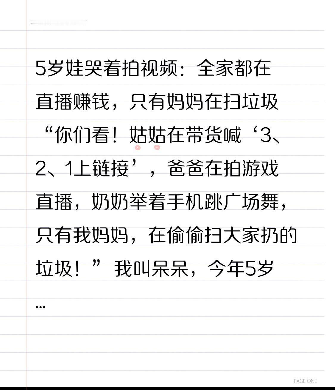 5岁娃哭着拍视频:全家都在直播赚钱,只有妈妈在扫垃圾 “你们看!姑姑在带货喊‘3、2、1上链接’,爸爸在拍游戏直播,奶奶举着手机跳广场舞,只有我妈妈,在偷偷扫大家扔的垃圾!” 我叫呆呆,今年5岁。今天家里像菜市场一样热闹,姑姑说直播能赚好多钱,让大家都帮忙造势。爸爸把沙发挪到镜头前,对着屏幕喊“老铁刷个礼物”;奶奶特意换了红衣服,手机架在茶几上,跳得满头大汗还笑着说“感谢家人们点赞”。 妈妈一开始也想凑过去看,姑姑挥挥手说“嫂子别挡镜头,你帮着收拾下就行”。然后妈妈就默默地拿起扫帚,把我们掉的薯片渣扫干净,把爸爸喝空的饮料瓶收进袋子,连姑姑直播时扯掉的包装纸,都蹲在地上一片片捡起来。 我看着妈妈额头上的汗,突然好难过。大家都在镜头前笑,只有妈妈在没人看见的地方忙。我跑过去拉妈妈的手:“妈妈你别扫了,我们也去直播!”妈妈蹲下来擦我的眼泪,笑着说“傻孩子,大家直播累了,得有个干净地方歇着呀”。 后来姑姑下播了,看到一尘不染的客厅愣住了;爸爸挠挠头,把刚扔的纸巾盒捡起来;奶奶拉着妈妈的手说“光顾着直播,把你忘了”。妈妈还是笑着说“没事,一家人嘛”,可我知道,她腰不好,蹲了好久肯定疼。 你们家是不是也这样?有人忙着赚钱,有人忙着热闹,却总有一个人在默默收拾残局。那不是她应该做的,是她把我们都放在了心上。 今天我想对妈妈说:“妈妈,你扫的不是垃圾,是我们的家呀!以后我再也不扔零食渣了,我要帮你一起收拾!” 也想问问大家,你家的“默默付出者”是谁?评论区说说你最想对TA说的话,让我们一起给TA一个大大的拥抱~ 家庭真相 妈妈的付出 直播背后的故事
