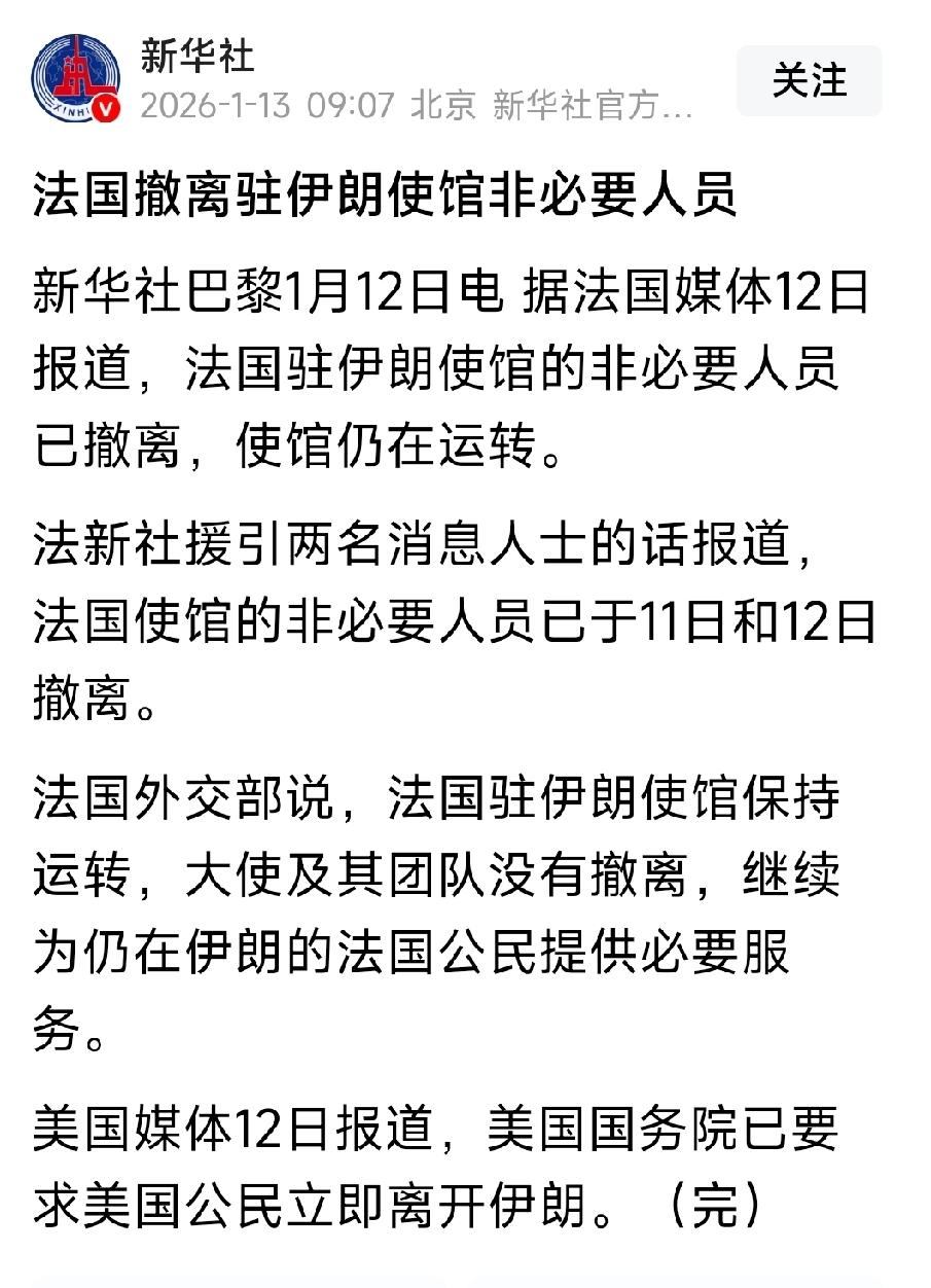 最新消息,重磅消息,1月12号,美国要求美国公民立即离开伊朗,法国撤离驻伊朗使馆非必要人员。 哈梅内伊要求伊朗全国人民要团结起来抵抗美国,以色列。