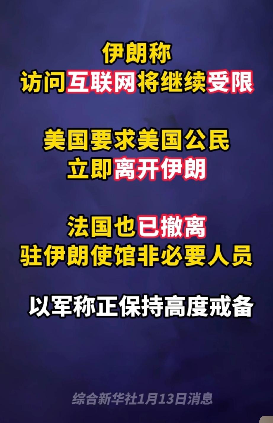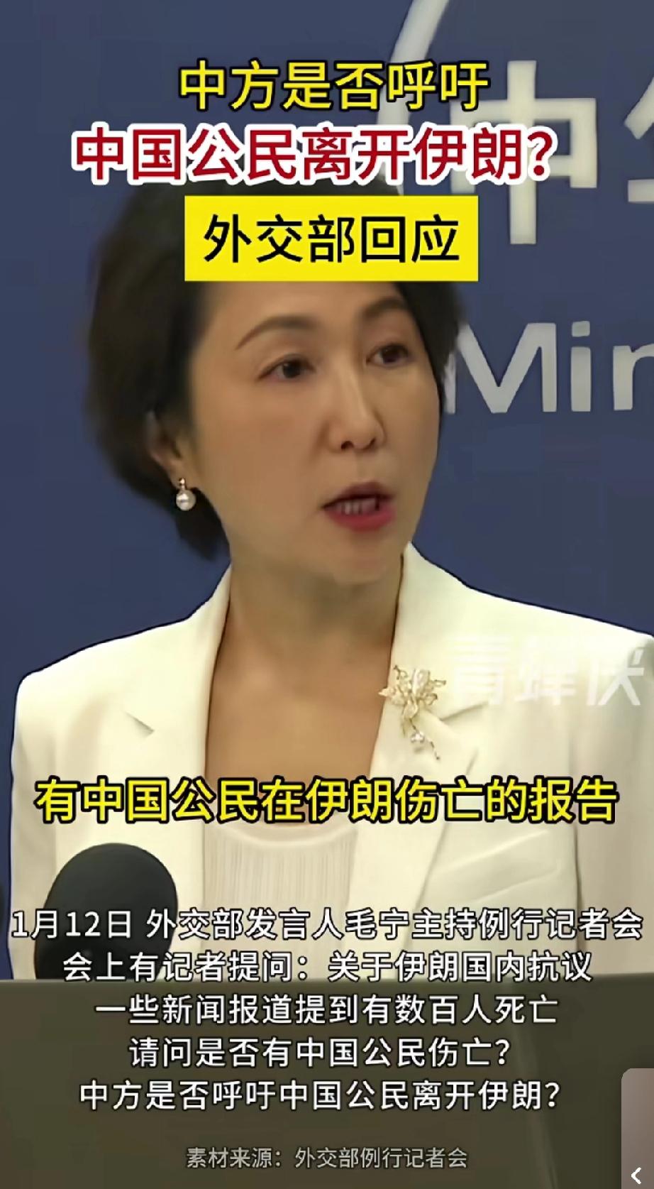 最新消息显示,美国和法国要求本国公民即刻从伊朗撤离。截至目前,尚未收到中国公民在伊朗出现伤亡情况的报告。伊朗是我们的友好国家,不会伤害中国公民。