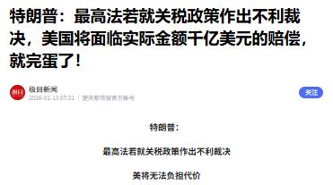 完蛋了!   当地时间1月12日,美国总统特朗普在其社交媒体“真实社交”发文表示,如果美国最高法院出于任何原因做出对美国不利的关税裁决,美国将要面临实际金额数千亿美元的赔偿。   他后面还补了一句更吓人的话:这几千亿只是起步价,真要算上企业因为躲关税砸进去的工厂、设备、供应链调整那些钱,总账能轻松冲到几万亿,他自己都直呼“国家根本付不起”。   这回是真慌了。特朗普从前年上台就开始玩大的,为了兑现“让美国再次有钱”的口号,他直接甩开国会,掏出《国际紧急经济权力法》这把老枪,给全球贸易伙伴来了轮疯狂加税:基准10%,欧盟20%,日本24%,韩国25%,越南直接46%,汽车电脑家电统统没跑掉。   当时在白宫他还拍胸脯说这是美国的“解放日”,现在看简直是给自己挖了个天坑。   钱已经收了一千五百亿左右,可法院要是判这政策违法,这些钱得全部退回去,还得加上利息和赔偿,光是开市客、锐步、都乐这几千家大企业排队等着要钱,就够财政部喝一壶了。   更别提后面那些因为政策翻车被迫关厂、裁员、赔违约金的企业——这笔糊涂账最后都得美国政府埋单。   美财政部早叫苦,说这样搞下去以后谈贸易一点筹码都没了。可美国老百姓更惨,物价已经涨了一大截,摩根大通现在直接把经济衰退概率标到40%。要是真退几万亿,政府要么狂印钞票,要么猛加税,反正最后还是普通人掏腰包。   事情为什么走到这一步?根子还在法律上。美国宪法和最高法院这几年盯得很死:凡是涉及国家经济命脉的“大事情”,总统不能光靠行政令想干就干,必须国会点头才行,2022年那个“重大议题原则”一锤定音,拜登的学生贷款减免计划就是这么被最高法院干掉的。   特朗普偏不信邪,非要拿紧急状态法当收税工具。下级法院早判他违法了,纽约国际贸易法院、联邦巡回上诉法院都说不行,现在球踢到最高法院。1月9日法院突然说先等等再判,这一等直接把特朗普吓得在网上喊“完蛋了”。   国际上更没人给他好脸色。欧盟、加拿大、墨西哥、日韩早放话要反制,德国总理朔尔茨一句话点透:贸易战根本没有赢家,只会把全球经济越撕越碎。美国现在自己陷在法律官司和财政窟窿里,那些被它乱加税的国家,估计正一边喝咖啡一边看戏。   说到底,这就是典型的玩脱了。仗着老大地位到处挥大棒,以为全世界都得捏着鼻子认,结果法律、盟友、市场三面一起给他上强度,从“解放日”到“完蛋了”,一年时间,特朗普把自己的关税神器玩成了一颗定时炸弹。   现在这艘美国大船已经开始剧烈晃动了。船长还在甲板上大喊大叫,船舱里的人却已经开始算计这场海啸到底要让他们赔多少血本。后面几年,这笔账怎么还,恐怕才是真正让所有美国人头大的问题。   麻烦看官老爷们右上角点击一下“关注”,既方便您进行讨论和分享,又能给您带来不一样的参与感,感谢您的支持!