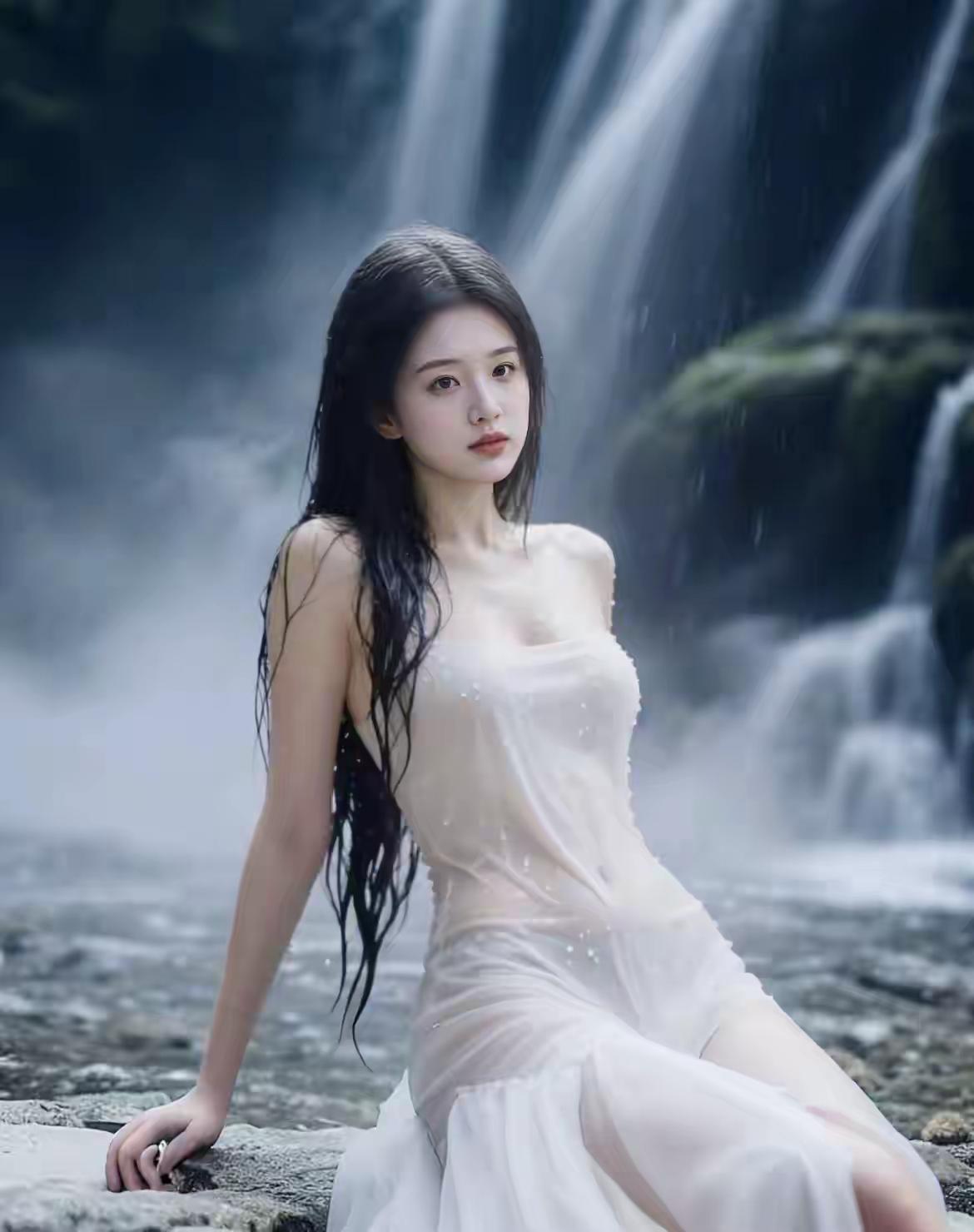 仙气缭绕的瀑布前,一位白衣仙女静坐沉思,宛如梦境。