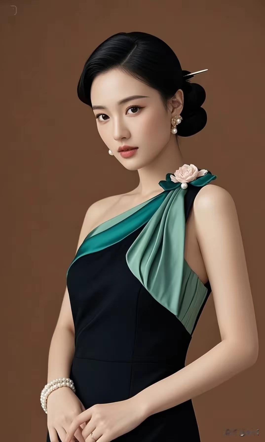 优雅黑裙,绿意披肩,珍珠点缀,尽显东方韵味。