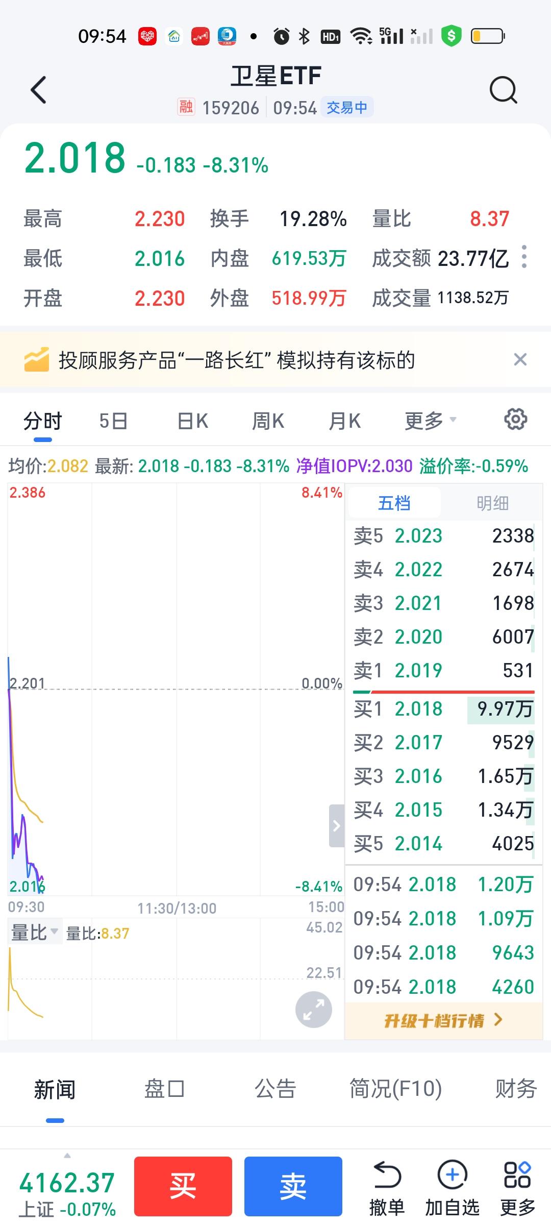 真实情况是这属于明显的超跌了,因为一口气下杀了24亿,下杀了214个基点没有反弹,这个地方放量了就必定会有一次强的反弹,而且股价在2.018这里停留了很长时间,如果在这里买入1万股,20180已经变成21220,1万股也是有21220-20180=1040元利润的。2万股就有2080元利润了,我之前没有底仓今天趁着大跌买进了2000股,也挣了接近200元了。