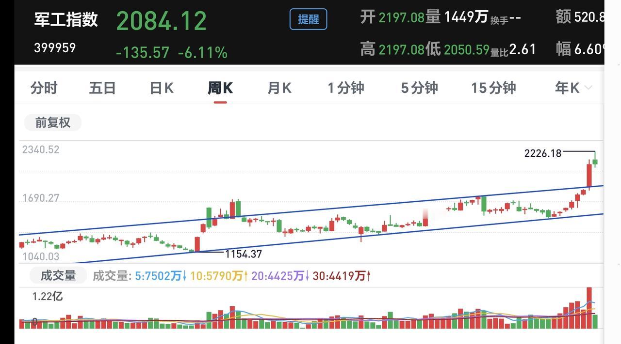 基金:军工板块大跌,究竟应该怎么办 今天下跌幅度排行榜前三位的板块是:军工板块,商业航天板块,可控核聚变板块,军工板块的下跌幅度最大,现在盘中估值下跌了4.86%,持有人数在所有板块中排在第14位,这个板块今天加仓排行榜见下面的截图3,持有人数排行榜见下面的截图4,加仓人数最多的是华夏军工安全灵活配置,持有人数最多的是国泰国证航天军工。 我们来看一下下面的截图5,这是军工板块日K线图,从图中可以看出,我画了两条倾斜向上的斜线,这是军工板块日线级别短期上涨通道,前段时间上涨突破了这个上涨通道的上轨,进入了加速上涨的走势,今天的下跌,只是上涨通道的回归,只是因为远离了上涨通道的上轨,到现在为止,还没有看出这个板块已经走坏。 我们来看一下下面的截图6,这是军工板块周K线图,从图中可以看出,我画了两条倾斜向上的斜线,这是军工板块周线级别上涨通道,上周的上涨突破了这个上涨通道的上轨,本周的震荡还是在这个上涨通道的上方,是一个正常震荡,即使震荡回落到上涨通道内,也还是处于上涨趋势中,只有跌破了这个上涨通道的下轨,才能确定这个板块已经走坏。 进入加速上涨的板块,也会有震荡调整,这样的震荡调整,只是为了降低上涨的速度,并没有改变上涨的趋势,只有上涨趋势被改变的时候,才能考虑要不要止盈出来观望。 我每天都会分享我的观点,我的观点只代表我个人的看法,不能作为你操作的依据,据此操作后果自负。