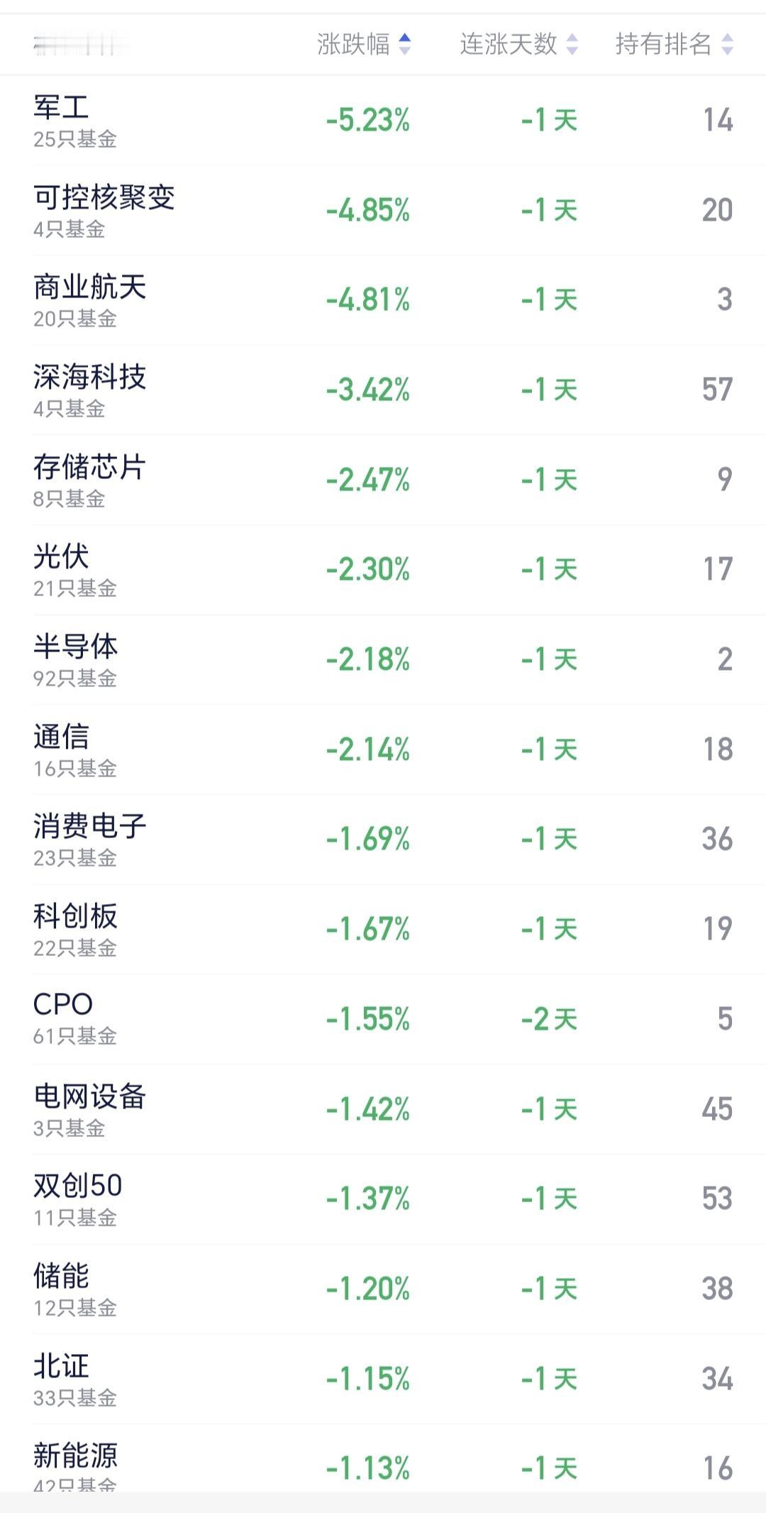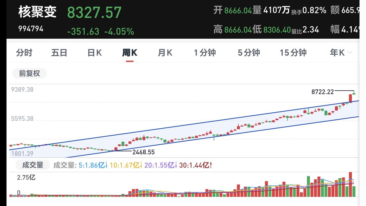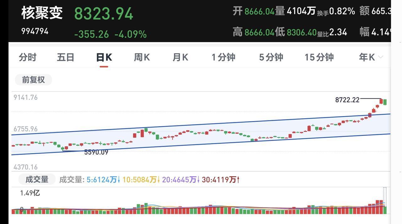 基金:三大指数小幅度下跌,但盘面有一个好现象 三大指数现在都已经翻绿,但下跌幅度都不大,创业板指下跌了0.86%,盘中点位3359点,上证指数下跌了0.21%,盘中点位4156点。 现在两市累计成交19472元,相比于昨天放量了6%,是一个放量下跌的走势,放量下跌一方面说明有人在抛出筹码,另一方面也说明有人在承接筹码,这就是分歧在加大,有人看好后市,有人不看好后市,只要有分歧,就不会有大幅度的下跌。只有在一致性看多或看空的情况之下,才会有大幅度的下跌或者是上涨,现在为止,对盘面的判断是正常的震荡,盘面还有一个好的现象,虽然今天黄色线在蓝色线下方,但黄色线能够跟随蓝色线涨跌,也就是说,蓝色线在上涨的时候,黄色线也能跟随着蓝色线上涨,并没有趴在下方不动,这是一个很好的现象。 今天下跌幅度最大的是军工板块,现在盘中估值下跌幅度超过了5%,还有两个板块下跌幅度超过了4%以上,是可控核聚变板块和商业航天板块,这些板块都是前段时间的热门板块。 可控核聚变板块现在盘中估值下跌了4.91%,他在持有人数排行榜中排名第20位,这个板块今天加仓人数排行榜见下面的截图6,持有人数排行榜见下面的截图7,排名第一的都是永赢制造升级智选混合。 我们来看一下下面的截图8,这是可控核聚变板块日K线图,从图中可以看出,我画了两条倾斜向上的斜线,这是可控核聚变板块日线级别上涨通道,上周三上涨突破了这个上涨通道的上轨,进入了加速上涨的走势,今天的下跌,只是正常的震荡调整,到现在为止,还没有看出这个板块的趋势已经走坏。 我们来看一下下面的截图9,这是可控核聚变板块周K线图,从图中可以看出,我画了两条倾斜向上的斜线,这是可控核聚变板块周线级别上涨通道,上周上涨突破了这个上涨通道的上轨,也就是说,可控核疾病板块周线级别处于加速上涨当中,今天的震荡调整,同样也看不出周线级别的趋势已经走坏。 我每天都会分享我的观点,我的观点只代表我个人的看法,不能作为你操作的依据,据此操作后果自负。
