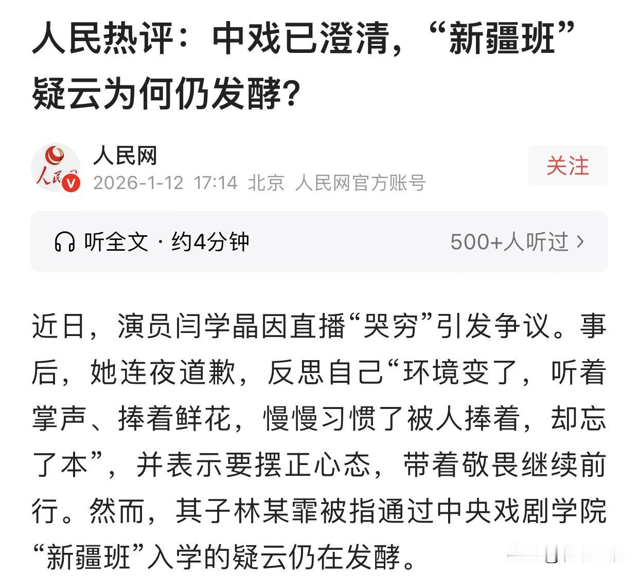 连人民网都看不下去了! 中戏一纸声明,想把“林傲霏新疆班”这事定性为“乌龙”,可网友买账吗?不但不买账,反而越闹越凶! 连人民网都看不下去发文追问:疑云为何仍发酵? 因为这事儿,早已不是林傲霏一个人的事,而是戳中了千千万万普通家庭的肺管子! 说实话,中戏这声明,确实有点“避重就轻”。说2012年没招新疆班,这叫“澄清事实”;但网友要的是啥?要的是林傲霏当年的录取名单、具体分数、资格审核流程!你光说“没走捷径”,但没证明“他是凭真本事考进来的”。 弟弟林傲霏,演技被诟病,却能稳坐中戏科班出身的“铁饭碗”;姐姐林傲雪,也是中戏毕业,现在摇身一变成了文化传媒公司老板。一家俩孩子,全进了这万里挑一的顶级学府,出来一个演戏靠妈,一个转行经商。 林傲霏之前的言论“分低报新疆班”,哪怕是个“口误”,也暴露了一种潜意识:在规则面前,他们似乎总有“别的路子”。这种认知,比单纯的“违规”更让人害怕。因为这意味着,在某些人眼里,高考、艺考这些普通人改变命运的独木桥,不过是他们可以随意切换的“VIP通道”。 我们为什么死磕这件事?因为“新疆班”不仅仅是一个班级,它是国家扶持边疆少数民族人才的专项计划,是关乎民族政策和教育公平的底线。如果连这种带有公益性质的“救命稻草”都被质疑有“特权渗漏”,那老百姓对公平的信任基石,还剩什么?