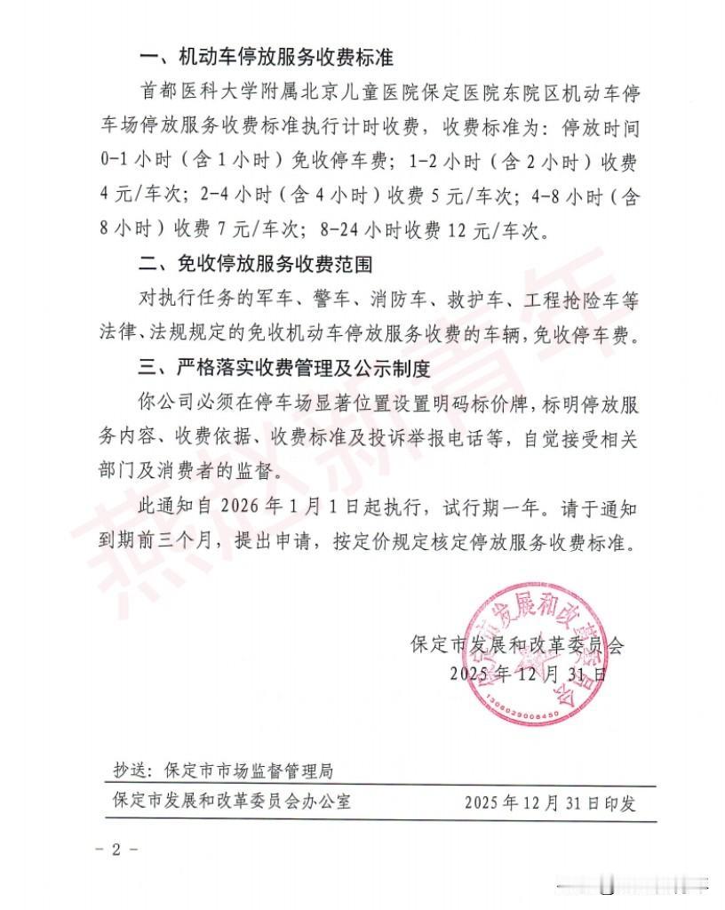 保定北京儿童医院东院区停车收费标准! 收费标准为:停放时间0-1小时(含1小时)免收停车费;1-2小时(含2小时)收费4元/车次;2-4小时(含4小时)收费5元/车次;4-8小时(含8小时)收费7元/车次;8-24小时收费12元/车次。 此通知自2026年1月1日起执行,试行期一年。