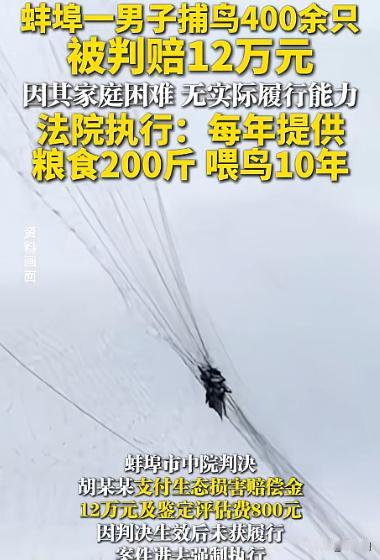 “这才是温情执法!”安徽一男子捕鸟400只,被法院起诉,让他赔偿12万,但是判决下来后,男子却没有执行,法院准备强制执行时,发现男子家确有难处,大女儿正读大学,小女儿无自理能力,每月靠低保,于是,法院让其喂鸟10年来代替赔偿。网友:为什么河南小伙抓鸟被判十年? 老胡今年五十多岁,是村里出了名的老实人。年轻时在外打工,后来身体落下毛病,只能回村务农。 家里条件并不好,大女儿正在外地读大学,小女儿因先天残疾,生活几乎不能自理,一家人的经济来源,主要靠老胡种点地,再加上政府的低保勉强维持。 那几年,村里不少人有捕鸟的习惯。秋冬季节,候鸟迁徙,地里的鸟多了,有人为了防止庄稼被糟蹋,也有人想着抓几只改善伙食。 老胡起初只是零星地抓几只,后来慢慢学会用网,一次能捕到几十只。久而久之,累计下来,竟然抓了将近400只鸟。 事情真正“出事”,是在一次联合巡查中。执法人员在老胡家中发现大量捕鸟工具和已经处理过的鸟类。经鉴定,其中涉及禁止猎捕的野生鸟类。很快,案件被移交法院。 开庭那天,老胡站在被告席上,头一直低着,手指紧张地搓着衣角。他并不懂什么野生动物保护法,在他的认知里,“鸟又不是老虎狮子,地里到处都是”。 可法律并不会因为无知而网开一面。 法院最终判决:老胡非法猎捕野生动物,需承担生态损害赔偿责任,共计12万元。 判决一出,村里炸了锅。12万,对城里人也不是小数目,更何况是靠低保过日子的老胡。判决生效后,他迟迟未能履行赔偿义务。不是不想,而是真的拿不出来。 法院依法启动强制执行程序。执行法官来到老胡家时,看到的是一间老旧的平房,墙角堆着破旧的农具,屋里陈设简单得几乎没有像样的家具。 小女儿坐在床边,目光呆滞,大女儿的录取通知书被整齐地放在抽屉里,那是全家人唯一的“希望”。 执行法官心里也不是滋味。依法办案是一回事,但现实情况同样摆在眼前。多次调查后,法院确认:老胡确实无可供执行的财产,家庭长期处于困难状态。 最终,法院作出了一项罕见却合乎情理的执行方案——生态修复替代赔偿。 老胡不用一次性拿出12万元,但要连续10年参与当地野生鸟类保护工作:喂鸟、巡护、记录鸟类活动、协助宣传野生动物保护知识。 每一项工作都有考核,一旦敷衍或中断,仍将恢复金钱赔偿。 判决公布后,舆论迅速发酵。很多网友表示理解:“法律有温度”“罚的是行为,不是把人逼上绝路”。也有人质疑:“抓了400只鸟,凭什么不坐牢?” 就在讨论声最激烈的时候,有人提起了另一个案件——河南小伙闫啸天。 “同样是抓鸟,为什么他被判了十年?” 这一对比,让不少人觉得“不公平”。可事实,远比一句“抓鸟”复杂得多。 闫啸天并不是普通意义上的捕鸟者。他早年混迹社会,通过网络结识了一伙专门从事非法狩猎、买卖野生动物的人员。这不是一时兴起的行为,而是一条完整的黑色链条。 他们分工明确:有人负责踩点,有人负责捕猎,有人负责运输,有人专门在网上联系买家。闫啸天正是其中的核心成员之一。 他们猎捕的对象,也远不止麻雀、斑鸠这类常见鸟类,而是包括猫头鹰、红隼等国家重点保护鸟类。 更严重的是,为了提高效率,他们非法持有、使用枪支进行猎捕,造成的生态破坏难以估量。 警方在侦查中发现,闫啸天不仅多次参与猎捕,还长期在网络平台兜售野生鸟类,非法获利数额巨大。他的行为,已经从“违法”上升到了“犯罪产业化”。 最终,法院以非法猎捕、杀害珍贵濒危野生动物罪、非法买卖野生动物罪、非法持有、使用枪支罪等数罪并罚,判处其有期徒刑十年。 如今,老胡每天都会到村边的林地里,给鸟投食、清理捕鸟网、提醒村民不要再随意猎捕。他常说一句话:“以前不懂事,现在才知道,这些鸟活着,比被抓了值钱。” 而那片林子里,鸟鸣声,似乎也比从前更热闹了。
