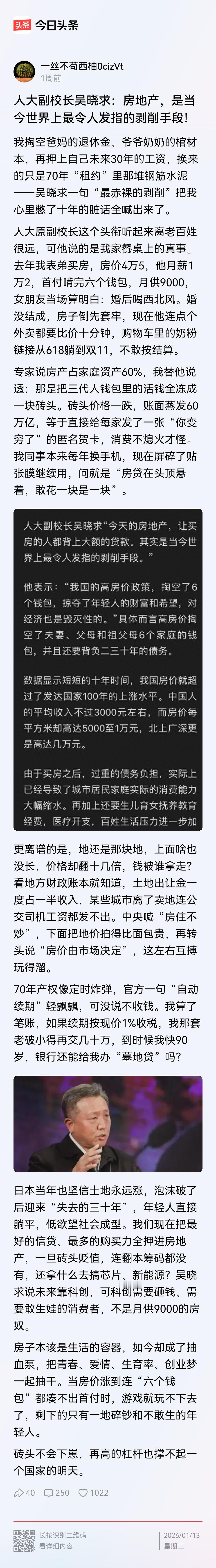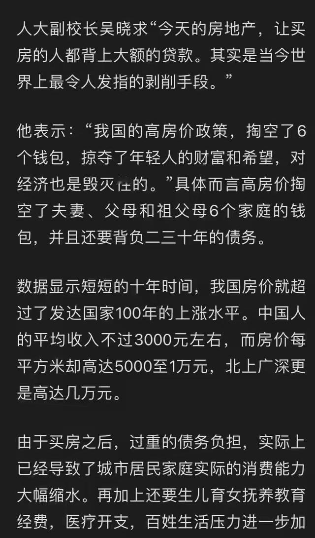 人大副校长吴晓求:房地产,是当今世界上最令人发指的剥削手段!这话是不是他说的? 其实不是他说的。吴晓求本人在2023年3月29日搜狐商学院的采访中已郑重澄清,该言论是被他人强加,既不符合其语言风格,也缺乏逻辑。 只是他确实谈过房地产相关问题,核心观点是:中国房价快速增长给年轻人带来沉重负担,房地产曾被过度金融化,政策波动过大,应稳定预期,回归居住属性。 你怎么看?