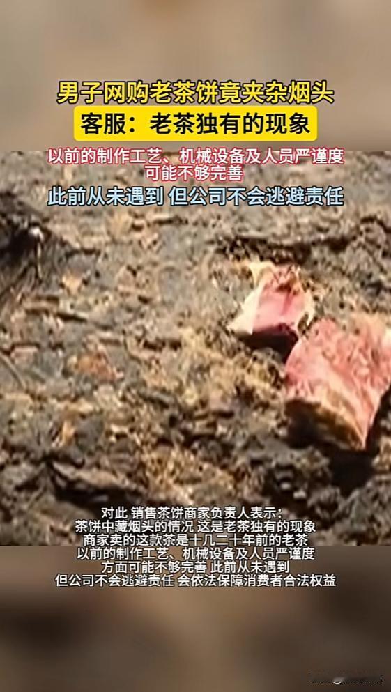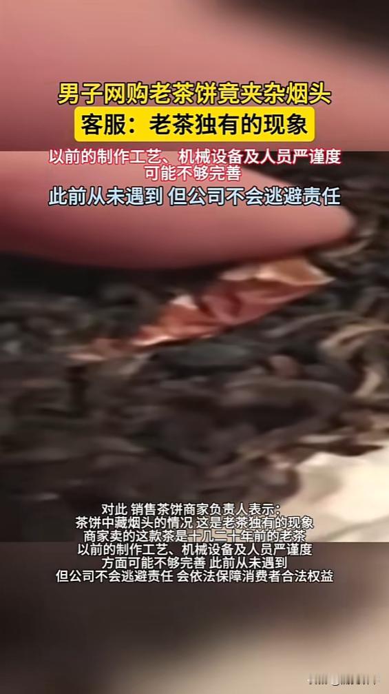 “喝茶人天塌了!”近日,广东肇庆,一男子拆开两年前买的茶饼时,发现里面竟藏着一根吸剩的烟头!这让男子非常恶心,觉得别人吸过的,上面肯定还沾着口水,结果质问客服时,对方却称这是老茶独有现象,代表这茶饼货真价实!网友:说这话笑了没! 根据1月11日的媒体报道,这位茶友算是资深爱好者,两年前网购这款茶饼时,就是看中它耐储存的特点,收货后便妥善存放,一直没拆封。 直到最近想好好品一品,刚撕开外层包装,一根明显吸过的烟头就掉了出来。烟蒂上的污渍清晰可见,原本期待品茶的雅致瞬间消失,只剩下阵阵恶心。 他第一时间联系商家客服讨说法,可对方的回应完全超出预期。没有道歉,没有解释,直接抛出“老茶独有现象”的说法,坚称这代表茶饼是真的。 茶友当场反驳这就是卫生不过关,客服却始终不肯松口,坚持自己的奇葩观点。这样的沟通自然没结果,无奈之下,他只能向相关监管部门投诉。 投诉初期,商家还拖着不处理,拒绝赔偿。直到负责人出面,才正式向茶友道歉,承诺不会逃避责任,这事儿才算有了初步进展。 可能有不了解茶饼制作的朋友会好奇,茶饼里真能出现这种异物吗?其实从专业角度说,正规茶饼生产有严格的卫生要求。 根据国家相关标准,茶叶原料里不能有非茶类夹杂物,生产场地要远离污染源,加工、仓储环节都得保持清洁干燥。烟头出现在茶饼里,明显是某个环节的卫生管控出了大问题。 客服所谓的“老茶独有现象”,纯属无稽之谈。老茶的价值在于陈化后的口感和香气,从来不是靠脏东西“证明”真伪。这种说辞,本质上就是想逃避责任的搪塞。 有经常买茶的网友留言说,自己也遇到过茶叶里有杂质的情况,比如小石子、草叶,但烟头这种明显人为污染的,还是第一次见。“这已经不是工艺问题,是态度问题了。” 还有网友吐槽,客服的说法简直是把消费者当傻子。“要是脏东西能代表货真价实,那是不是以后买食品,还得先找有没有异物?” 更理性的网友则提醒大家,遇到这种情况别慌,也别跟客服过多纠缠。保留好包装、异物、聊天记录这些证据才是关键,第一时间找监管部门投诉比跟商家扯皮有效得多。 其实不止茶叶,任何食品都可能出现类似问题。比如之前曝光过的零食里有毛发、罐头里有异物等,很多商家第一反应都是推卸责任,要么说消费者故意找茬,要么编离谱的借口。 这时候就需要明确,根据食品安全法,消费者遇到不符合卫生标准的食品,有权要求赔偿。生产经营不符合安全标准的食品,消费者除了要求赔偿损失,还能要求支付价款十倍或者损失三倍的赔偿金。 而且维权时不用怕麻烦,现在监管部门的投诉渠道很畅通,线上线下都能提交材料。只要证据齐全,监管部门介入后,商家基本都会主动配合处理。 回到这次的茶饼事件,商家最后道歉赔偿是应该的,但更重要的是,其他商家能不能引以为戒?毕竟食品安全不是小事,一次不负责任的操作,毁掉的可能是多年积累的口碑。 网友的评论里,有句话说得很实在:“入口的东西,卫生是底线。连底线都守不住的商家,再便宜也不能买。” 你有没有遇到过食品里有异物的情况?当时是怎么处理的? 如果遇到类似的奇葩借口,你会直接投诉还是跟商家协商?欢迎在评论区分享你的经历和看法,给其他朋友提个醒。 信息来源:《男子网购老茶饼竟夹杂烟头,客服:老茶独有的现象》半岛晨报
