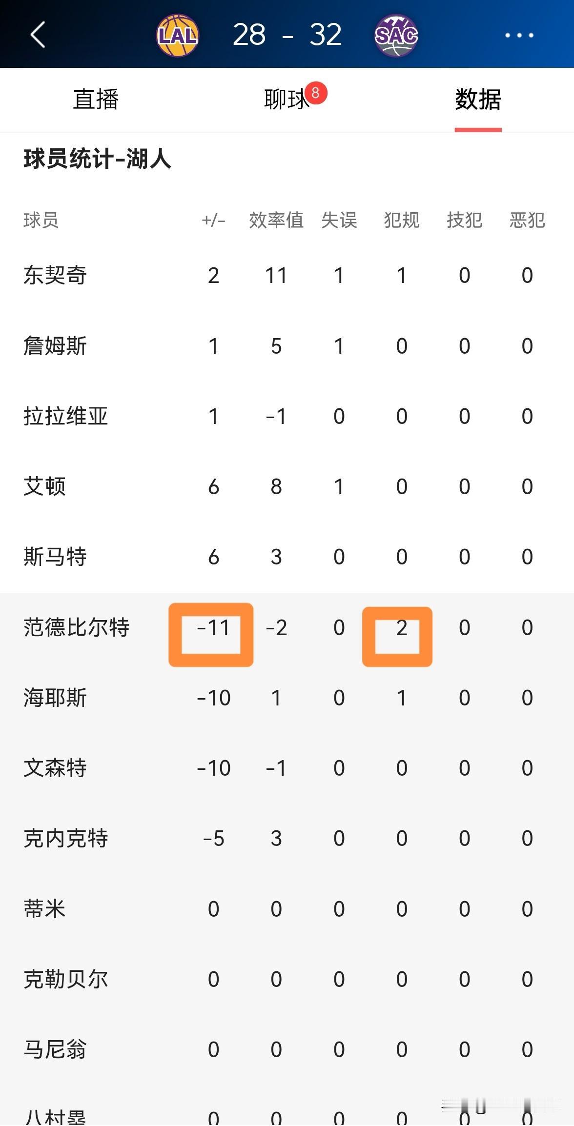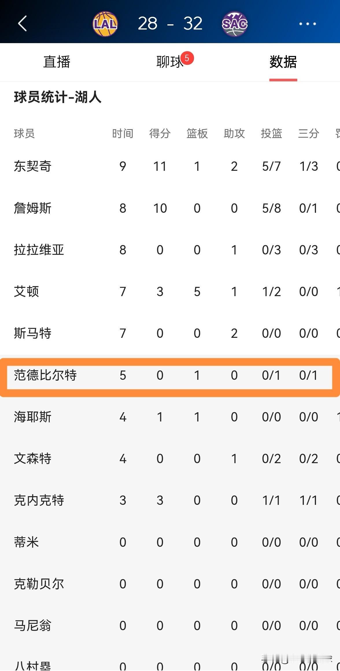 我强烈建议湖人主帅雷迪克弃用范德比尔特!在今天进行的湖人和国王的比赛中,目前双方的首节比赛已经结束,湖人以28:32落后对手4分。在第一节比赛中,范德比尔特将“糟糕透顶”演绎的淋漓尽致,他在替补出战的5分钟里,投篮1中0怒砍0分,却有2次犯规,他的场上正负值为全队最低的-11。 如果湖人想要赢下本场比赛,那么雷迪克教练必须弃用范德比尔特,以范德比尔特目前的糟糕状态来看,他完全不适合打比赛。