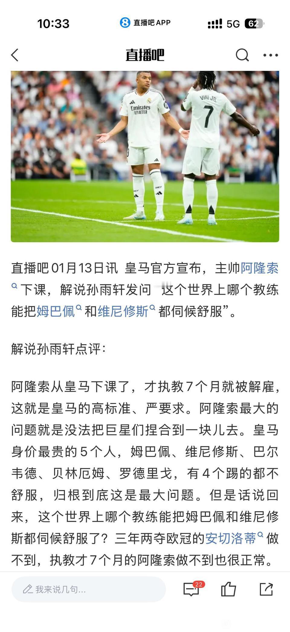 有人问,世界上谁能把姆巴佩和威尼修斯都伺候舒服? 安切洛蒂下课,阿隆索也下课了。 一个球队只能有一位核心球员,以前C罗是老大,走了之后本泽马才拿金球奖。 再这样下去皇马得二选一!感觉会留姆巴佩,出售威尼修斯。[可怜]